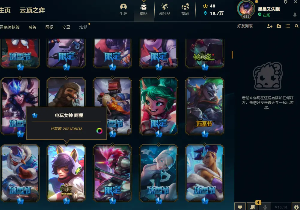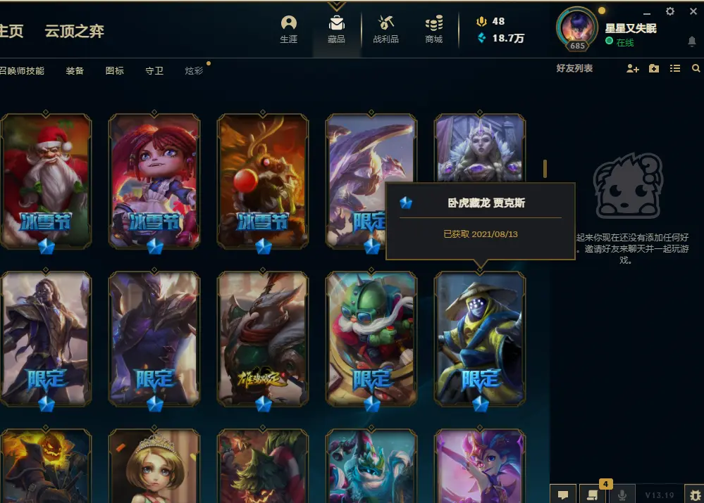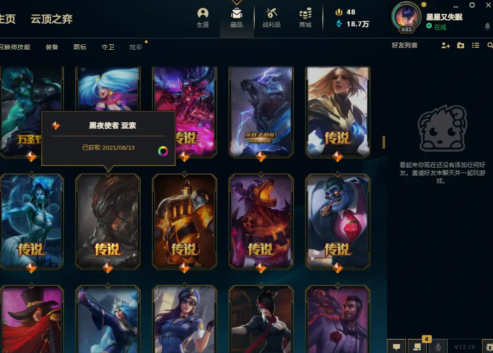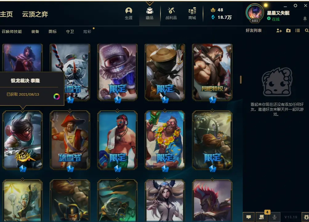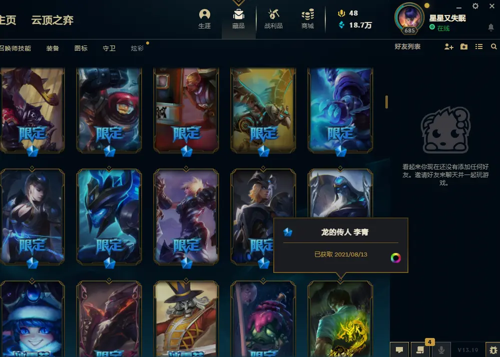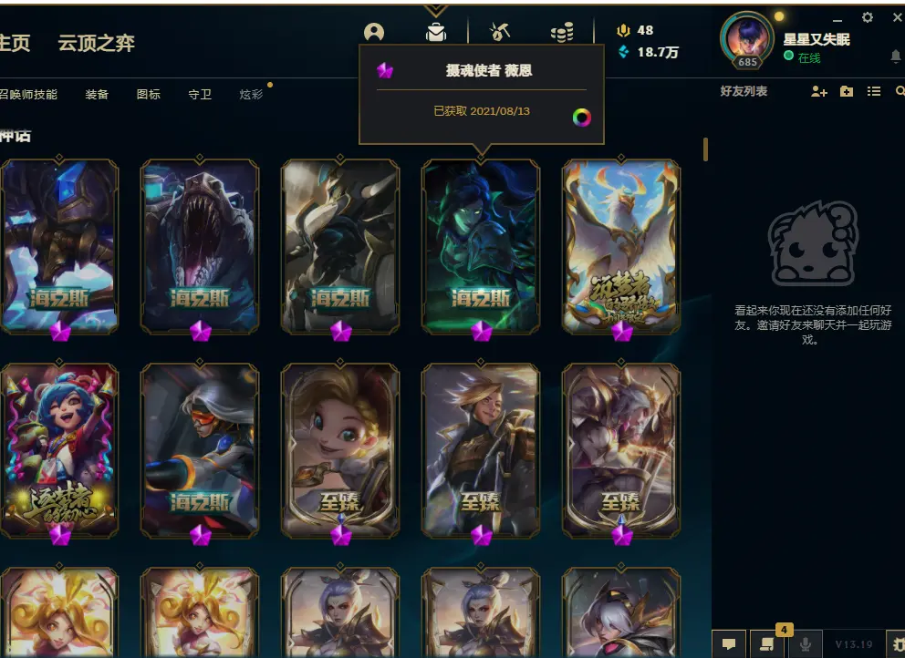 全英雄〓1300皮肤〓龙瞎〓可排位〓至臻神话海克斯套〓摄魂VN〓创战纪〓黑夜〓卧虎藏龙〓龙刀IG卡莎
