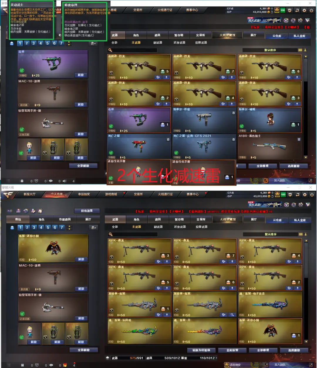 排位:可以----------------生化四防全装(变更生化背包 、查看生化僵尸血量):无需换弹、6盘6烈、炼狱小刚、斯太尔蝴蝶、死亡之眼、MAC-涂鸦、手斧镜、2个生化减速雷、超级对讲机、全部弹匣、、、、、、、、、爆破四防全装:幻神音效(巅峰荣耀)、USP雷暴、星神、QBZ-天罚、白虎之魄、白虎、QBZ-金色蔷薇、金色蔷薇空、、、幻神音效、蔷薇音效、毁灭音效、雷神音效、黑龙音效、火麒麟音效、黑骑士音效、、、2套雷霆、1套雷暴、1套夜魔、2套神工天巧、1套云龙、、、生化四防(暗夜审判、灵动武士)爆破四防(王者闭月羞花、王者空、鹰女主播)、
