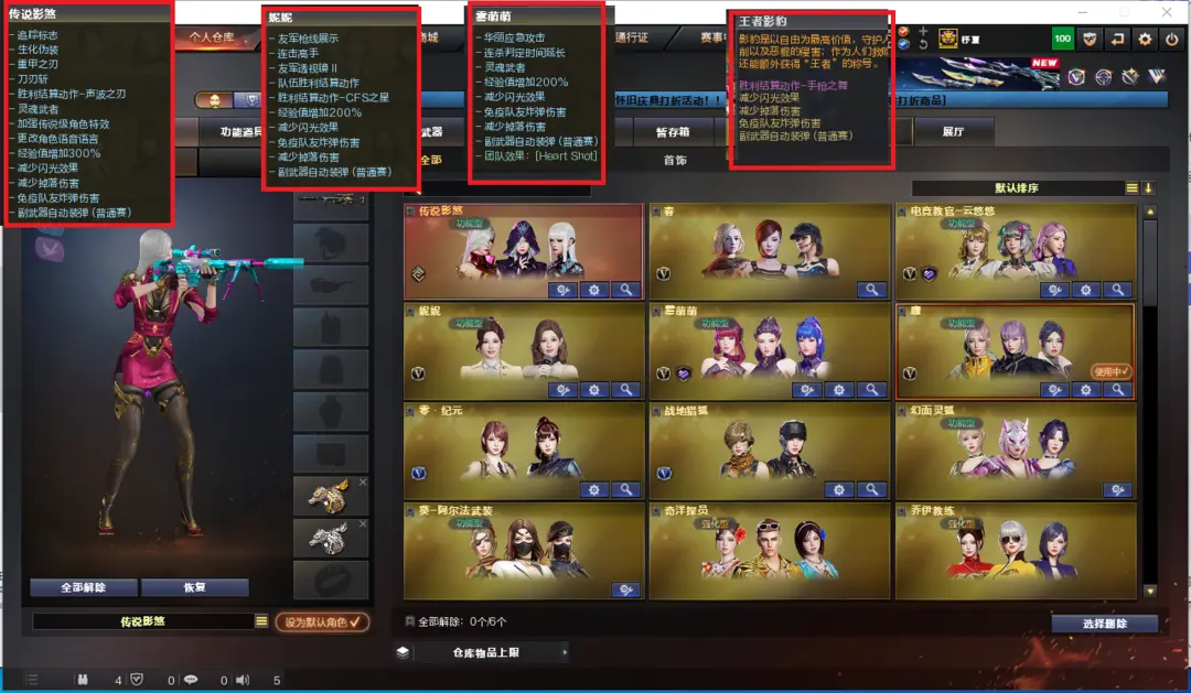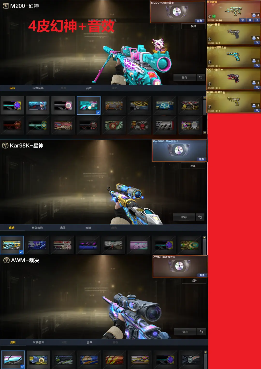 排位:可以、、、、、、、、、、、爆破四防:幻神4皮+音效(传奇欧欧、宠儿、巅峰荣耀、白鲨皮肤)、98K星神、王者星神、、、、、传说破晓、USP雷暴、USP雷暴王者、COP堕天神、冠军之特、、、、、、加利尔-天袭、传说辉光、FAMAS G2-天戎、QBZ金色蔷薇、白虎、炽芒蝶刃、、、幻神音效、裁决音效、蔷薇音效、白虎音效、毁灭音效、天罚音效、黑骑士音效、、、7套雷暴、、、爆破四防(传说影煞、妮妮、云悠悠、雾萌萌、鹰、王者影豹)