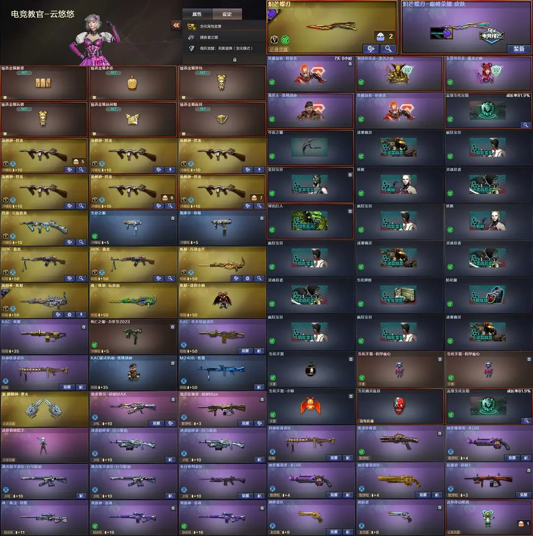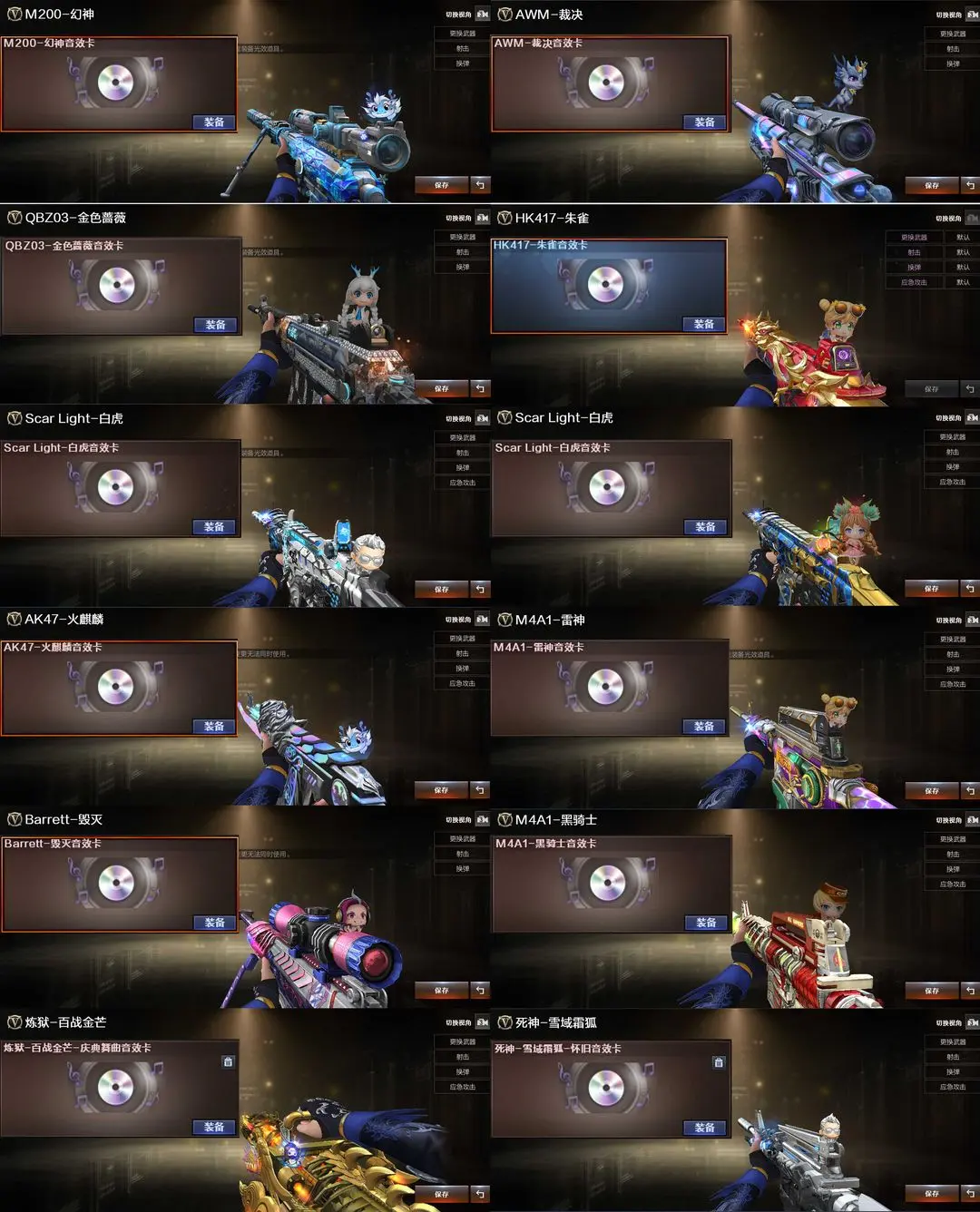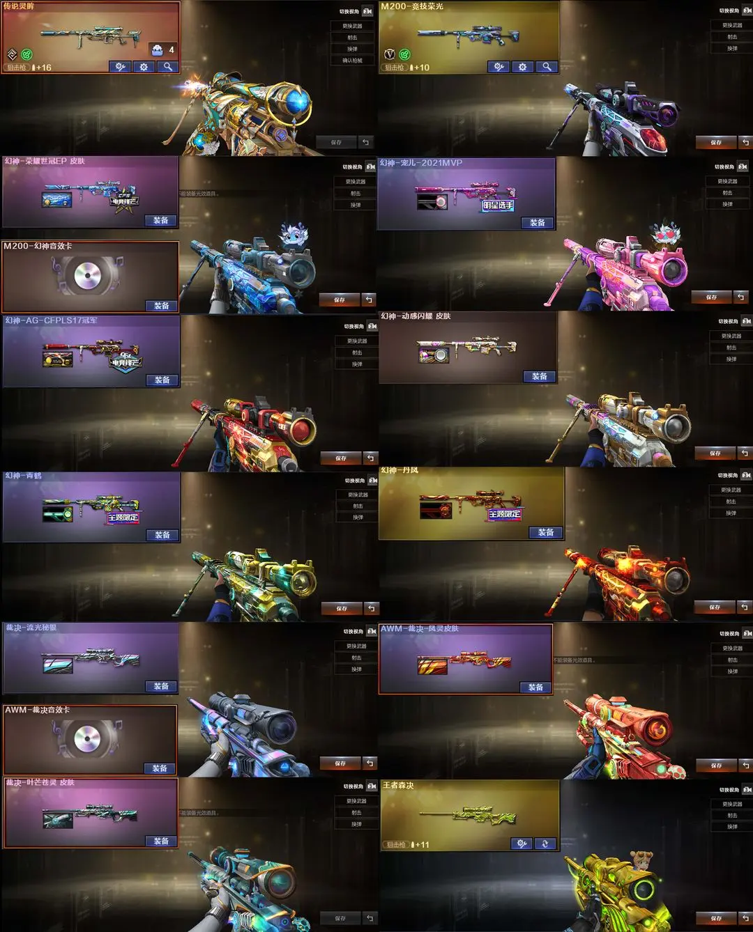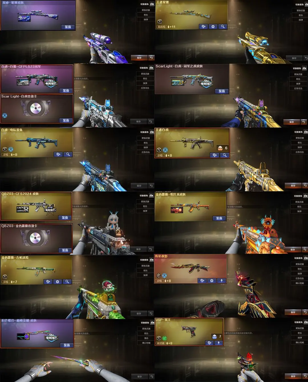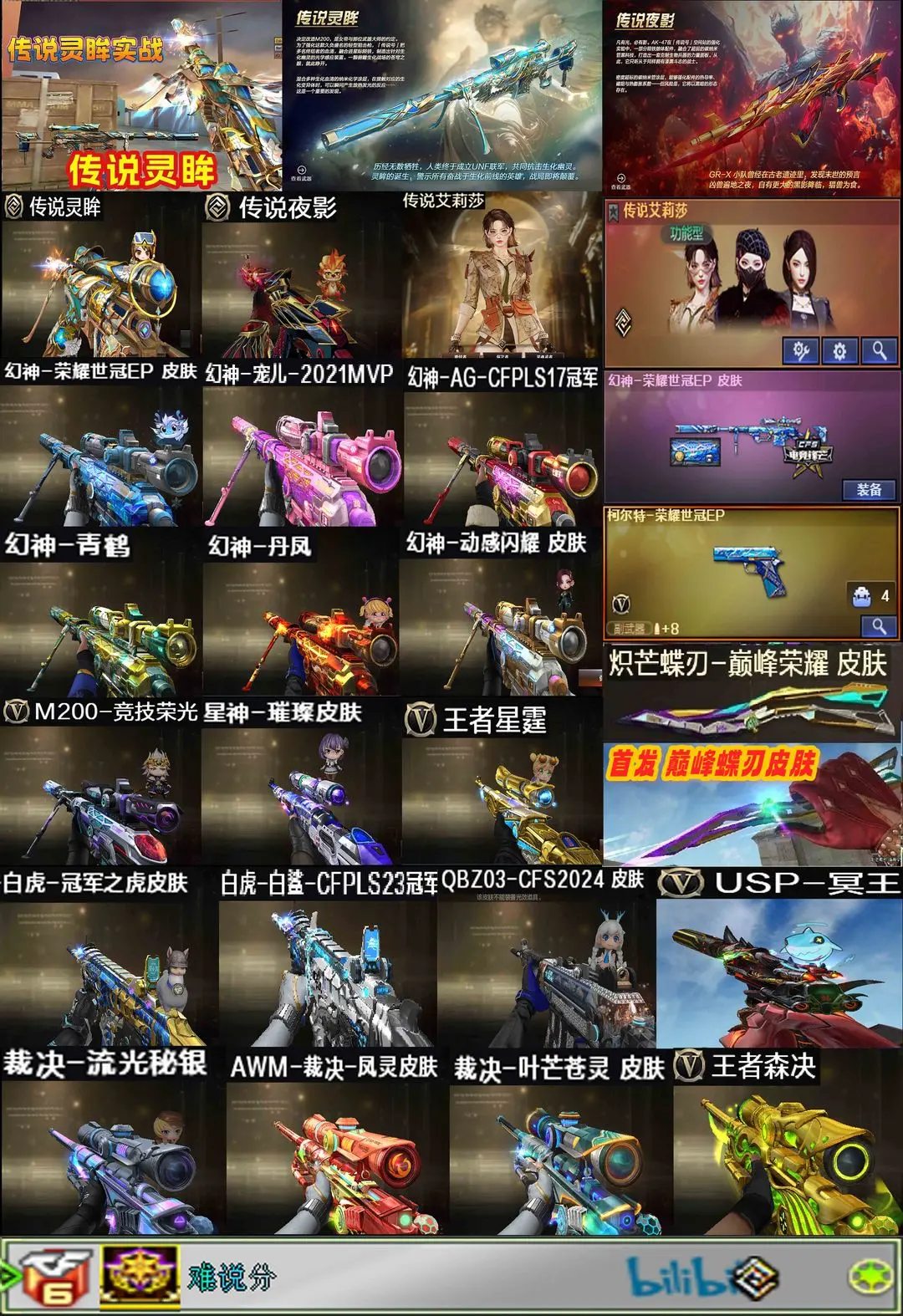 【装备道具】:B站名片★传说艾莉莎/传说夜影/传说灵眸★幻神-荣耀世冠EP 皮肤/幻神-动感闪耀 皮肤/幻神-宠儿-2021MVP/幻神-AG-CFPLS17冠军/幻神-青鹤/幻神-丹凤/星神-璀璨/裁决-运输船 皮肤/裁决-叶芒苍灵 皮肤/裁决-流光秘银/AWM-裁决-凤灵/白虎-白鲨-CFPLS23冠军/ScarLight-白虎-冠军之虎/QBZ03-CFS2024/雷神-巅峰荣耀/雷神-航星/雷神-传奇N9/雷神-荣耀之魄//金色蔷薇-纸灯龙炽芒蝶刃-巅峰荣耀/屠龙-巅峰荣耀/★王者星霆/炽芒蝶刃/柯尔特-冠军之特(2)/柯尔特-竞技荣光/USP-雷暴/柯尔特-荣耀世冠EP/USP-冥王/M200-幻神/M200-竞技荣光/王者森决-觉醒版/雷霆王者-觉醒版/★竞技荣光套装/雷霆王者套装/臻选金狐套装/炼狱-迷你小钢/炫/雨棠/电竞教官-云悠悠/司雨/炼狱-百战金芒/王者白虎/白虎电玩/幻神音效卡/金色蔷薇音效卡/白虎音效卡/朱雀音效卡/雷神音效卡/黑骑士音效卡/火麒麟音效卡/毁灭音效卡/裁决音效卡/炼狱-百战金芒-庆典舞曲音效卡/6烈龙炼狱盘龙生化
