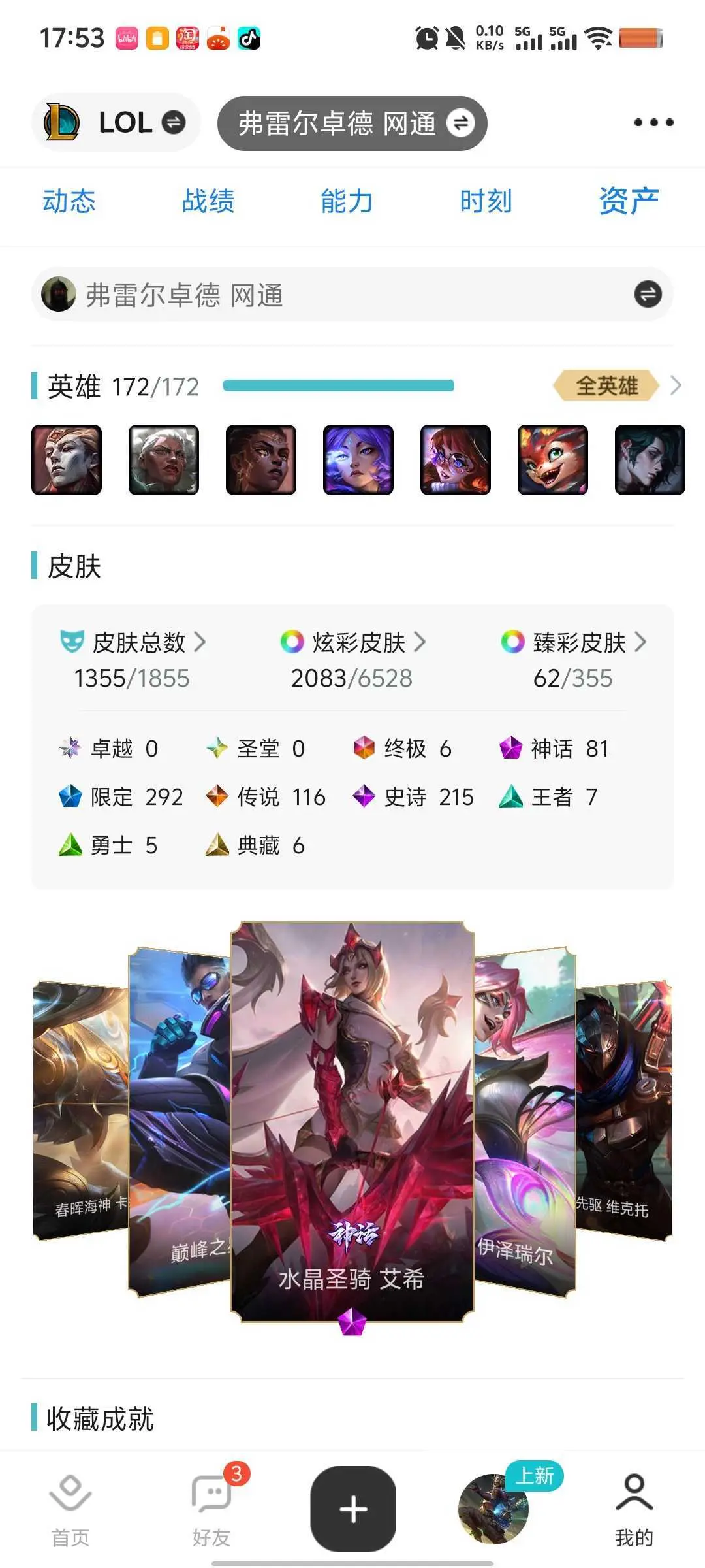 本号在网通三区弗雷尔卓德,已更新最新女帝女枪和格温、战斗公主、至臻永恩烈娜塔,玉剑仙宫,黎明,至臻花仙子卡特,怪兽来了宝典,花仙子通行证,至臻圣堂女枪,绝息圣堂吸血鬼和大虫子,兔年限定至臻北极星狼人至高天奎桑提,至臻莲华剑圣,灰烬塞拉斯潘森派克,至臻风女,钢铁瓦尔基里圣枪和卡米尔,至臻艾克和辛德拉,星守吞噬大礼包,海之歌永恩、泽丽,艾希、豹女和至臻海之歌歌女`EDG冠军限定大礼包、小蜜蜂、泽丽、烈娜塔新皮肤、虎年限定大礼包,开通小蜜蜂宝典、青花瓷通行证,云顶宝典,福星计划,各种新皮肤畅玩,排位请不要逃跑挂机送人头,否则拉黑严重会追诉,信誉分不足会不准排位,够了再开,理解你我他。,炫彩加皮肤一共3438个,实际上1355个皮肤2083个炫彩,毒液蛮王,蛮王奥斯曼大帝,王国机甲至臻盖伦、黑牛的传人,黑篮龙瞎,一代至臻卡莎阿卡丽,海克斯牛头,大嘴,小炮,猪妹,阿木木,龙龟,卡萨丁,乌鸦。。。还有各种冠军限定炫金,冰雪节炫金 ,龙蛇马羊猴鸡狗年限齐全,金克丝神龙烈焰炫彩齐全。泳池派对齐全.动动您发财的小手点一下收藏,好运到来不迷路ヾ(❀╹◡╹)
