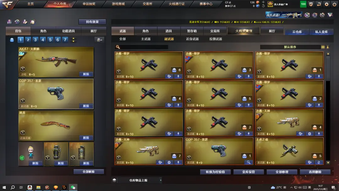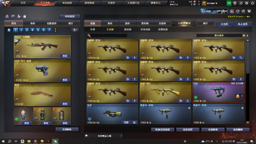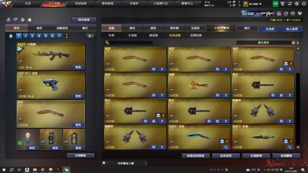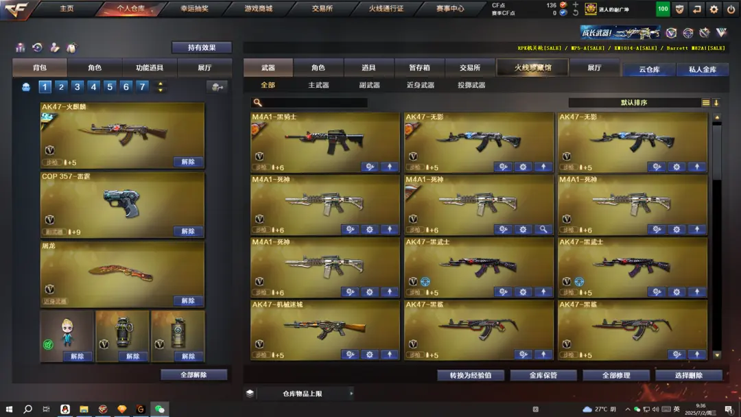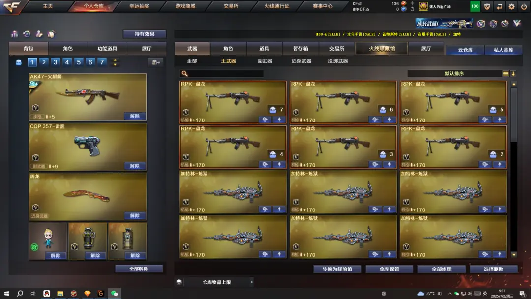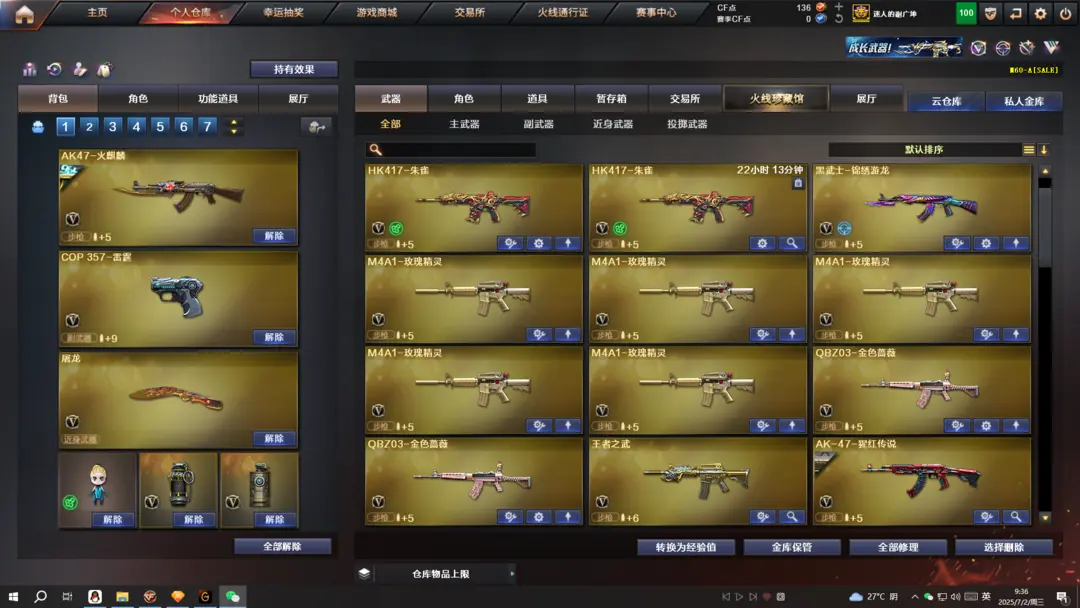 本游戏账号:英雄武器107个; 王者武器35个。 装备不多,但是主武器、副武器、近身武器够用 拥有完美游戏体验。重要的是,特殊装备有:HK417-朱雀、M4A1-玫瑰精灵、M4A1-黑龙、QBZ03-金色蔷薇、Barrett-毁灭、AA-12-雷霆、雷霆之契、雷霆之锋、麒麟刺、AK47-黑武士、加特林-炼狱、AWM-天龙、M4A1-黑骑士、AK47-火麒麟、M4A1-雷神、王者之武-觉醒版、炫金毁灭、王者之魂、王者之势、炫金黑龙、王者之心、炫金雷神、王者之怒、炼狱-悦蓝、玫瑰精灵-悦动、王者之光、王者之幻、王者之魄、王者之刺、超新星-悦享、王者之戮、王者之击、雷霆-β、堕天使、王者-零、王者之瞳、圣诞潘多拉-X、生化弹匣、王者之心金色光效、王者之魄金色光效、等,随意畅选。