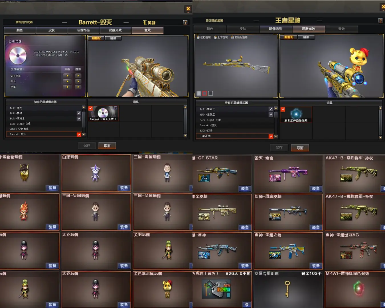 【稀有武器道具】王者星神,传说光耀,M200幻神(周瑜皮肤),雷神荣耀之魄,雷神荣耀世冠ag皮肤,王者幻神,白虎,毁灭(耀金皮肤),王者之决,幻灵套装,雷暴套装,雷暴usp,幻灵cop,人物四防王者涂鸦,四防影豹,斯太尔蝴蝶+6烈龙,6盘龙《幻神,白虎,毁灭,雷神,火麒麟,黑骑士6音效卡》