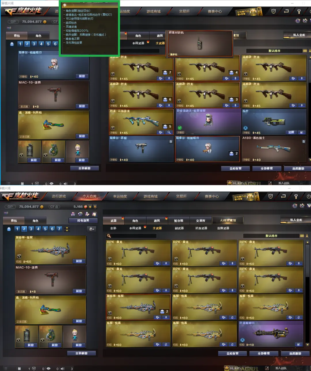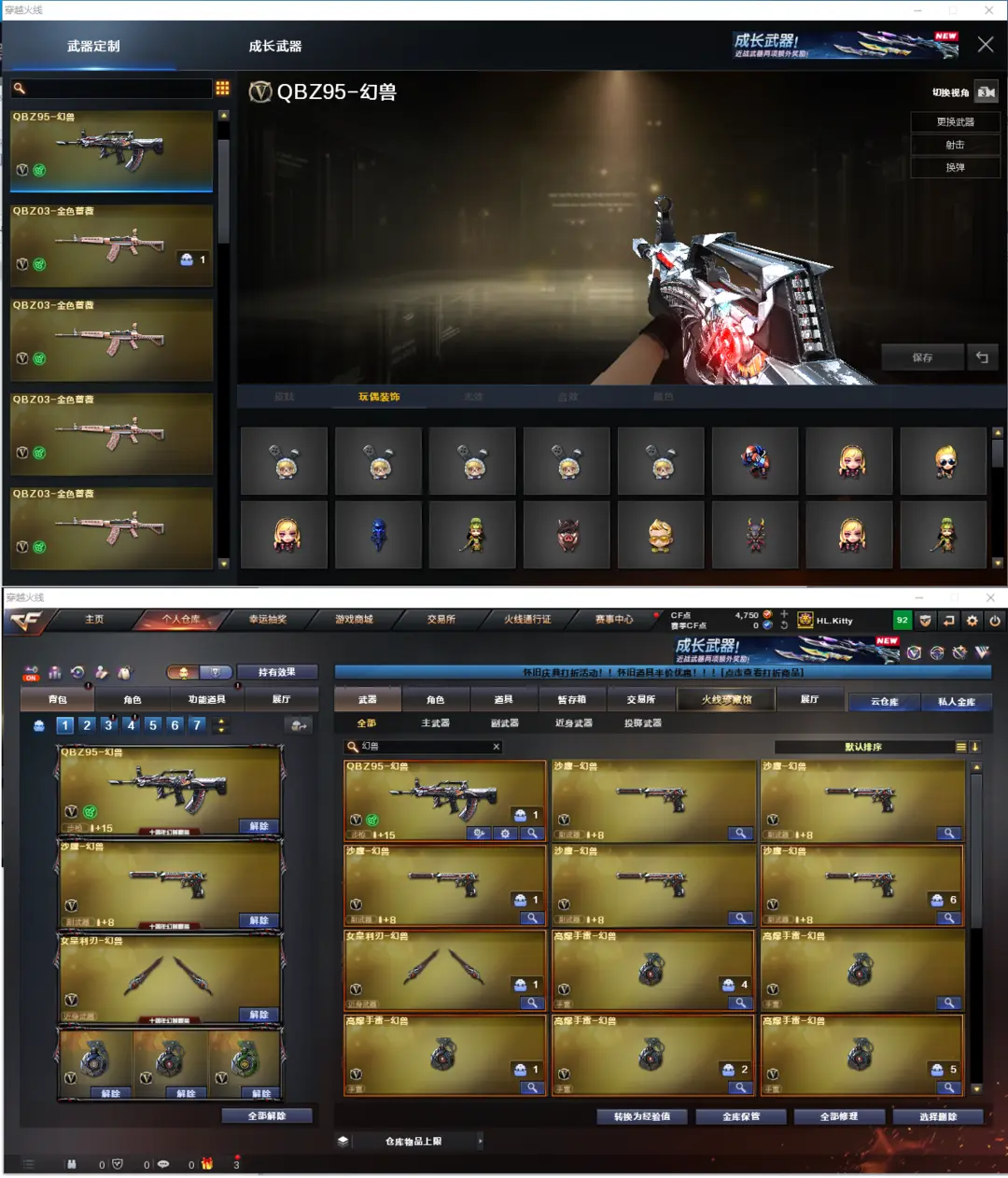 排位:可以、、、、、、、生化四防全装(可以变更背包、查看生化僵尸血量):无需换弹、6烈龙、6盘龙、4炼狱、清道夫-小人枪、斯太尔枪娘暗刃、异变清道夫小人枪、双面神、死亡之眼、MAC涂鸦、手斧镜、3个生化减速雷、超级对讲机、、、、、、、爆破四防:幻神(白鲨皮肤)、M200-竞技荣光、、、、破空枪刃、5个幻兽沙鹰、QBZ幻兽、白虎、QBZ金色蔷薇、、、雷神音效、极光音效、火麒麟音效、黑骑士音效、、、5套幻兽、2套雷霆、1套堕天神、3套竞技荣光、1套玄豹、、、生化四防(隼、鹰、嘉年华灵狐)、爆破四防(云悠悠、职业经理)
