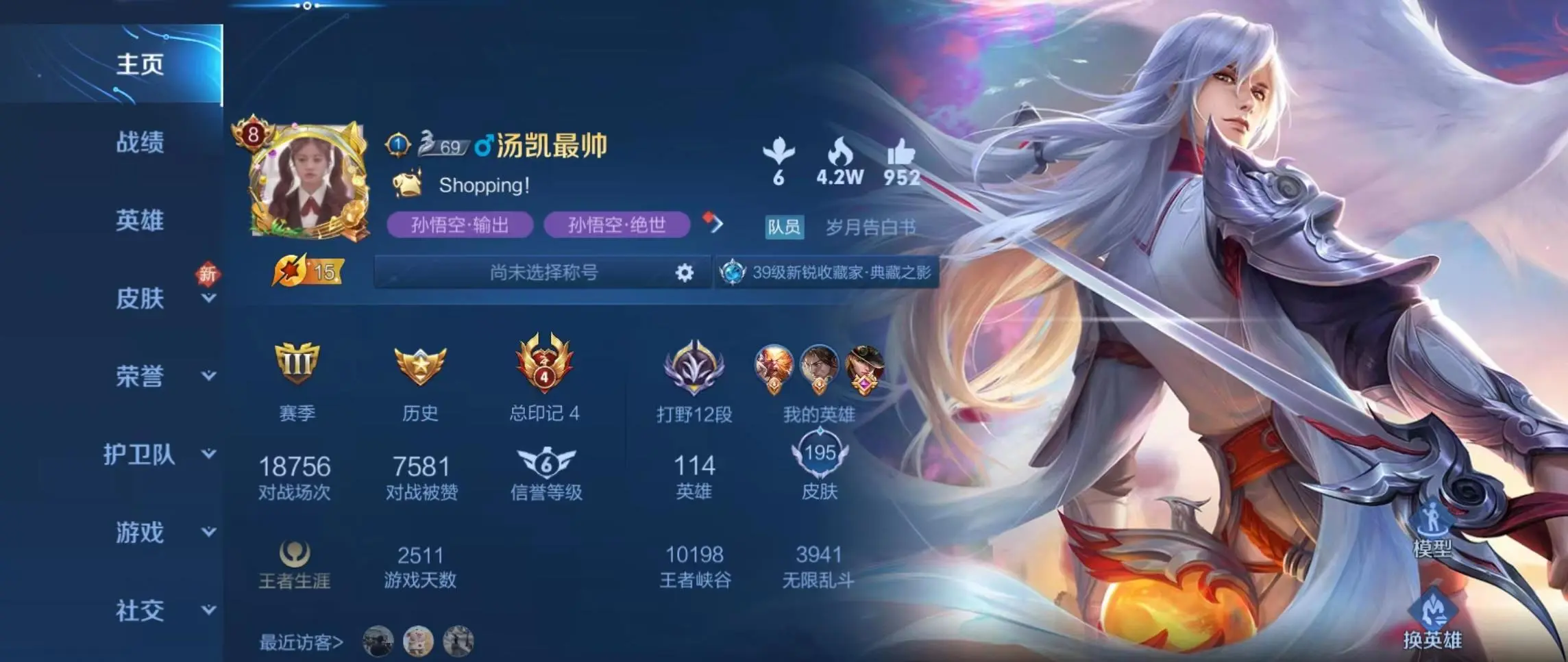 本游戏账号: V3用户,基础段位:永恒钻石V,英雄多,皮肤多。典藏皮肤2个,感受典藏皮肤带来的优质体验快感, 私人所属英雄皮肤有:孙尚香 杀手不太冷||小乔 天鹅之梦孙尚香 末日机甲||宫本武藏 地狱之眼||李白 凤求凰||武则天 海洋之心||貂蝉 仲夏夜之梦||虞姬 启明星使上官婉儿 梁祝||孙膑 妖精王||鲁班大师 乓乓大师||狄仁杰 阴阳师||狄仁杰 魔术师||达摩 沙漠行僧||项羽 霸王别姬||项羽 海滩派对||桑启 海盐诗旅||貂蝉 逐梦之音||韩信 逐梦之影||王昭君 凤凰于飞||孙悟空 至尊宝||孙悟空 美猴王||虞姬 霸王别姬||明世隐 疑决卦||小乔 纯白花嫁||裴擒虎 李小龙||赵云 皇家上将||米莱狄 御霄||盾山 圆桌骑士,等等