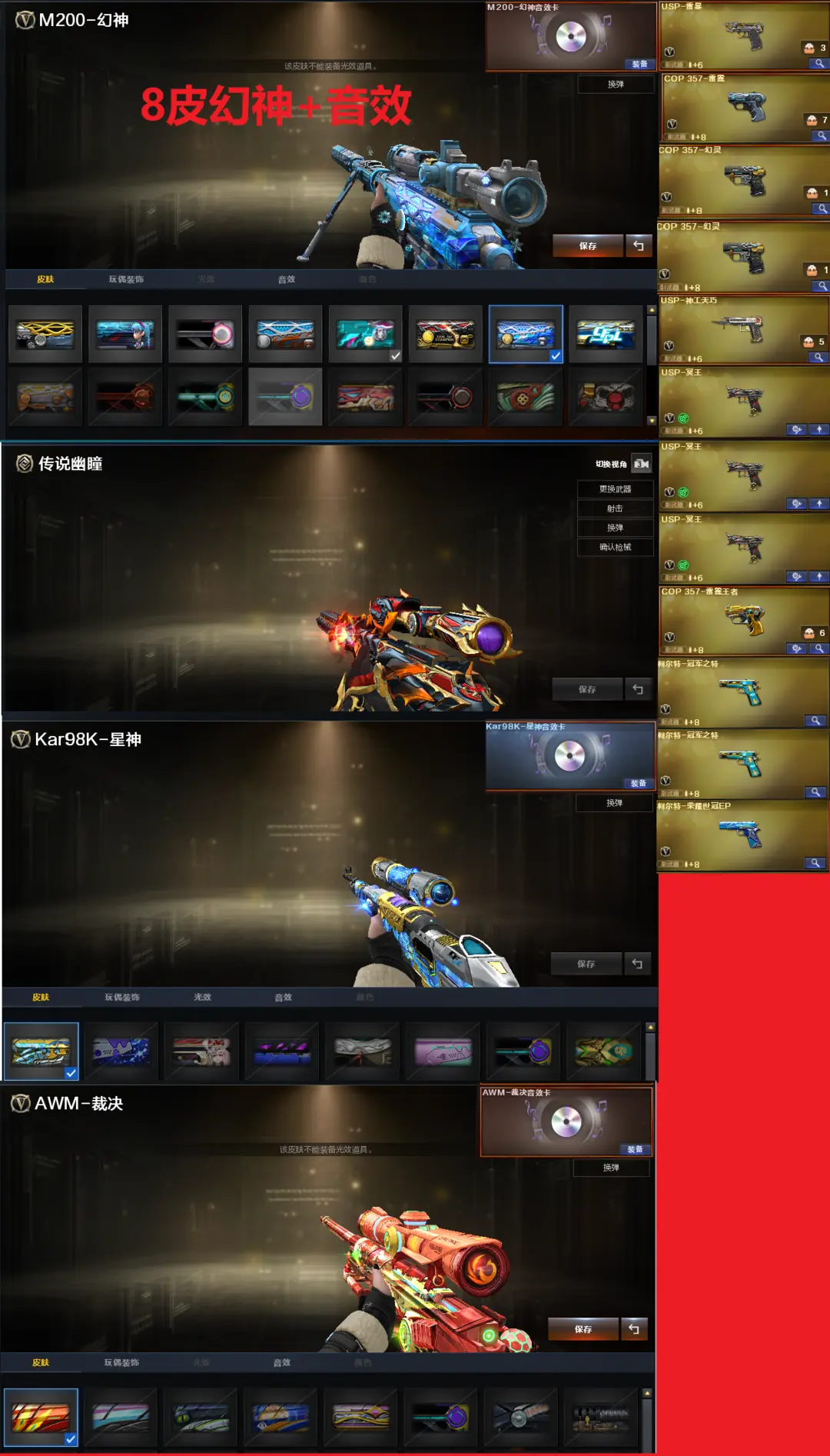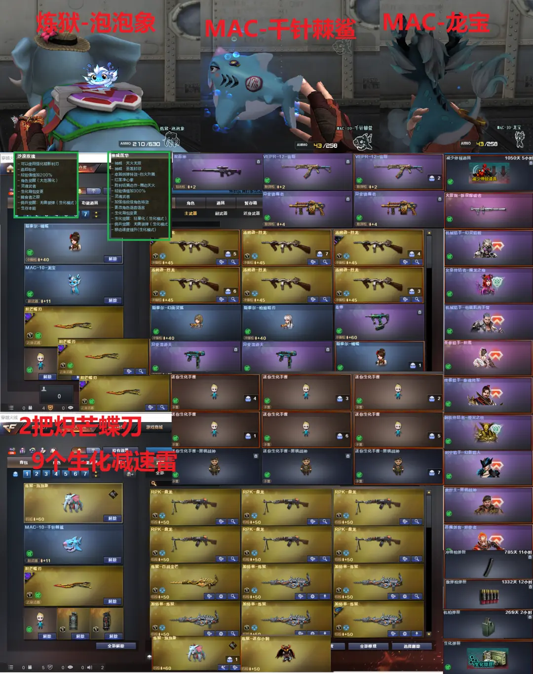 排位:可以、、、、、2把异变清道夫-无限卡子弹、、 生化极品压力(变更背包、看生化僵尸血量):无需换弹、6烈6盘、6炼狱、炼狱泡泡象、斯太尔蝴蝶、斯太枪娘暗刃、斯泰尔幻面灵狐、2个清道夫、2个宙斯、2个镇魔者、毒蜂、双面神、传说圣灵、死亡之眼、 MAC-千针棘鲨、MAC-龙宝、2把炽芒蝶刃、9个生化减速雷、超级对讲机、全部弹匣、减速停顿道具、、、、、、、、、爆破四防:幻神8皮+音效(EP荣耀、传奇欧欧、星火小队、宠儿、冠军之幻、AG、白鲨、周瑜皮肤)、传说幽瞳、M200-竞技荣光、98K星神、王者星神、、、、USP雷暴、COP雷霆、2个COP雷霆、3个柯尔特竞技荣光、USP神工天巧、3个USP冥王、2个冠军之特、COP雷霆王者、、、G36幻影、加利尔-天袭、天戎、白虎、QBZ金色蔷薇、、、幻神音效、裁决音效、幻影音效、星神音效、蔷薇音效、白虎音效、雷神音效、、、1套雷暴、7套夜魔、7套电竞装甲、8套幻灵、1套竞技荣光、2套神工天巧、4套雷霆王者、、、生化四防(神威莲华、隼、沙漠玫瑰、虹儿、礼物老人)爆破四防(传说艾莉莎、云悠悠、凌霄、王者潘多拉、影豹)
