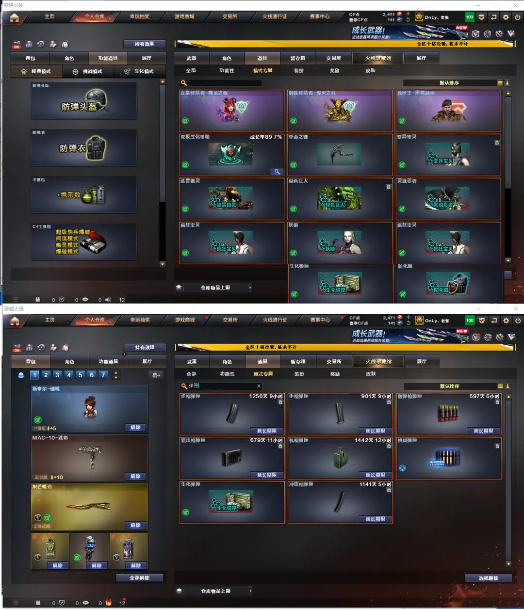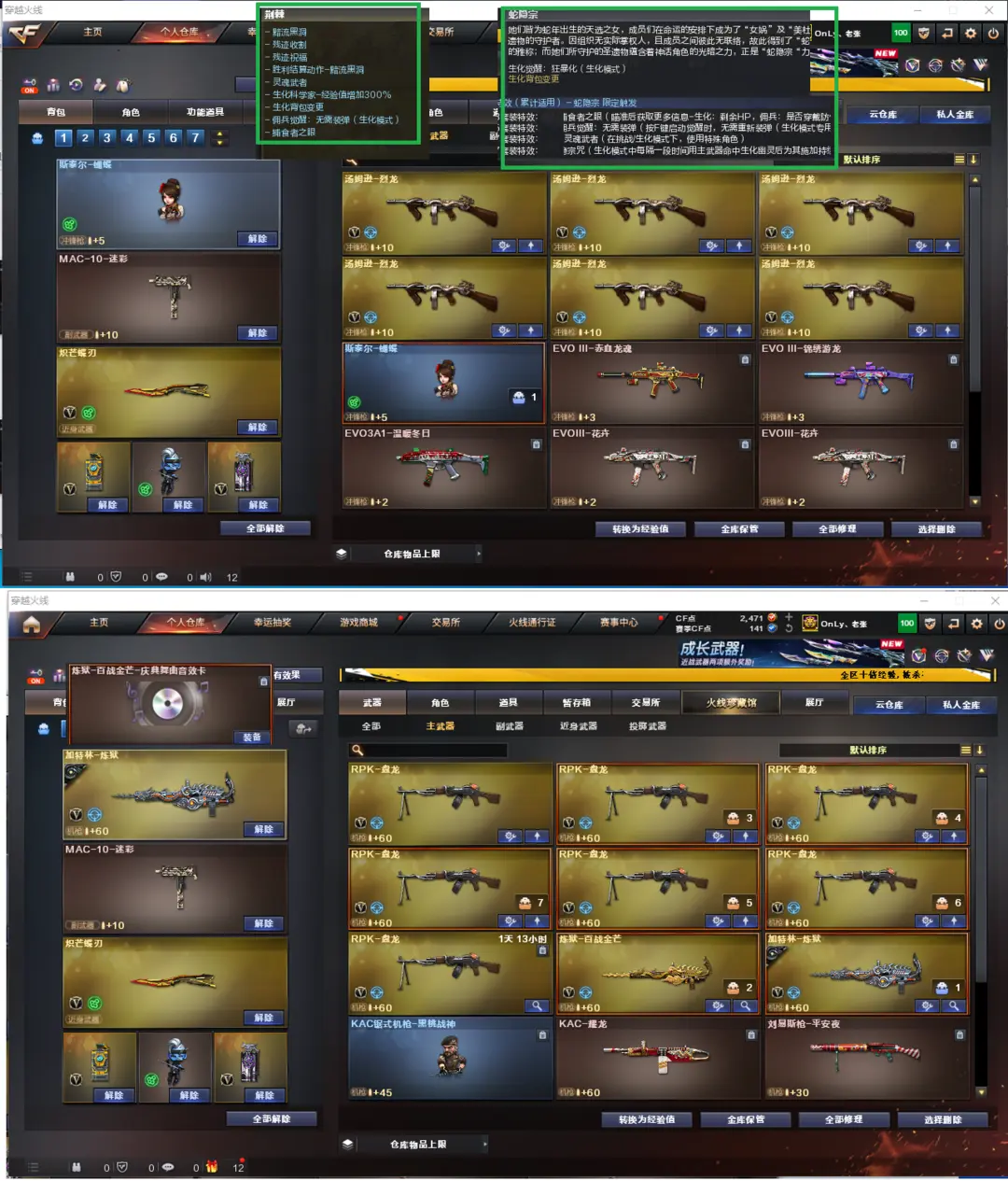 排位:可以.、、、、、、、、、、、生化全装(可以变更背包、看僵尸血量):无需换弹、6烈龙、6盘龙、炼狱音效、斯太尔蝴蝶、MAC-涂鸦、炽芒蝶刃、生化雷、超级对讲机、、、、、、、爆破四防:幻神音效(宠儿皮肤)、王者星霆、USP冥王、USP雷暴、COP云龙、COP堕天神、COP雷霆王者、G36幻影、白虎、QBZ金色蔷薇、、、幻神音效、裁决音效、蔷薇音效、雷神音效、炼狱音效、黑骑士音效、、、5套雷暴、1套夜魔、1套竞技荣光、1套云龙、4套玄豹、1套雷霆王者、、、生化四防(荆棘、蛇影宗)爆破四防(晴雅、玄豹、隐、王者炫、兰-梨园特工)