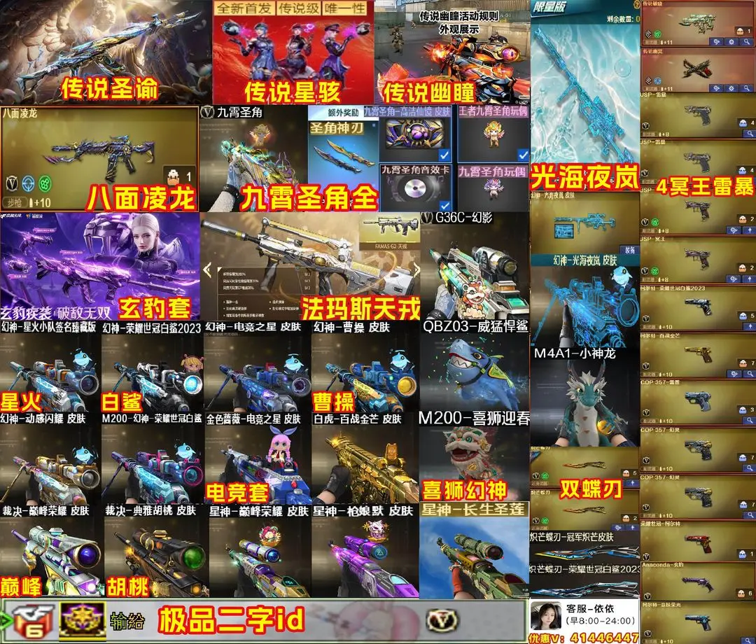 【装备道具】:极品id❤满九霄圣角❤满级八面凌龙❤天戎❤G36C幻影❤光海夜岚幻神❤星火小队幻神❤白鲨幻神皮肤❤世冠白鲨幻神❤电竞直星幻神❤动感闪耀幻神❤曹操幻神❤幻神喜狮迎春❤幻神竞技荣光❤王者幻神❤M200无畏金戈❤胡桃裁决❤巅峰荣耀裁决❤全音效卡❤传说幽瞳❤传说星骇❤传说圣谕❤传说幽瞳❤传说破晓❤星神巅峰荣耀/星神璀璨/星神枪娘默/王者星神/王者星霆/星神长生圣莲❤法玛斯天戎❤冠军炽芒蝶刃❤白鲨蝶刃❤USP冥王❤白虎百战金芒/白虎暗星/白虎大汉风骨/王者白虎/Scar玄豹套❤qbz电竞之星/QBZ女团/Qbz天罚/Qbz威猛悍鲨/王者芳薇/qbz银翼❤❤王者玄武/王者星光/王者之决/凤吟之魄❤幻神音效卡/星神音效卡/裁决音效卡/白虎音效卡/qbz音效卡电竞之星/雷神音效卡❤九霄音效卡/朱雀电竞之星音效卡/天罚音效卡/黑骑士音效卡❤USP雷暴/USP冥王/柯尔特百战金芒/柯尔特竞技荣光/COP雷霆王者/世冠柯尔特/COP幻灵/cop雷霆/MAC千针棘鲨/USP狮子❤️毒蜂/斯泰尔蝴蝶/生化手雷/蛇影双骄/猎手生化❤️满生化/6烈龙6盘龙炼狱