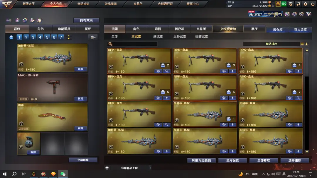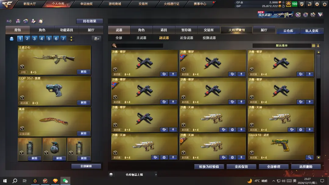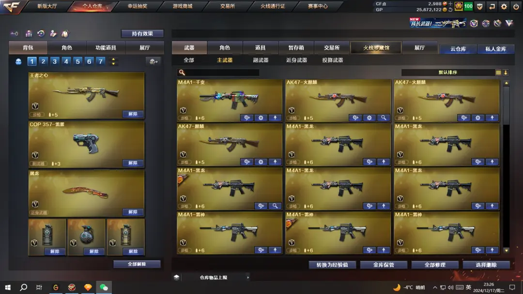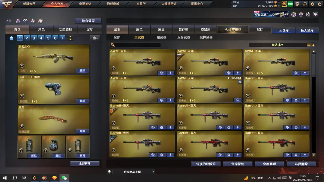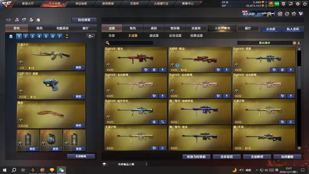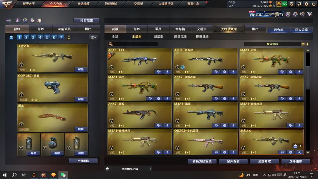本游戏账号:英雄武器137个; 王者武器21个。 装备不多,但是主武器、副武器、近身武器够用 拥有完美游戏体验。重要的是,特殊装备有:Barrett-毁灭、雷霆之锋、M4A1-雷神、M4A1-黑龙、QBZ03-金色蔷薇、M4A1-玫瑰精灵、加特林-炼狱、雷霆之怒、M4A1-雷霆、雷霆之契、AWM-天龙、麒麟刺、AK47-火麒麟、M4A1-黑骑士、AK47-黑武士、AK47-麒麟、AN94-超新星、王者之怒、超新星-悦享、王者之魄、炼狱-悦蓝、王者之锋、王者之魂、王者之武、王者之影、炫金黑龙、炫金雷神、炫金毁灭、玫瑰精灵-悦动、王者之戮、王者之心-觉醒版、王者之瞳、潘多拉、堕天使、雷霆-β、生化弹匣、王者之心金色光效、等,随意畅选。