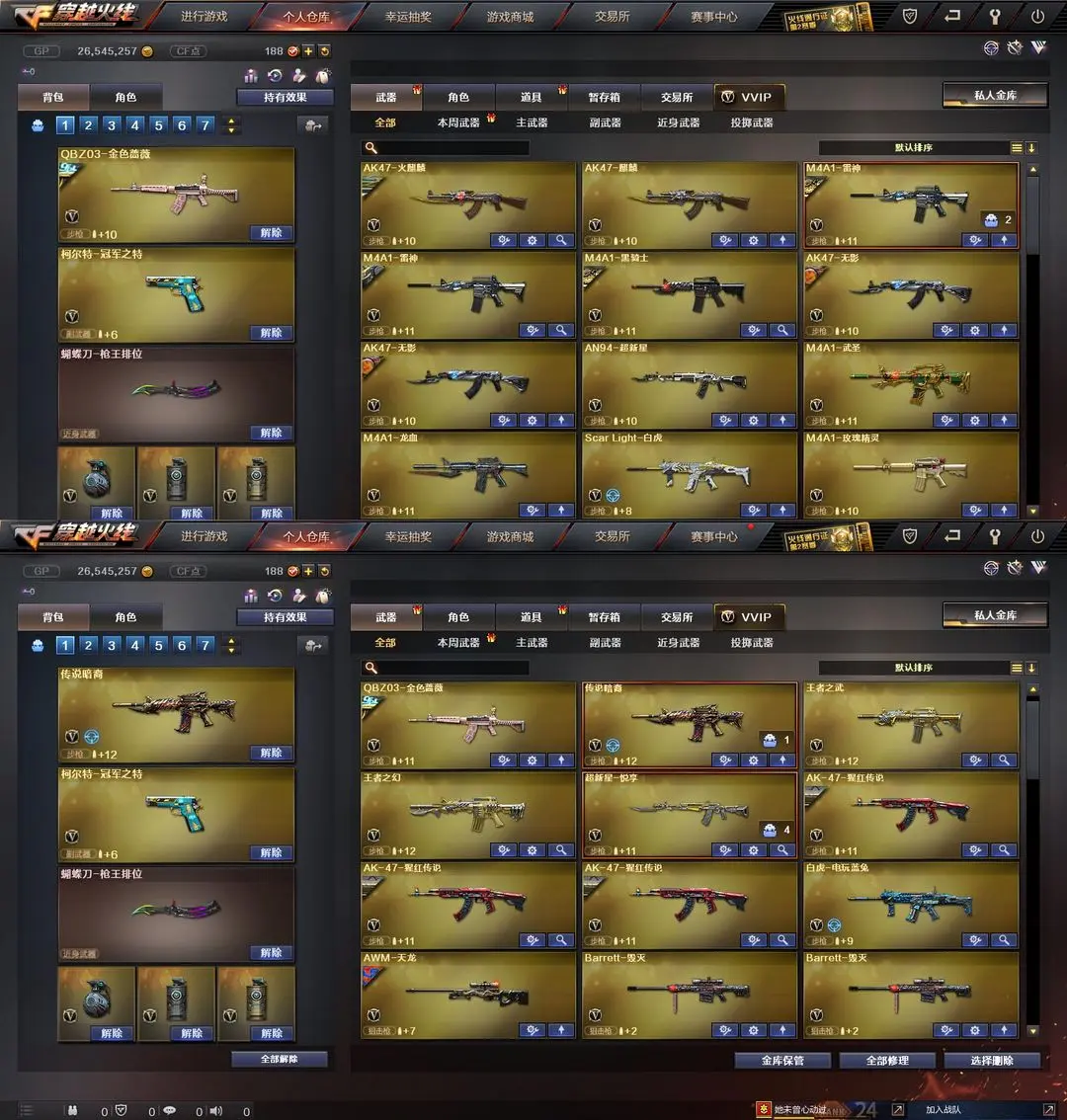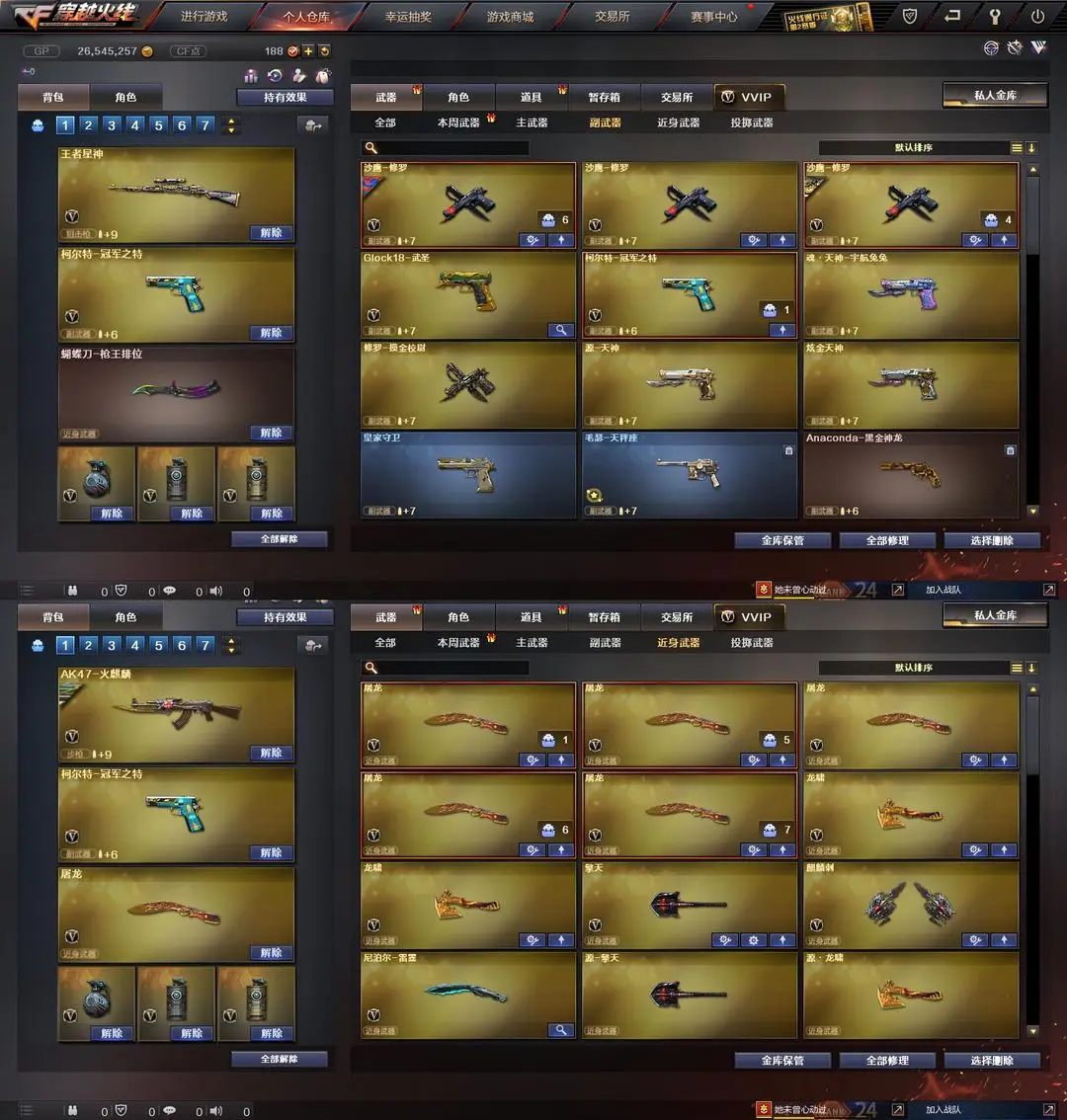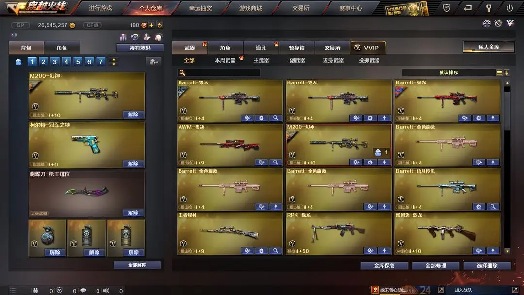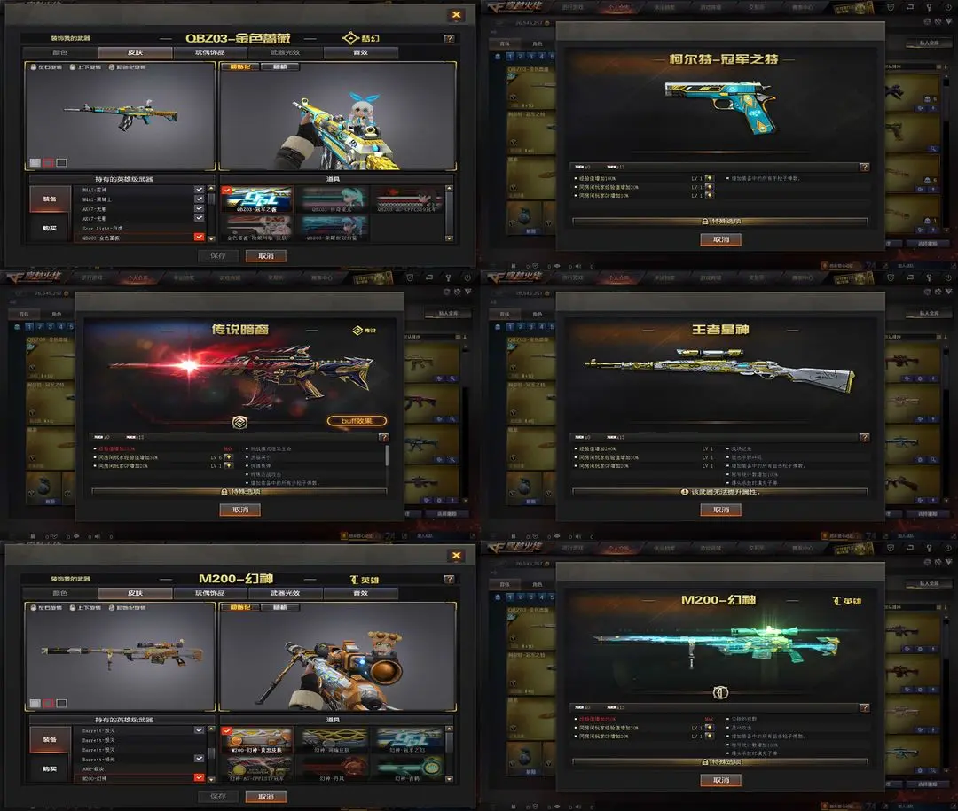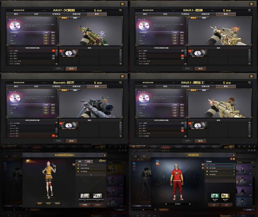 【装备道具】:QBZ-冠军之薇★柯尔特-冠军之特★传说暗裔★觉醒王者星神★鹰★M200-幻神★幻神黄忠皮肤★SCAR-白虎★QBZ-金色蔷薇★白虎电玩蓝兔★火雷毁黑4音效卡★火麒麟音效卡雷神音效卡毁灭音效卡黑骑士音效卡★火麒麟战神关羽★虎将雷神皮肤★耀金星空套★雷神耀金★黑骑士耀金★修罗耀金皮肤★雷神星空皮肤★毁灭星空皮肤★鹰★王者星神王者之之魄王者之幻王者之翼王者之武★王者零★王者之瞳★AA-12雷霆★2烈龙1盘龙★炫金火麒麟★炫金雷神★炫金骑士★炫金毁灭★炫金天神★炫金超新星★蝴蝶刀排位★生化弹夹防化服变异宝贝死亡之眼对讲机不退包★佣兵觉醒无需换弹手斧镜减速雷★捕食者之眼查看血量★