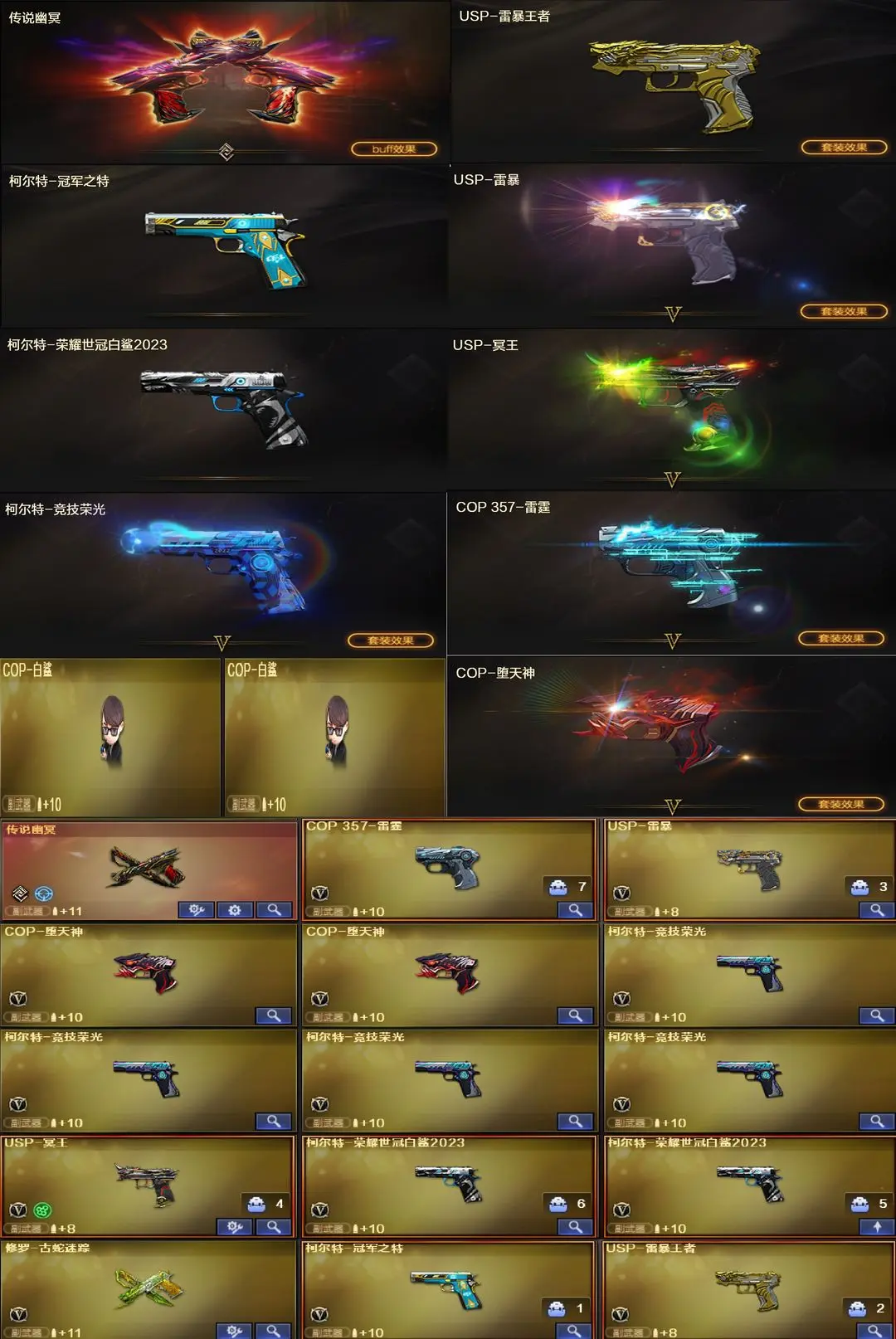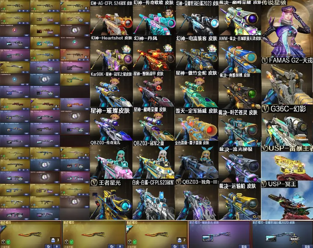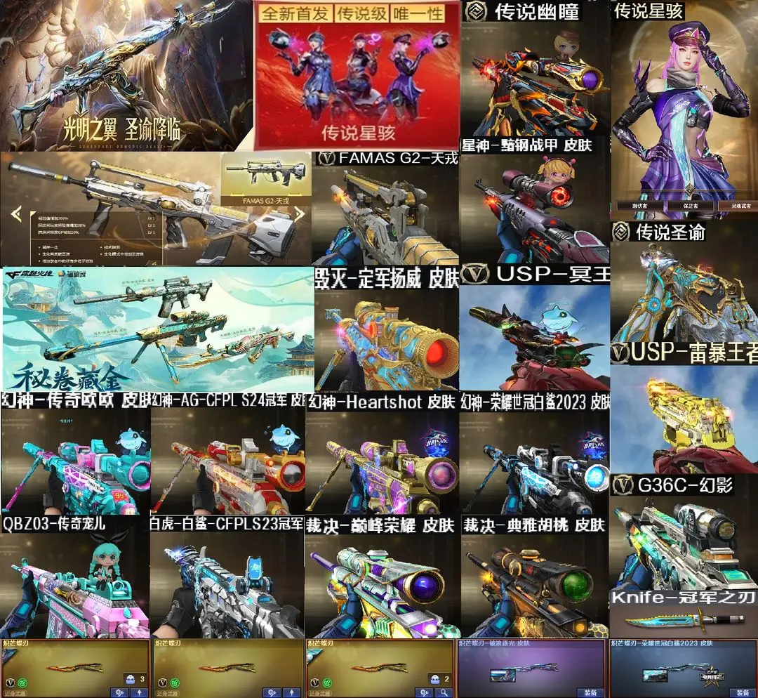 【装备道具】:传说星骇/传说圣谕/传说幽瞳/传说幽冥❤幻神-Heartshot/幻神-电流骇客/幻神-AG- S24冠军/幻神-欧欧/幻神-荣耀世冠白鲨2023/幻神-丹凤/星神-黯钢战甲/星神-巅峰荣耀/星神-傲竹金蛇/星神-冠军之星/星神-璀璨皮肤/毁灭-定军扬威/裁决-运输船/裁决-叶芒苍灵/裁决-典雅胡桃/裁决-流光秘银/裁决-百城联赛天津/裁决-凤灵/裁决-巅峰荣耀/裁决-羽掣/金色蔷薇-破浪逐光/金色蔷薇-Heartshot/白虎-白鲨冠军/Scar-白虎-暗星/QBZ-AG-S19冠军/冠军之薇/QBZ-传奇宠儿/炽芒蝶刃-破浪逐光 皮肤/炽芒蝶刃-荣耀世冠白鲨2023❤QBZ03-独角/FAMAS G2-天戎/G36C-幻影/SK-94-金蚀/USP-冥王/柯尔特-冠军之特/柯尔特-竞技荣光(4)/USP-雷暴❤王者雷影/AK47-雷暴王者/王者玄武/王者星光/USP-雷暴王者/独角之刃/王者冰锋/王者玉锋//堕天神套装/竞技荣光套装/雷暴套装/迷迭香/雨棠/电竞教官-云悠悠/关小雨/隼/机械姬/雨墨/研/毒蝰术士/玄豹/炼狱-迷你小钢/异变清道夫-蛇影双骄/全音效卡