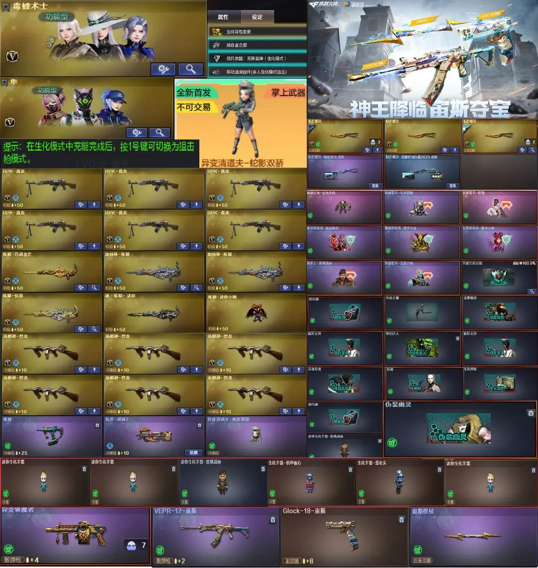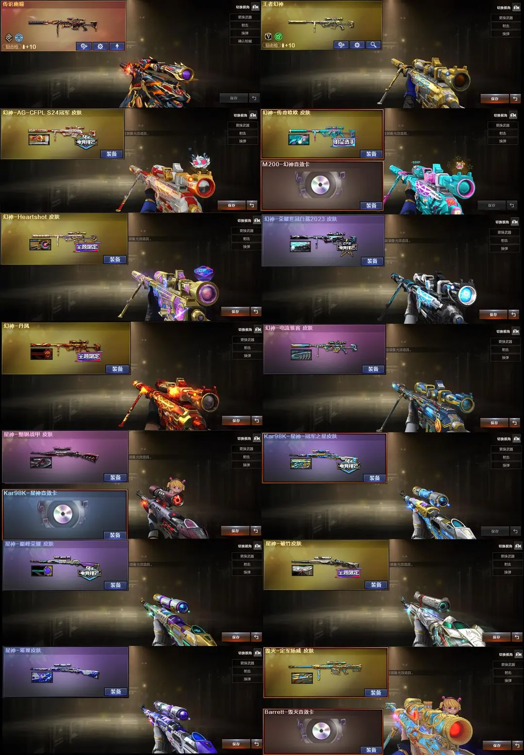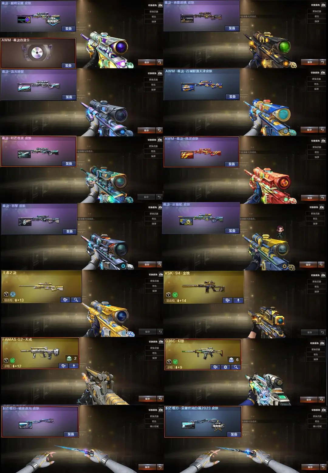 【装备道具】:传说星骇/传说圣谕/传说幽瞳/传说幽冥❤幻神-Heartshot/幻神-电流骇客/幻神-AG- S24冠军/幻神-欧欧/幻神-荣耀世冠白鲨2023/幻神-丹凤/星神-黯钢战甲/星神-巅峰荣耀/星神-傲竹金蛇/星神-冠军之星/星神-璀璨皮肤/毁灭-定军扬威/裁决-运输船/裁决-叶芒苍灵/裁决-典雅胡桃/裁决-流光秘银/裁决-百城联赛天津/裁决-凤灵/裁决-巅峰荣耀/裁决-羽掣/金色蔷薇-破浪逐光/金色蔷薇-Heartshot/白虎-白鲨冠军/Scar-白虎-暗星/QBZ-AG-S19冠军/冠军之薇/QBZ-传奇宠儿/炽芒蝶刃-破浪逐光 皮肤/炽芒蝶刃-荣耀世冠白鲨2023❤QBZ03-独角/FAMAS G2-天戎/G36C-幻影/SK-94-金蚀/USP-冥王/柯尔特-冠军之特/柯尔特-竞技荣光(4)/USP-雷暴❤王者雷影/AK47-雷暴王者/王者玄武/王者星光/USP-雷暴王者/独角之刃/王者冰锋/王者玉锋//堕天神套装/竞技荣光套装/雷暴套装/迷迭香/雨棠/电竞教官-云悠悠/关小雨/隼/机械姬/雨墨/研/毒蝰术士/玄豹/炼狱-迷你小钢/异变清道夫-蛇影双骄/全音效卡