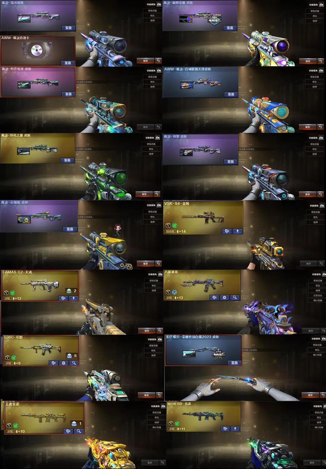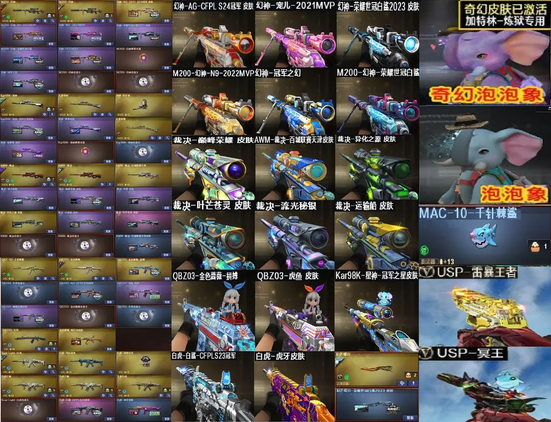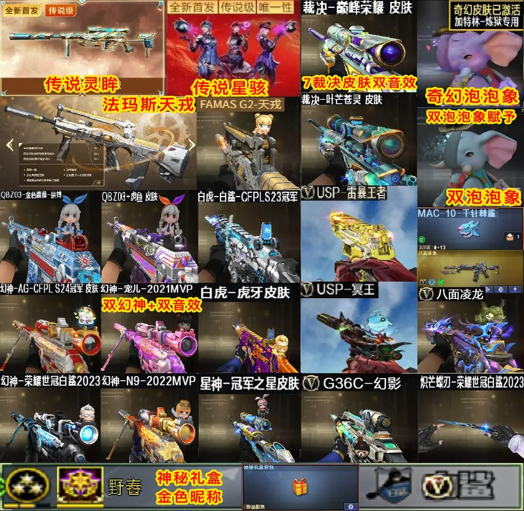 【装备道具】:天戎❤️USP冥王❤️王者雷暴❤️AG幻神宠儿幻神白鲨幻神巅峰裁决音效卡裁决7皮❤️星神冠军之星/星神璀璨/星神漫游/蝶刃❤️Qbz拼搏/QBZ虎鱼/白鲨白虎❤️传说圣谕灵眸❤双泡泡象生化❤传说梦魇❤传说影煞/传说星星骇/隼/鹰/晴雅/王者风神/王者星神/王者之决/VSK-94-金蚀/机械姬/玄豹/天罚音效卡/星神音效卡/幻神音效卡/雷神音效卡/黑骑士音效卡/毁灭音效卡/裁决音效卡/白虎音效卡/金色蔷薇音效卡/极光音效卡/炼狱-百战金芒-庆典舞曲音效卡❤G36C-幻影/M14EBR-玄武/QBZ03-天罚/FAMAS G2-天戎/八面凌龙/斯泰尔-枪娘暗刃/斯泰尔-蝴蝶/异变清道夫/毒刺一金线/炼狱-迷你小钢/炼狱-泡泡象/炼狱-奇幻宇宙万象/炼狱-秦师❤USP-雷暴/COP -幻灵/USP-神工天巧/USP-冥王/COP 357-云龙/柯尔特-荣耀世冠白鲨2023/柯尔特-无冕之王/荣耀世冠-柯尔特/COP 357-雷霆王者/柯尔特-冠军之特/USP-雷暴王者/MAC-10-千针棘鲨/双面神/AA12-擎天柱川黑龙吞噬者/