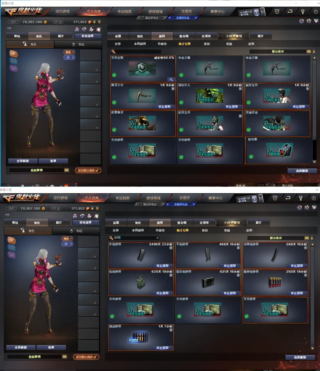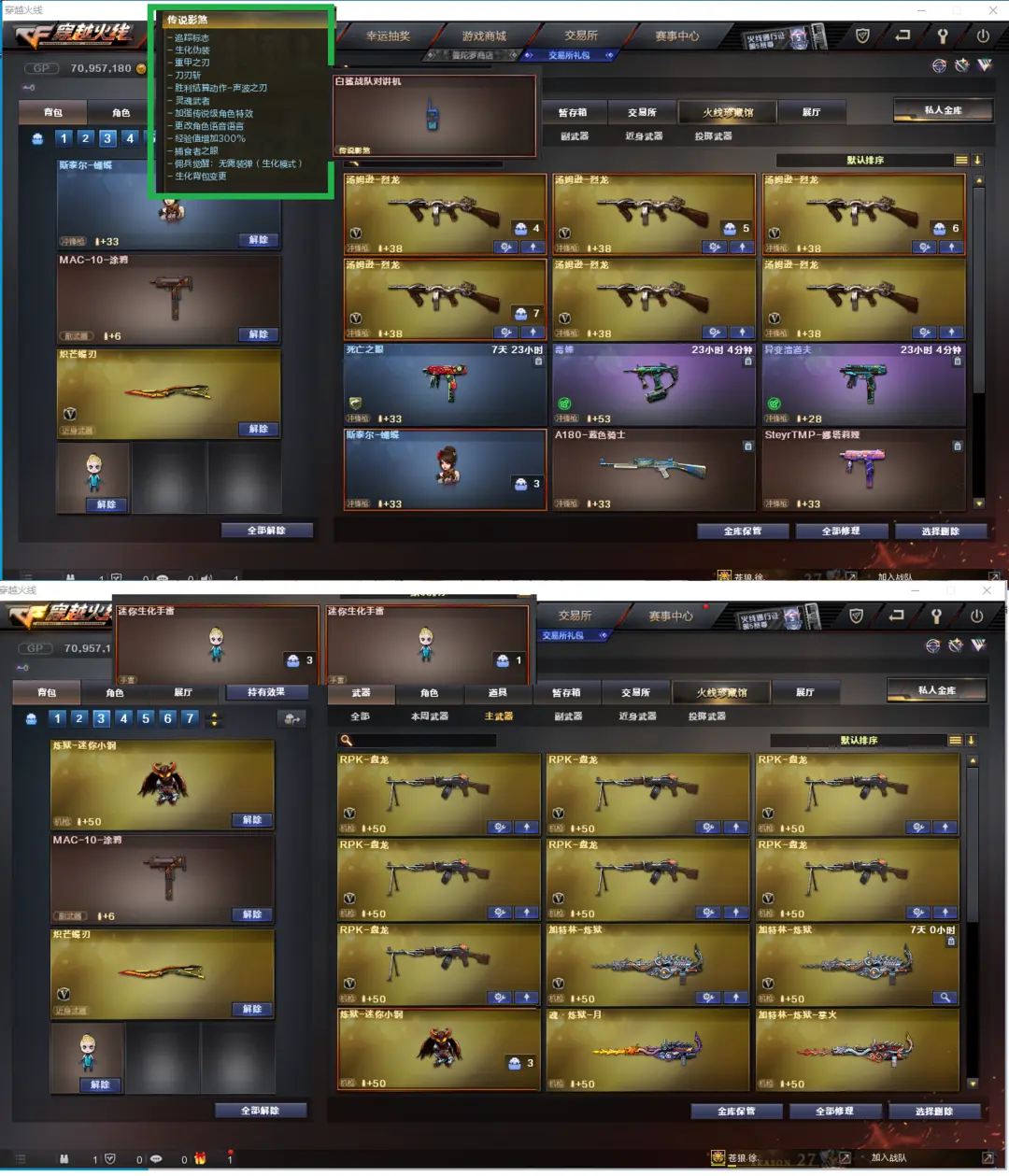 排位:可以------------------生化极品(生化模式换背包、可以查看生化僵尸血量):6烈6盘、斯太尔蝴蝶、炼狱小钢、死亡之眼、MAC-涂鸦、手斧镜、蝴蝶刀、2个生化减速雷、超级对讲机、全部弹匣-------------爆破全装:M200-幻神(星火小队)、王者星神、、、、生化人物(传说影煞、王者额闭月羞花)