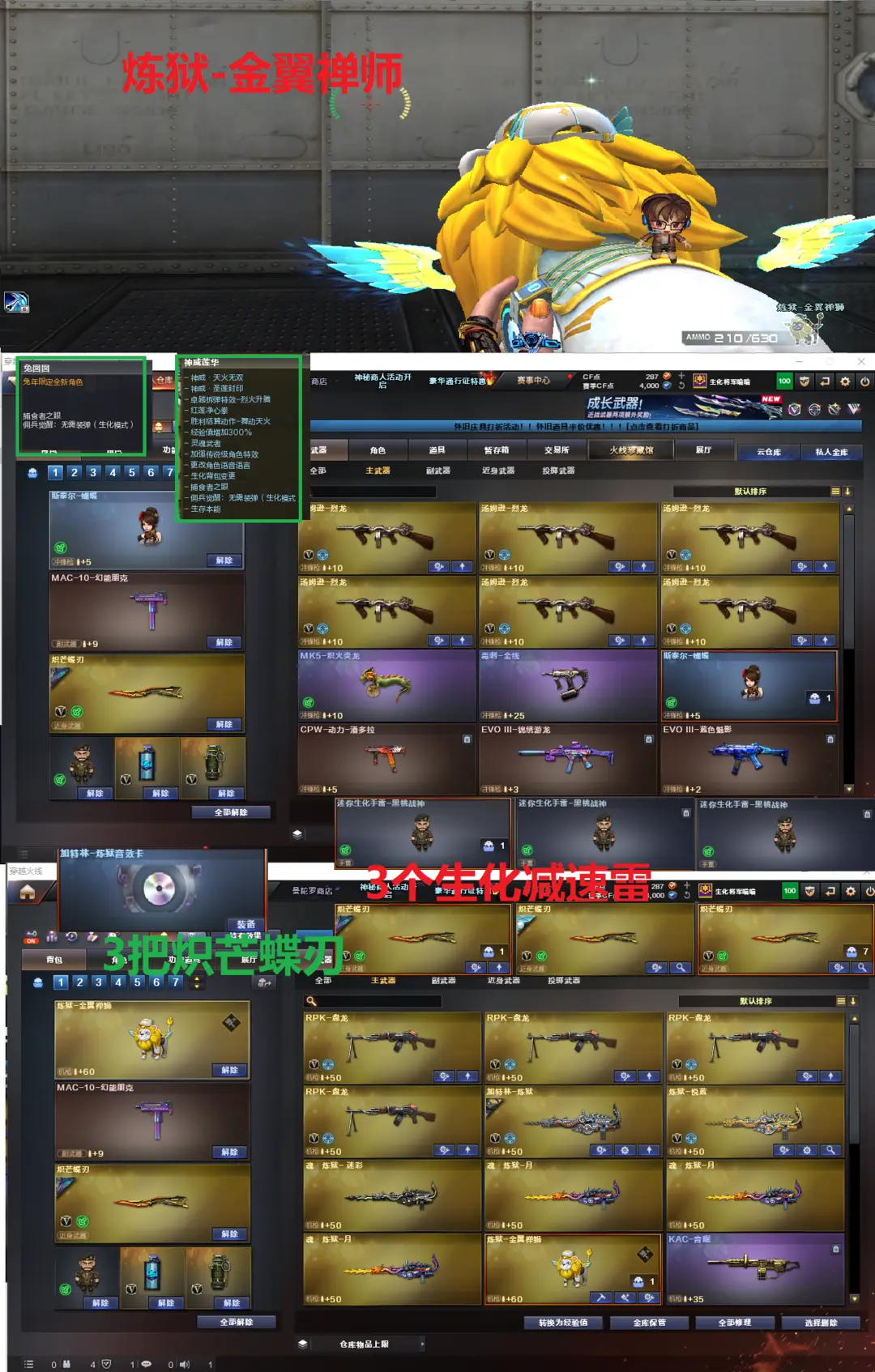 排位:可以-----------------------生化四防极品(更换背包、可以看僵尸血量 ):无需换弹、6烈龙、4盘龙、2炼狱、炼狱-金翼禅师、炼狱+音效、斯太尔蝴蝶、MK5-炽火炎龙、双面神、死亡之眼、MAC涂鸦、3个炽芒蝶刃、手斧镜、3个生化减速雷、超级对讲机、全部弹匣、、、、、、、、、、、、、、、、爆破四防:幻神音效(23白鲨皮肤)、传说幽瞳、传说灵眸、98K星神、M200-竞技荣光、王者星霆、、、、USP神工天巧、传说破晓、传说幽冥、3个COP云龙、2个COP雷霆王者、冠军之特、、、、、白虎、G36幻影、QBZ云龙、QBZ金色蔷薇、王者芳薇、VSK-94-金蚀、2把炽芒蝶刃、白虎小艾、、、裁决音效、蔷薇音效、炼狱音效、雷神音效、玄武音效、裁决音效、极光音效、火麒麟音效、黑骑士音效、、、1套雷暴、1套竞技荣光、6套云龙、、、爆破四防(传说影煞、神威莲华、传说星骇、星际战将、雨墨、王者迷迭香)