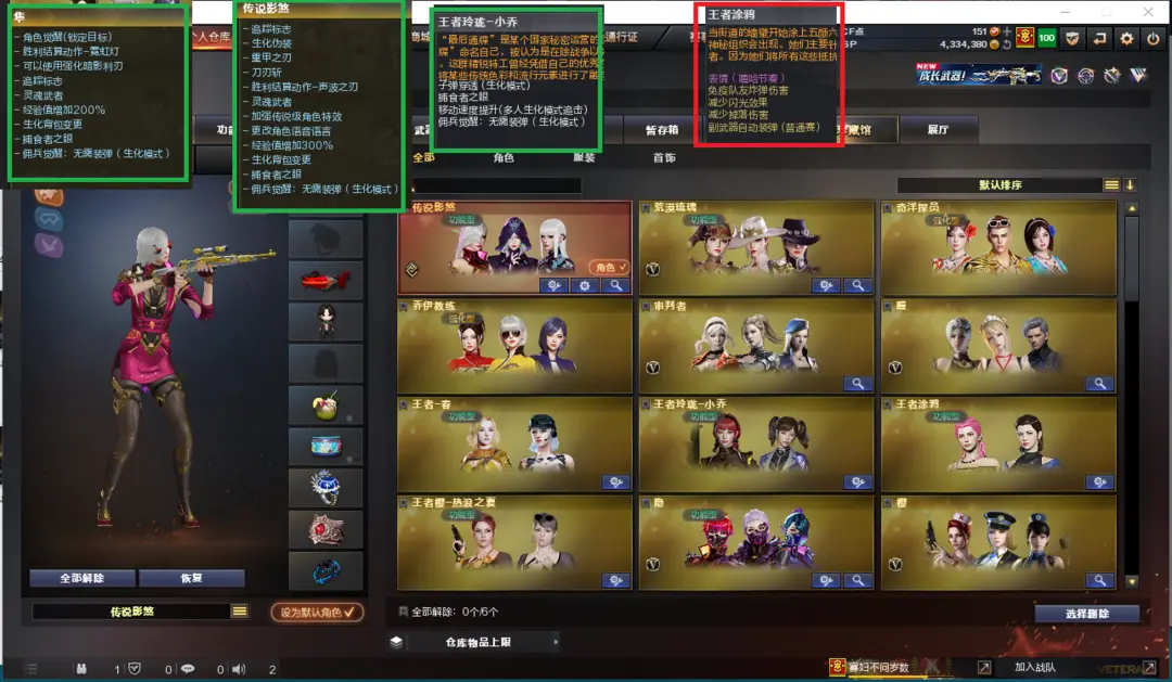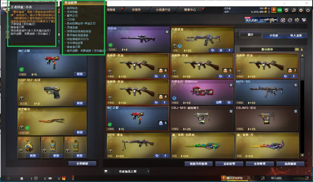 排位:可以-----------生化全装(可以变更背包、看僵尸血量):无需换弹、4烈龙、盘龙、炼狱、死亡之眼、双面神、八面玲珑、炽芒蝶刃、、、、、、、、、爆破四防:幻神音效(巅峰荣耀)、COP幻灵、王者星神、白虎、八面玲珑、王者凤吟、金色小号、、、幻神音效、蔷薇音效、、、1套堕天神、1套幻灵、1套云龙、3套雷霆王者、、、、生化人物(传说影煞、隼、王者小乔)、