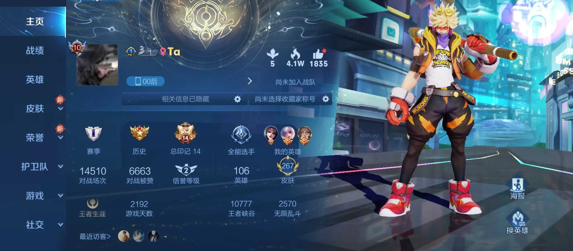本游戏账号: V10用户,基础段位:永恒钻石II,英雄多,皮肤多。典藏皮肤4个,感受典藏皮肤带来的优质体验快感,FMVP皮肤1个,尽情享受FMVP皮肤带来的主角光环, 私人所属英雄皮肤有:孙尚香 杀手不太冷||芈月 大秦宣太后||孙悟空 全息碎影||小乔 天鹅之梦诸葛亮 武陵仙君||孙尚香 末日机甲||吕布 天魔缭乱||宫本武藏 地狱之眼||李白 凤求凰||狄仁杰 超时空战士||武则天 海洋之心||貂蝉 仲夏夜之梦||艾琳 觅芳踪||孙悟空 地狱火||后羿 黄金射手座||虞姬 启明星使||杨戬 永曜之星,等等
