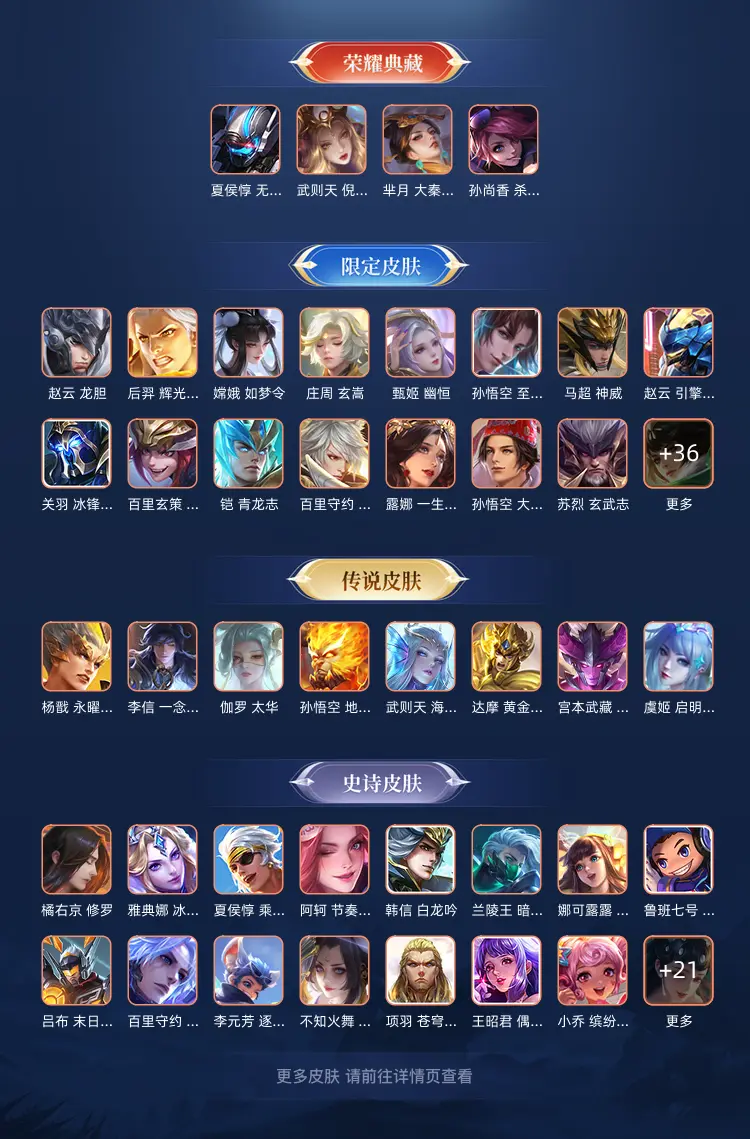 本游戏账号: V10用户,基础段位:至尊星耀IV,英雄多,皮肤多。典藏皮肤4个,感受典藏皮肤带来的优质体验快感, 私人所属英雄皮肤有:孙尚香 杀手不太冷||芈月 大秦宣太后||夏侯惇 无限飓风号||武则天 倪克斯神谕达摩 黄金狮子座||武则天 海洋之心||孙悟空 地狱火黄忠 烈魂||铠 青龙志||苏烈 玄武志||百里玄策 白虎志||百里守约 朱雀志||庄周 玄嵩||嫦娥 如梦令||马超 神威||甄姬 幽恒||典韦 岱宗||关羽 冰锋战神||露娜 一生所爱||韩信 飞衡||花木兰 瑞麟志||孙悟空 至尊宝||孙悟空 大圣娶亲||后羿 辉光之辰||杨戬 永曜之星||干将莫邪 冰霜恋舞曲||赵云 龙胆||赵云 引擎之心||妲己 时之彼端||李信 一念神魔||伽罗 太华,等等