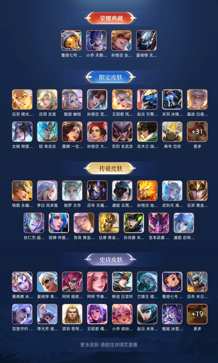本游戏账号: V10用户,基础段位:至尊星耀V,英雄多,皮肤多。典藏皮肤4个,感受典藏皮肤带来的优质体验快感,FMVP皮肤2个,尽情享受FMVP皮肤带来的主角光环, 私人所属英雄皮肤有:鲁班七号 星空梦想||夏侯惇 无限飓风号||孙悟空 全息碎影||小乔 天鹅之梦孙尚香 末日机甲||吕布 天魔缭乱||宫本武藏 地狱之眼||李白 凤求凰||狄仁杰 超时空战士||达摩 黄金狮子座||武则天 海洋之心||貂蝉 仲夏夜之梦||艾琳 觅芳踪||张良 黄金白羊座||孙悟空 地狱火||后羿 黄金射手座||虞姬 启明星使||虞姬 云霓雀翎||杨戬 永曜之星||伽罗 太华,等等