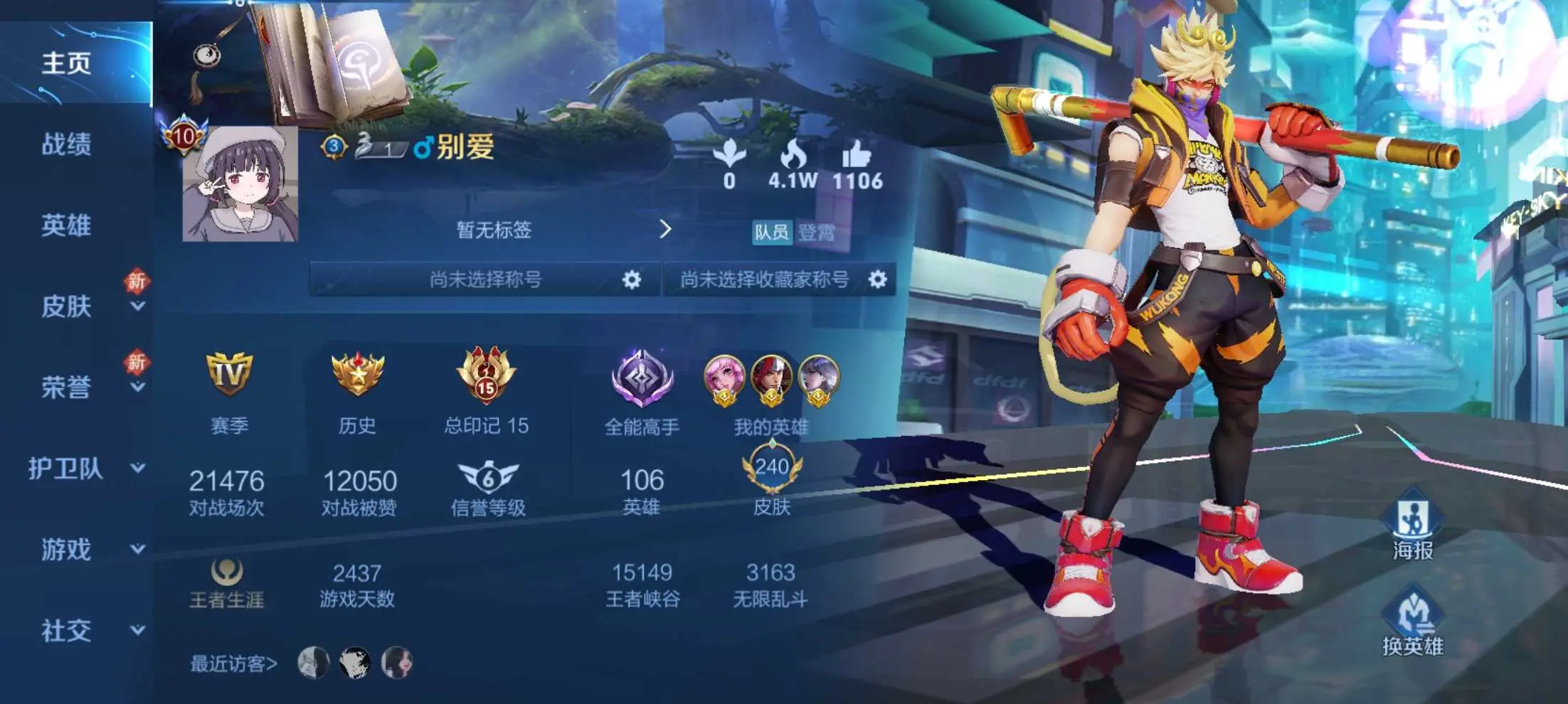 本游戏账号: V10用户,基础段位:至尊星耀II,英雄多,皮肤多。典藏皮肤3个,感受典藏皮肤带来的优质体验快感,FMVP皮肤1个,尽情享受FMVP皮肤带来的主角光环, 私人所属英雄皮肤有:鲁班七号 星空梦想||夏侯惇 无限飓风号||孙悟空 全息碎影诸葛亮 武陵仙君||梦奇 胖达荣荣||孙尚香 末日机甲||吕布 天魔缭乱||宫本武藏 地狱之眼||李白 凤求凰||狄仁杰 超时空战士||达摩 黄金狮子座||武则天 海洋之心||貂蝉 仲夏夜之梦||艾琳 觅芳踪||孙悟空 地狱火||后羿 黄金射手座||虞姬 启明星使||虞姬 云霓雀翎||杨戬 永曜之星||伽罗 太华,等等
