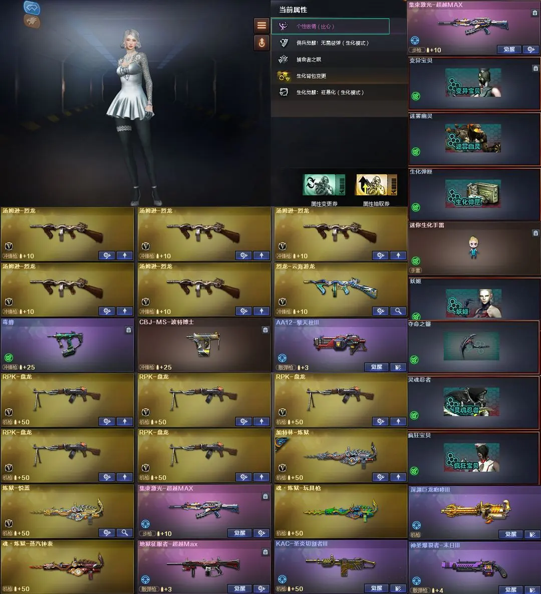 【装备道具】:传说暗裔/传说幽瞳★M200-幻神★M200-幻神-荣耀世冠白鲨/Scar Light-白虎/QBZ03-金色蔷薇/王者芳薇/王者星神/黄金猫猫手套-白鲨★5烈龙/5盘龙/毒蜂/轻型军用手斧-镜/加特林-炼狱/迷你生化手雷★雷神-荣耀之魄/雷神-虎将麒麟刺-荣耀世冠白鲨★QBZ03-金色蔷薇/Scar Light-白虎/白虎-电玩蓝兔/黄金猫猫手套-白鲨★COP-白鲨★✨幻灵手雷套✨四防王者炽天使/王者潘多拉/雨棠★炫金毁灭★王者星神/王者芳薇/王者之武/王者之势/王者白虎/炼狱-悦蓝★龙儿/魅影/铁骑荣耀/雨棠/王者潘多拉/王者炽天使/王者凌霄/复仇者/堕天使/影武者-X/救世主-X/斯沃特-X/潘多拉-X/娟娟/妲己/灵狐者-黄金海岸/紫霞/麻雀/萌儿/超能特工/兔囡囡/乔伊教练/云海玲珑/奇洋探员/木兰★生化弹夹防化服变异宝贝死亡之眼★佣兵觉醒手斧镜减速雷★捕食者之眼死亡之眼超级对讲机不退包★超级背包无需换弹查看血量★
