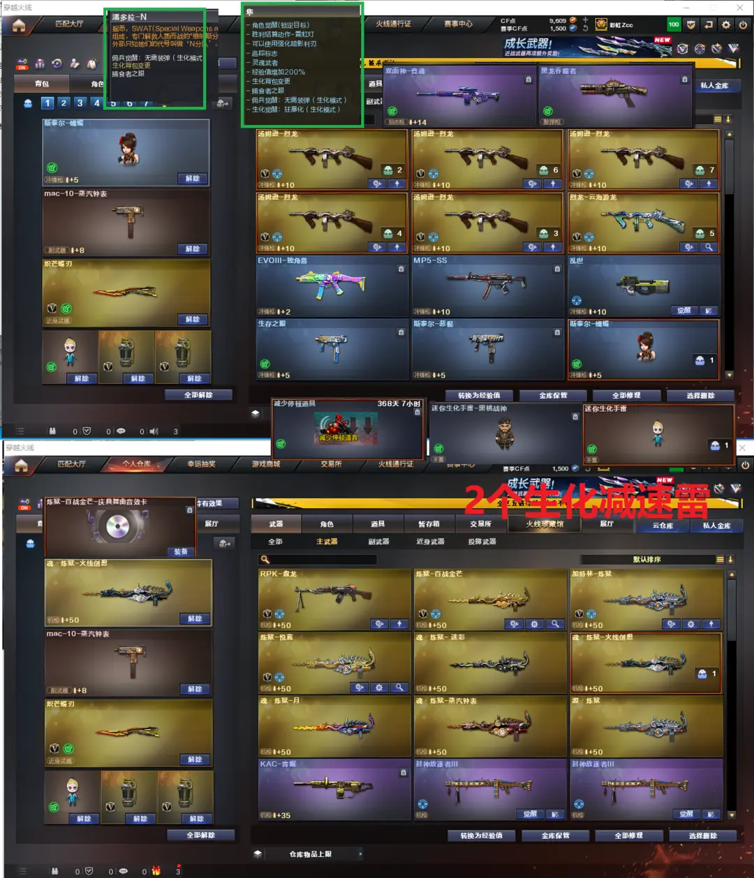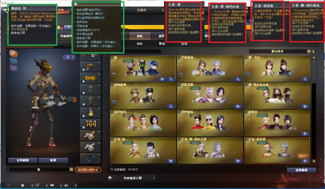 排位:可以、、、、、、、、、、、生化四防(可以变更背包、查看僵尸血量):无需换弹、6烈龙、盘龙、3炼狱、斯泰尔蝴蝶、双面神、死亡之眼、MAC-10-涂鸦、炽芒蝶刃、2个生化减速雷、超级对讲机、减速停顿道具、全部弹匣、、、、、、爆破四防:幻神4皮+音效(23白鲨、宠儿、电流骇客、动感闪耀皮肤)、王者星神、、、、USP雷暴、23白鲨柯尔特、G36幻影、玄豹白虎、QBZ金色蔷薇、、、幻神音效、裁决音效、毁灭音效、极光音效、黑骑士音效、、、6套幻灵、1套竞技荣光、1套云龙、4套玄豹、3套雷霆王者、2套雷暴王者、、、生化四防(隼、潘多拉-N)、爆破四防(王者春、王者国色天香、王者迷迭香、王者闭月羞花)
