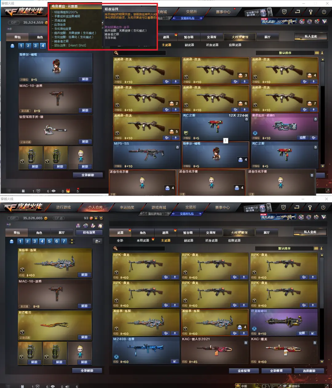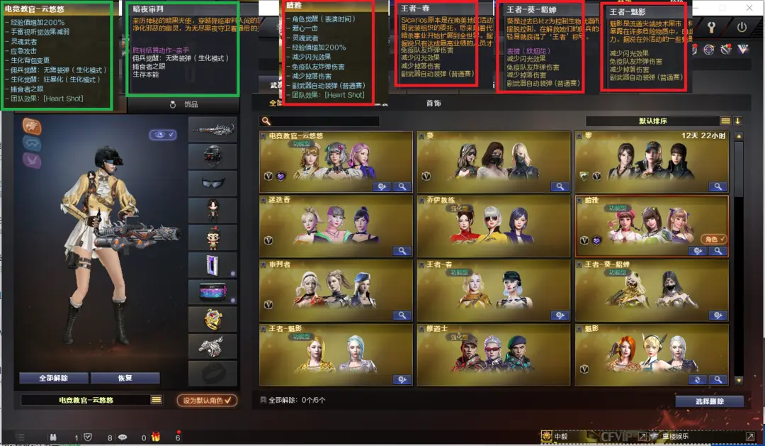 排位:可以、、、、、、生化四防:(可以变更背包、查看生化僵尸血量):无需换弹、6烈龙、6盘龙、炼狱、斯泰尔蝴蝶、死亡之眼、MAC涂鸦、炽芒蝶刃、手斧镜、3个生化减速雷、超级对讲机、全部弹匣、、、、、爆破四防:幻神音效(冠军之幻、黄忠皮肤)、王者幻神、USP雷暴、COP堕天神、COP雷霆、柯尔特竞技荣光、柯尔特世冠、星神、白虎、、、幻神音效、蔷薇音效、毁灭音效、白虎音效、雷神音效、黑龙音效、裁决音效、火麒麟音效、黑骑士音效、、、1套雷霆、4套雷暴、2套堕天神、5套夜魔、3套电竞装甲、、、、生化四防(云悠悠、暗夜审判)、爆破四防(晴雅、王者春、王者貂蝉、王者魅影、职业经理)