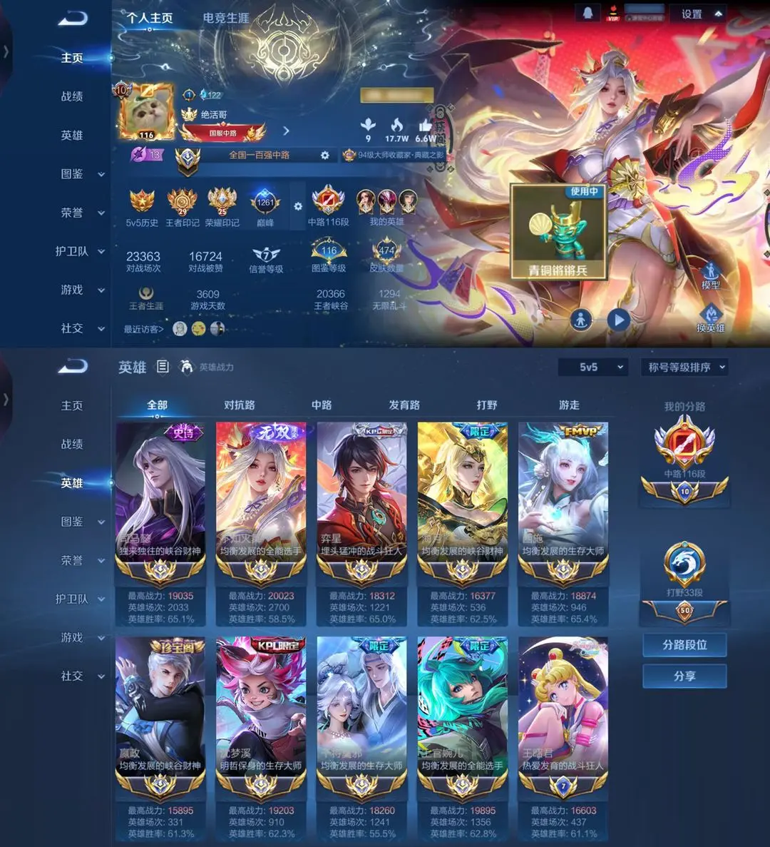 在榜全国百强中路116段❤9大历史国服不知火舞2W极限战力❤百段中路国服中路❤巅峰魔方亮青铜锵锵兵