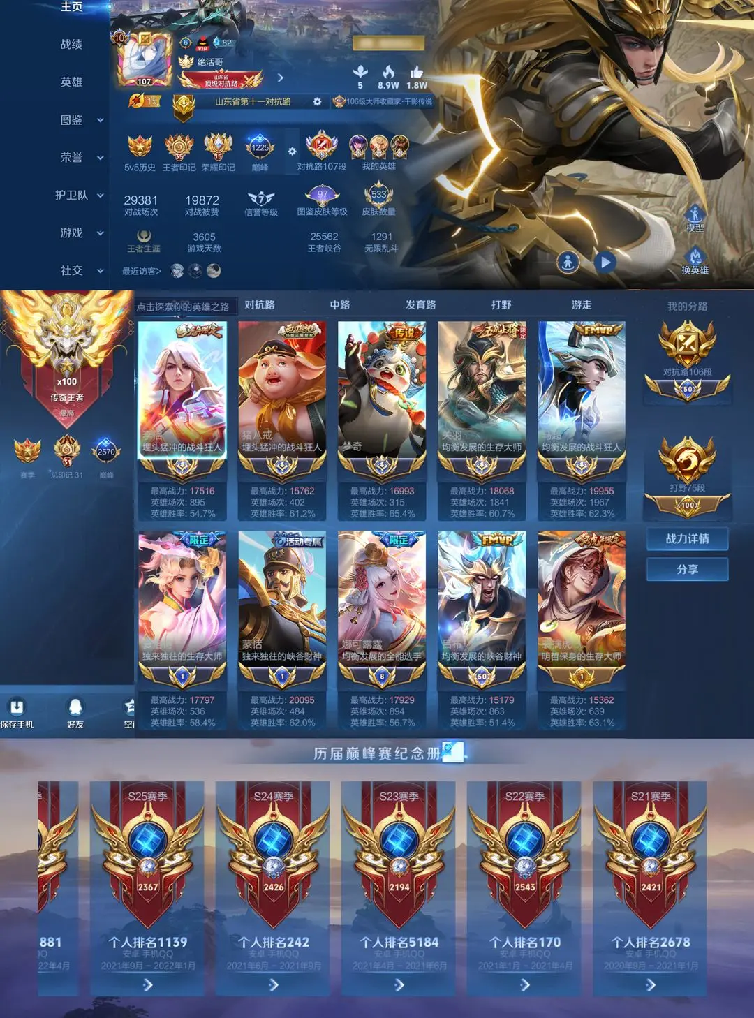 在榜省级对抗路106段❤5历史国服马超关羽李信百段对抗路❤历史国服对抗路❤全能大师称号顶边