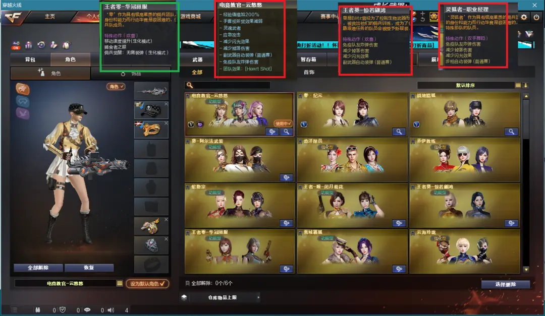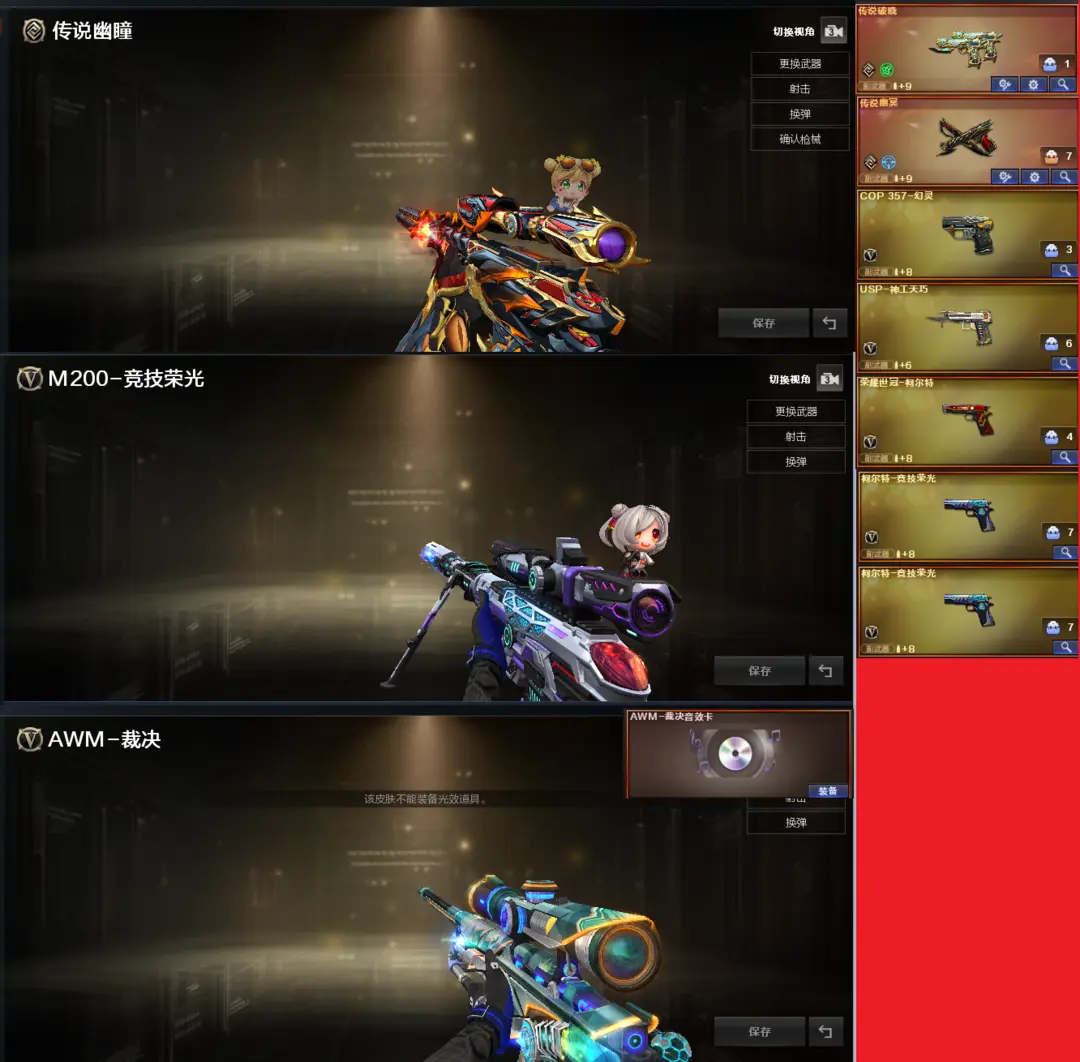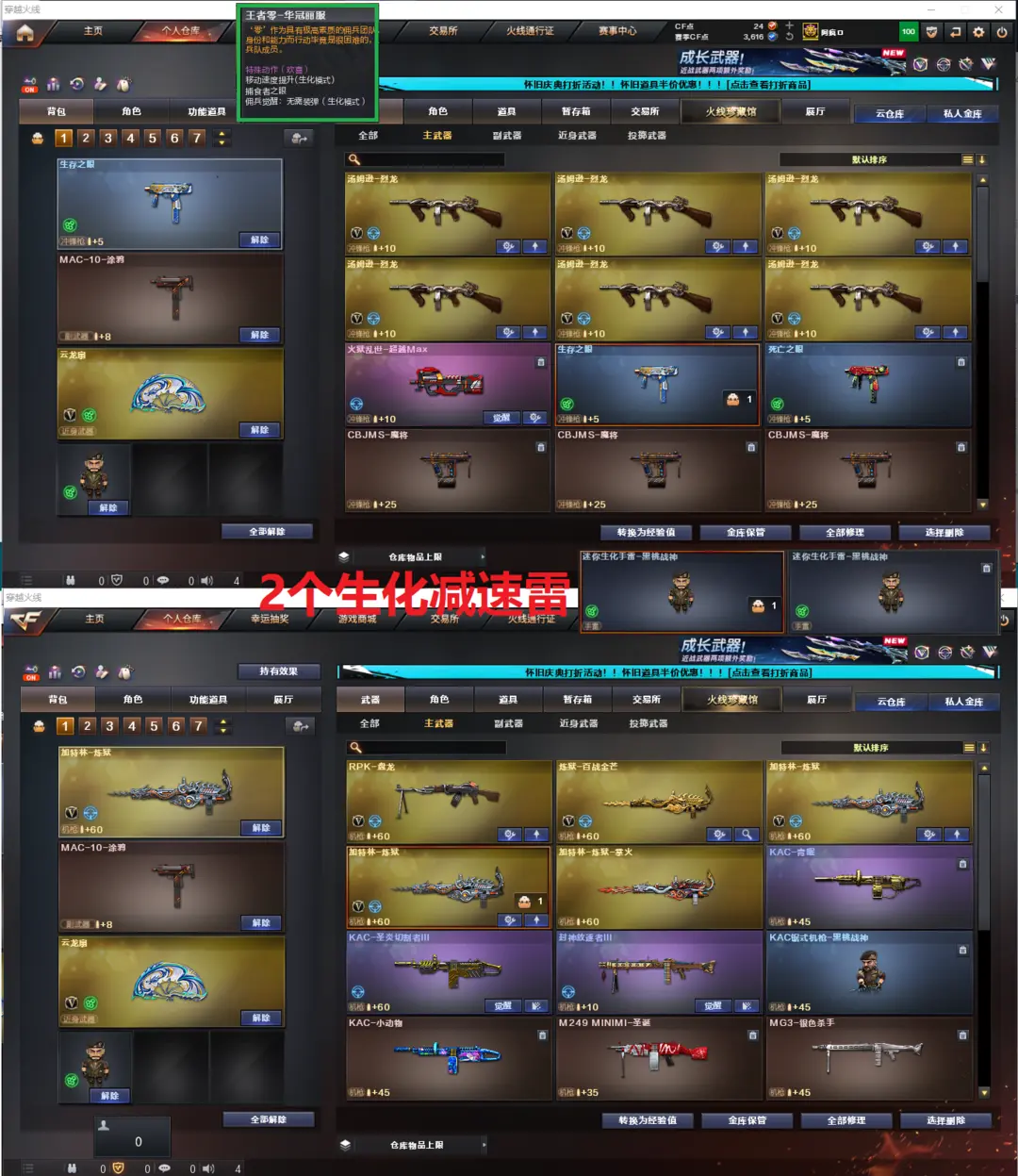 排位:可以、、、、、生化全装(可以看生化僵尸血量):无需换弹、6烈、盘龙、炼狱、死亡之眼、MAC-涂鸦、2个生化减速雷、超级对讲机、全部弹匣、、、、、、、爆破四防:M200-竞技荣光、传说幽瞳、王者风神、、、、、传说破晓、传说幽冥、USP神工天巧、2个柯尔特竞技荣光、世冠柯尔特、、、、G36幻影、QBZ威猛悍鲨、白虎、王者凌虎、、、裁决音效、白虎音效、毁灭音效、雷神音效、黑龙音效、朱雀音效、黑骑士音效、、、2套幻灵、7套竞技荣光、1套神工天巧、1套雷霆王者、、、生化角色(王者华冠丽服)爆破四防(云悠悠、王者惊若翩鸿、王者闭月羞花、职业经理)