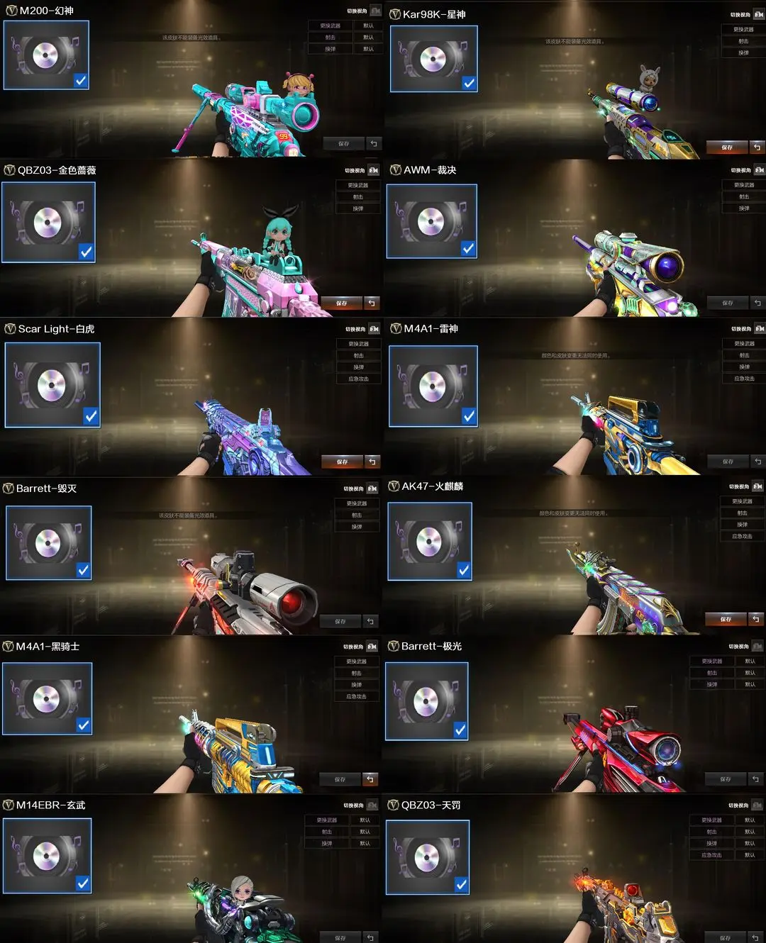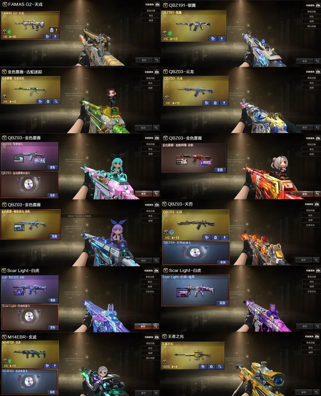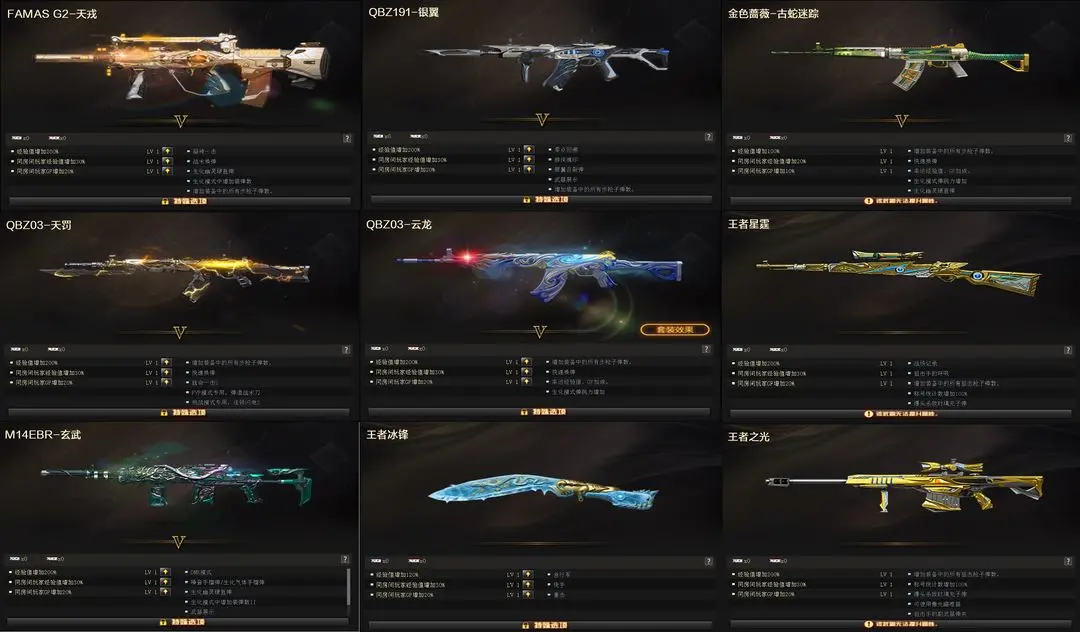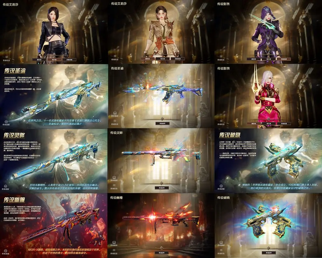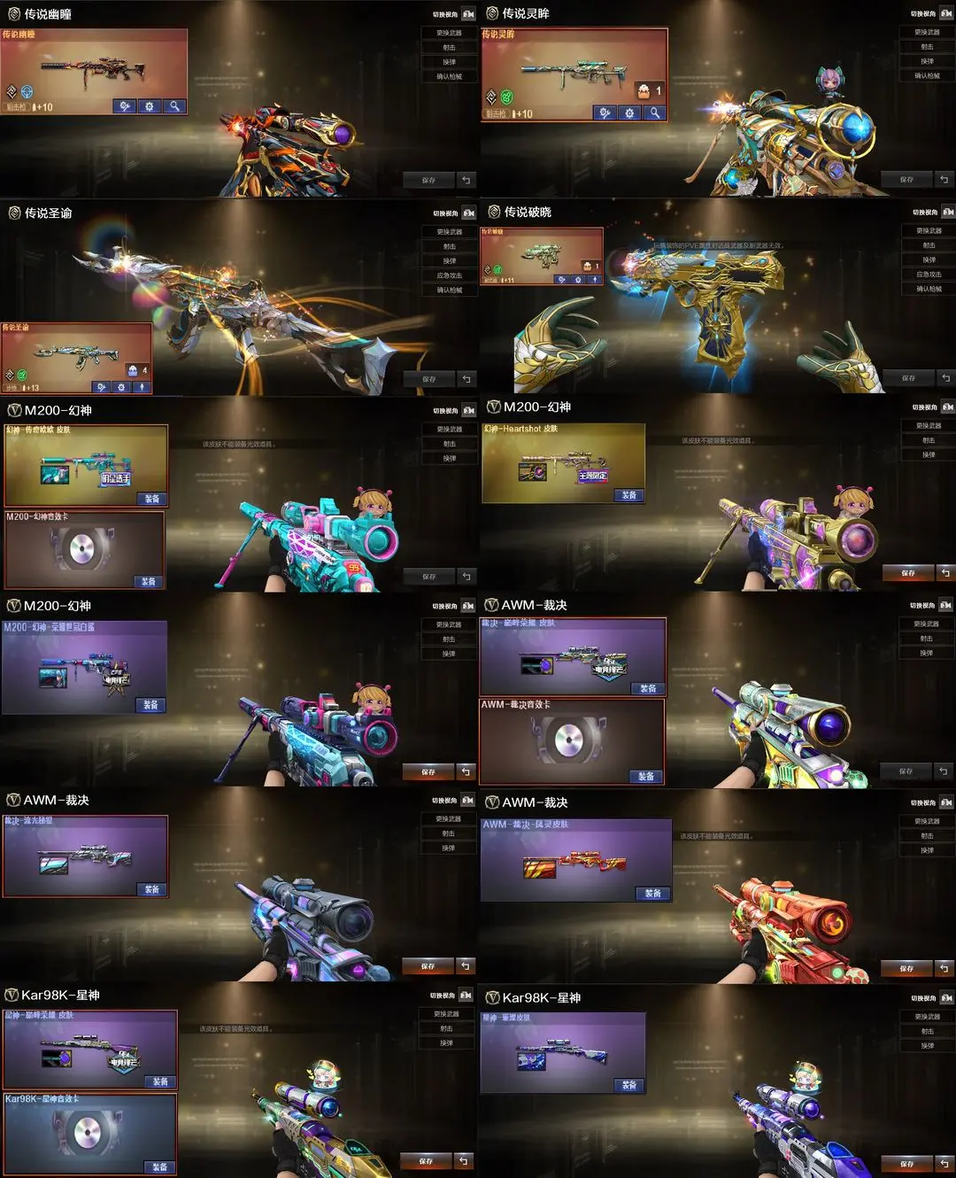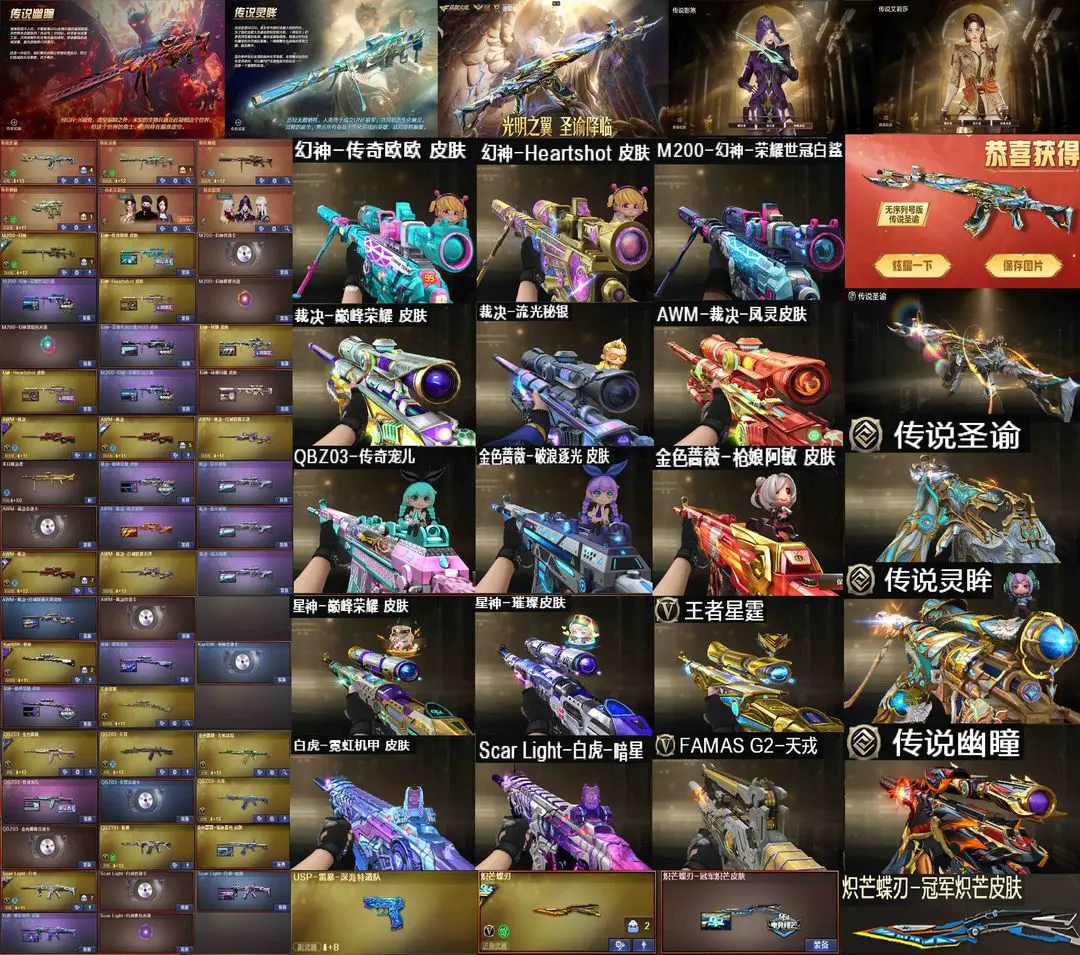 【装备道具】:传说圣谕/传说幽瞳/传说灵眸/传说破晓/传说艾莉莎/传说影煞★幻神-Heartshot/幻神-欧欧/M200-幻神-荣耀世冠白鲨/星神-巅峰荣耀 皮肤/星神-璀璨/幻神-Heartshot/幻神-欧欧/M200-幻神-荣耀世冠白鲨/星神-巅峰荣耀/星神-璀璨皮肤/雷神-R.LGD-S18冠军/雷神-冠军之魄/雷神-传奇N9/雷神-虎将/雷神-HeartShot/金色蔷薇-破浪逐光/金色蔷薇-枪娘阿敏/Scar-白虎-暗星/白虎-霓虹机甲/QBZ03-传奇宠儿/屠龙-破浪逐光/屠龙-巅峰荣耀/炽芒蝶刃-冠军炽芒/裁决音效卡/极光音效卡/98K-星神音效卡/M200-幻神音效卡/黑骑士音效卡/金色蔷薇音效卡/白虎音效卡/雷神音效卡/毁灭音效卡/火麒麟音效卡/天罚音效卡/玄武音效卡★QBZ191-银翼游侠/柯尔特-无冕之王/FAMAS G2-天戎//COP-云龙(2)/COP-幻灵/破空枪刃-夜魔/USP-雷暴/王者星霆/USP雷暴-深海特遣队★云龙套装★电竞教官-云悠悠/月兔特工/雾萌萌/晴雅/隼/岚兮儿/雨墨/华/王者玲珑/