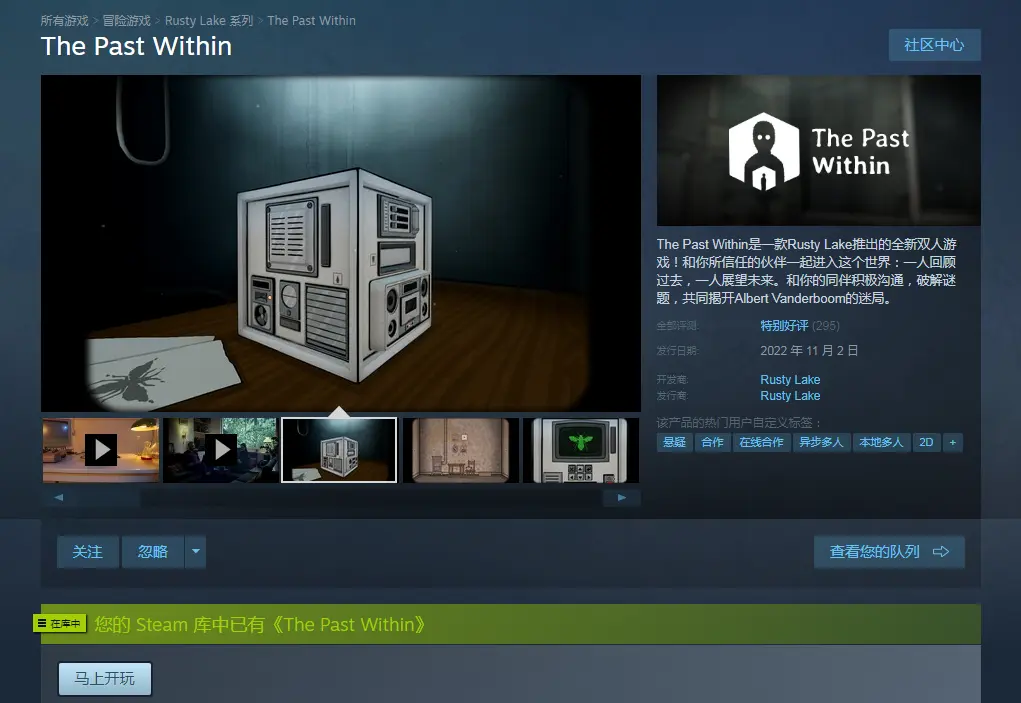 The Past Within是一款Rusty Lake推出的全新双人游戏!和你所信任的伙伴一起进入这个世界:一人回顾过去,一人展望未来。和你的同伴积极沟通,破解谜题,共同揭开Albert Vanderboom的迷局。
