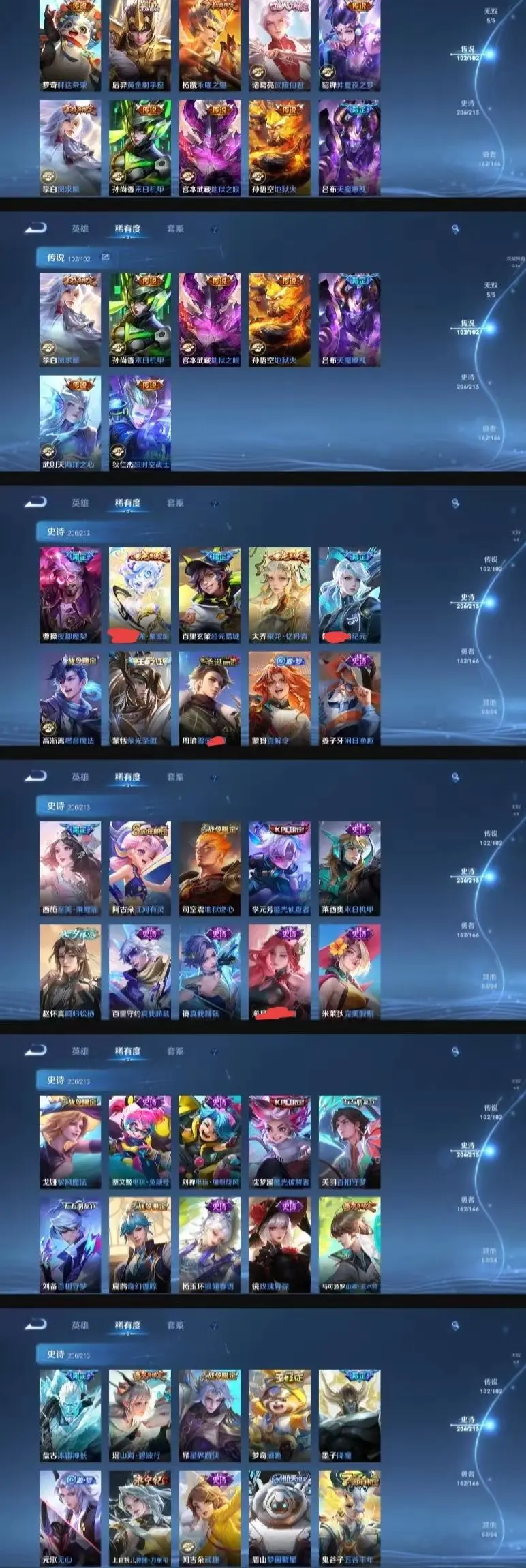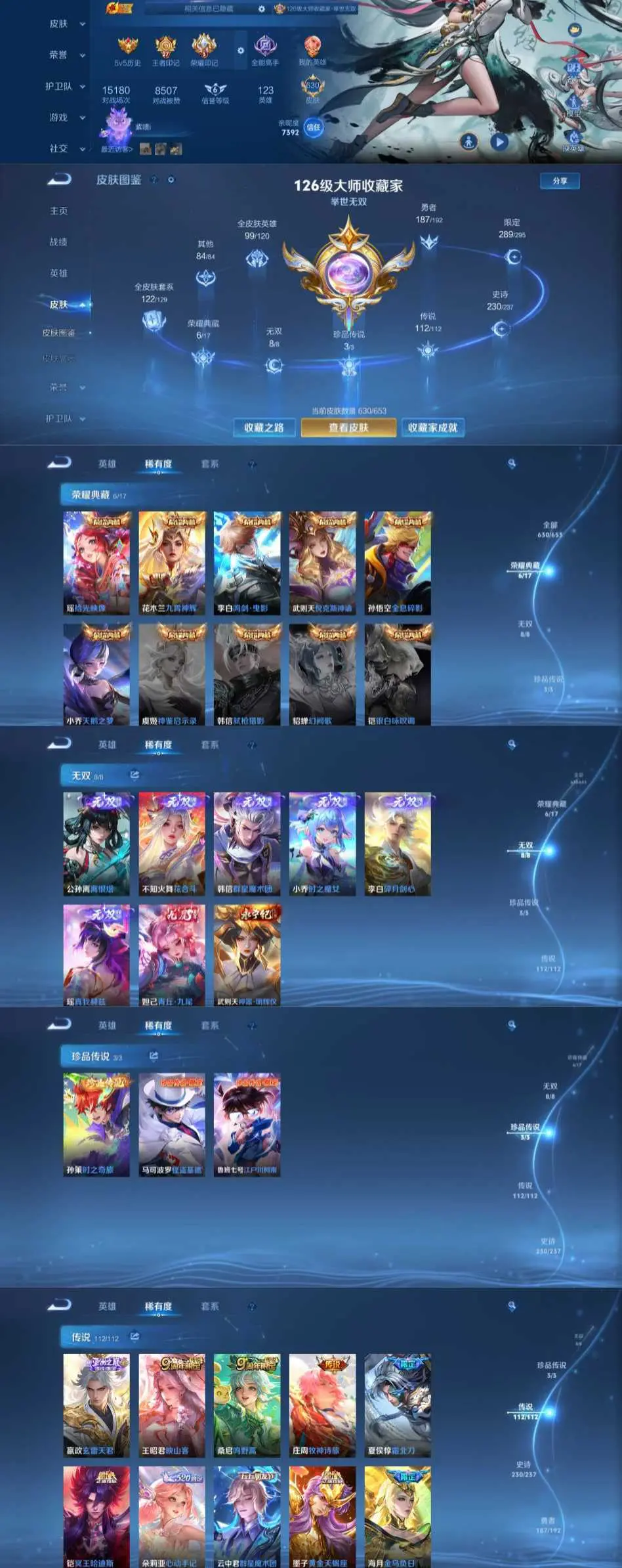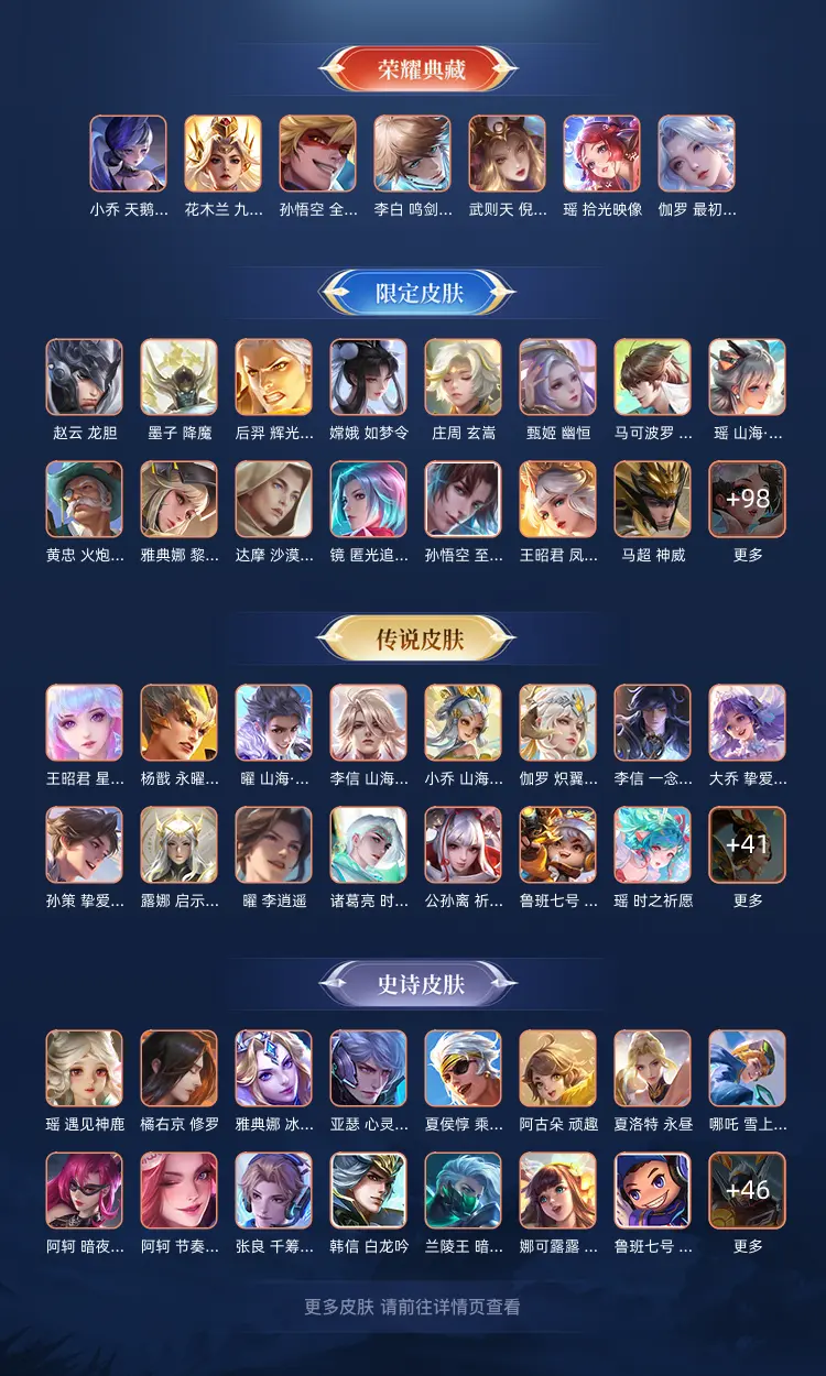 该号英雄123个皮肤680个,典藏8个,无双珍品1个,无双8个,珍品传说7个,星传说5个,传说105个,史诗210个,祝你游戏愉快~