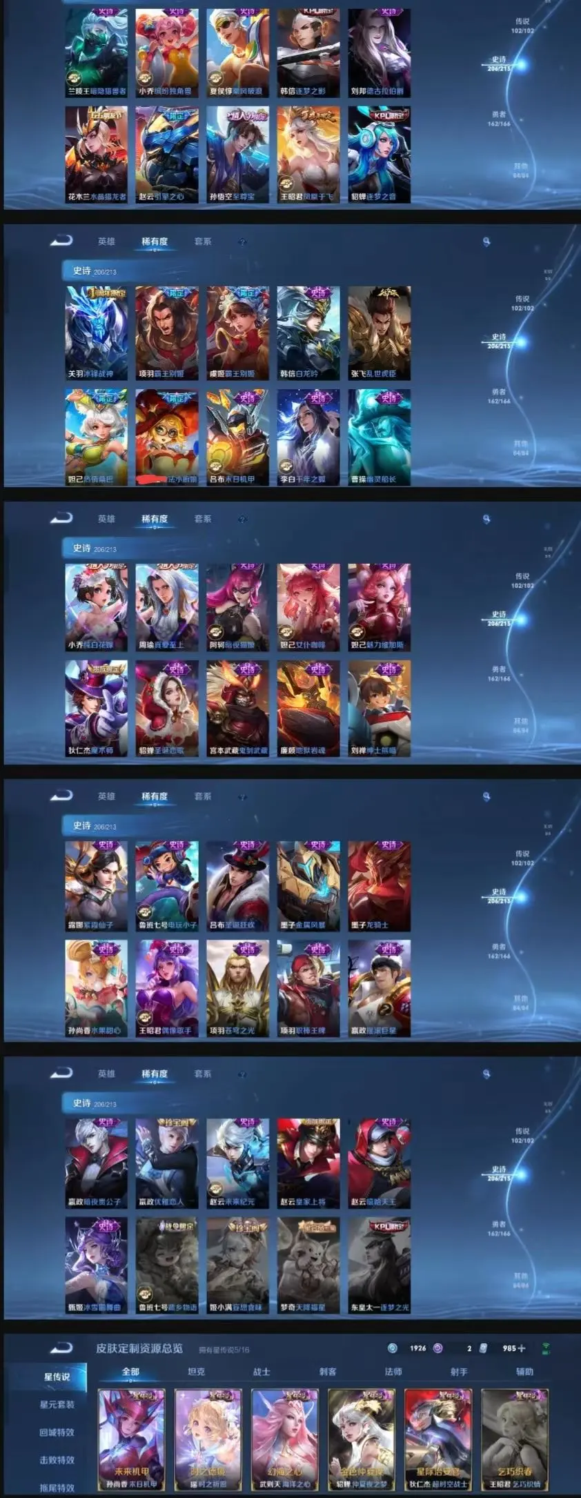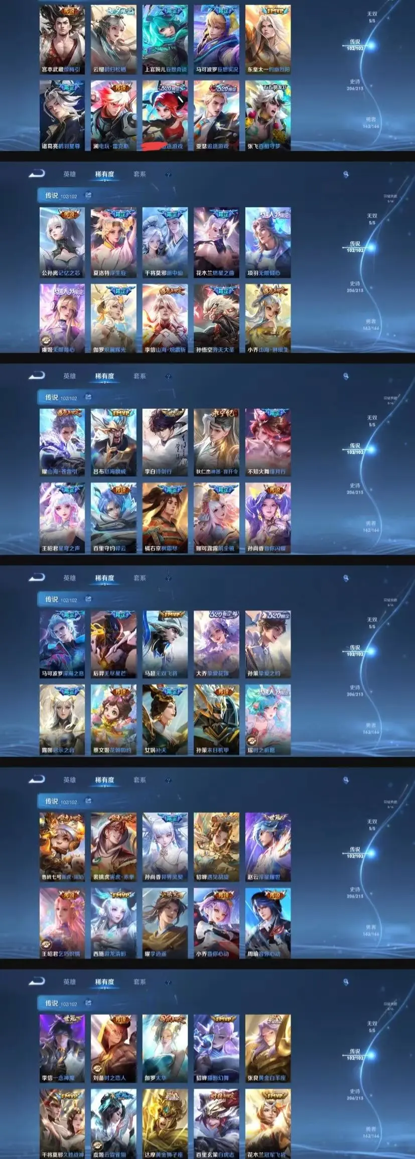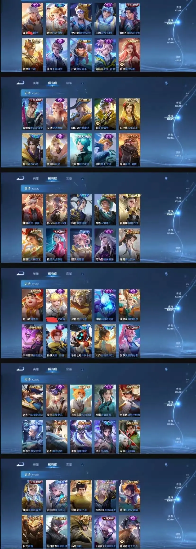 该号英雄123个皮肤680个,典藏8个,无双珍品1个,无双8个,珍品传说7个,星传说5个,传说105个,史诗210个,祝你游戏愉快~