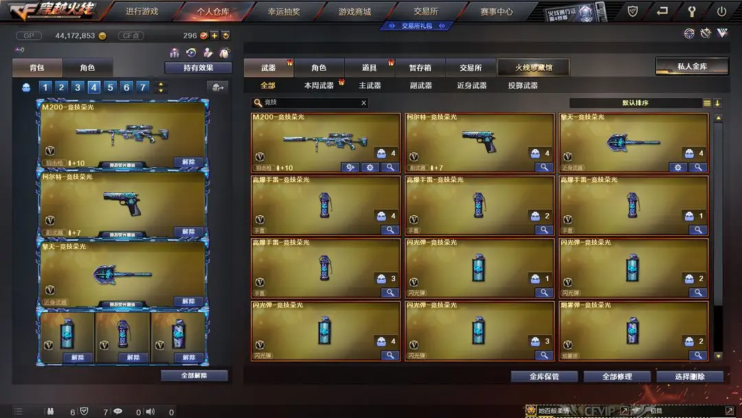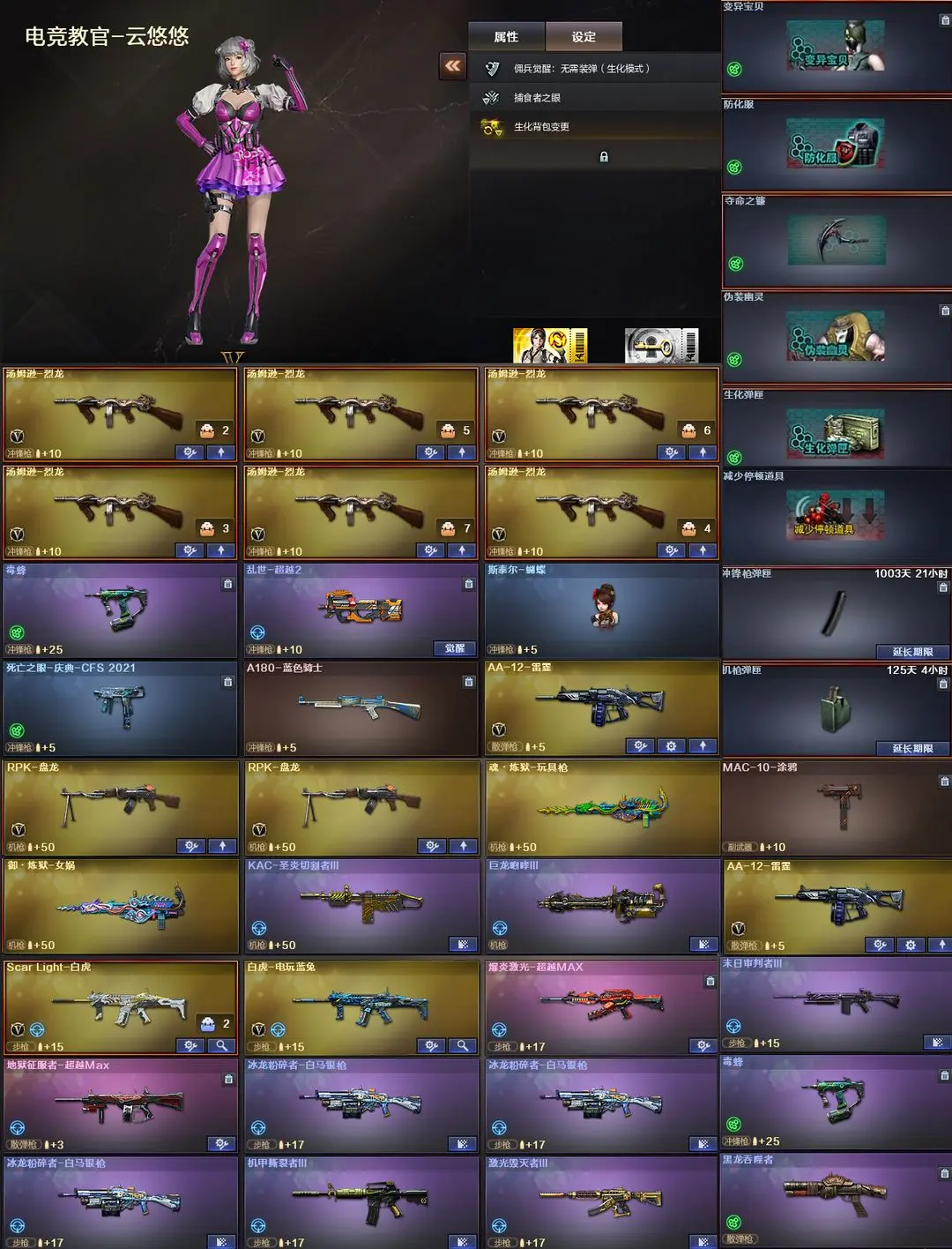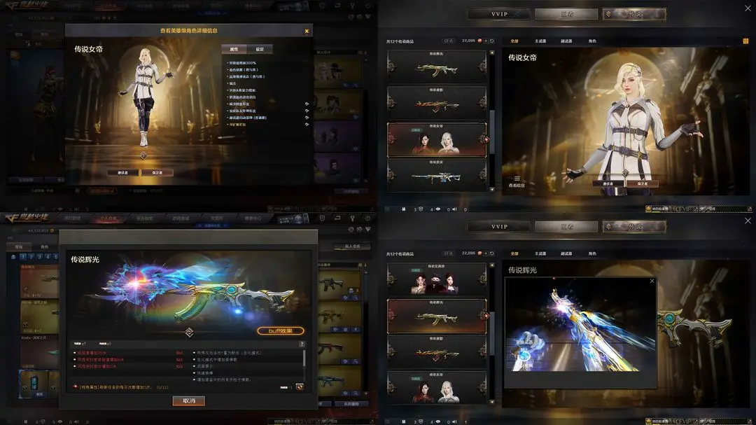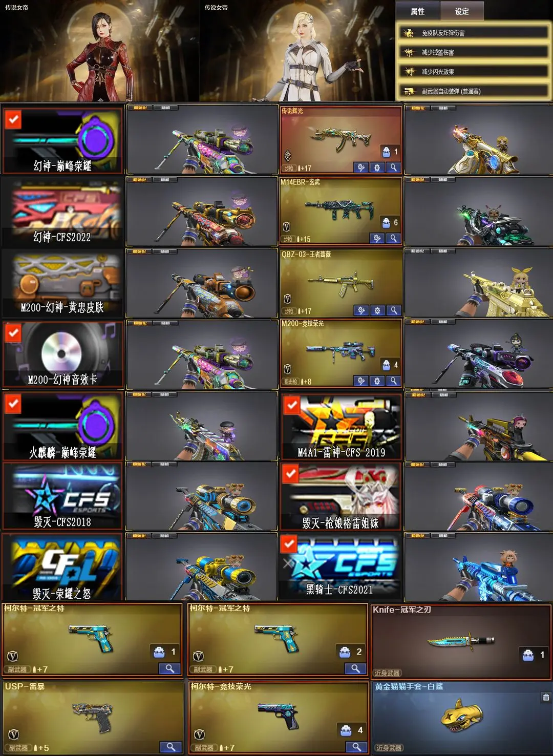 【装备道具】:传说女帝★传说辉光★M200-幻神★M200-幻神音效卡★幻神-黄忠皮肤幻神-巅峰荣耀幻神-CFS2022★Scar-白虎/白虎-电玩蓝兔/M14EBR-玄武★QBZ-冠军之薇★Knife-冠军之刃★柯尔特-双冠军之特★毁灭-枪娘巴雷特★毁灭-荣耀之怒★M4A1-雷神-CFS 2019★黑骑士-CFS2021★火麒麟-巅峰荣耀★毁灭-魔灵★毁灭-神秘黑洞★黄金猫猫手套-白鲨★★竞技荣光套装★传说女帝/荒漠琉璃/电竞教官-云悠悠/王者涂鸦/王者玲珑-小乔/王者-葵-貂蝉/王者零-华冠丽服/王者葵-惊若翩鸿/灵动武士/幽/流浪蔷薇/荆棘玫瑰/铁骑荣耀★斯泰尔-蝴蝶/夺魂★王者蔷薇-觉醒版★6烈龙炼狱盘龙★AA-12-雷霆★Glock18-武圣/柯尔特-冠军之特(2)/柯尔特-竞技荣光/USP-雷暴/擎天-竞技荣光★荣耀之证卡牌★变异宝贝死亡对讲机不退包★佣兵觉醒无需换弹手斧镜减速雷★捕食者之眼查看血量★