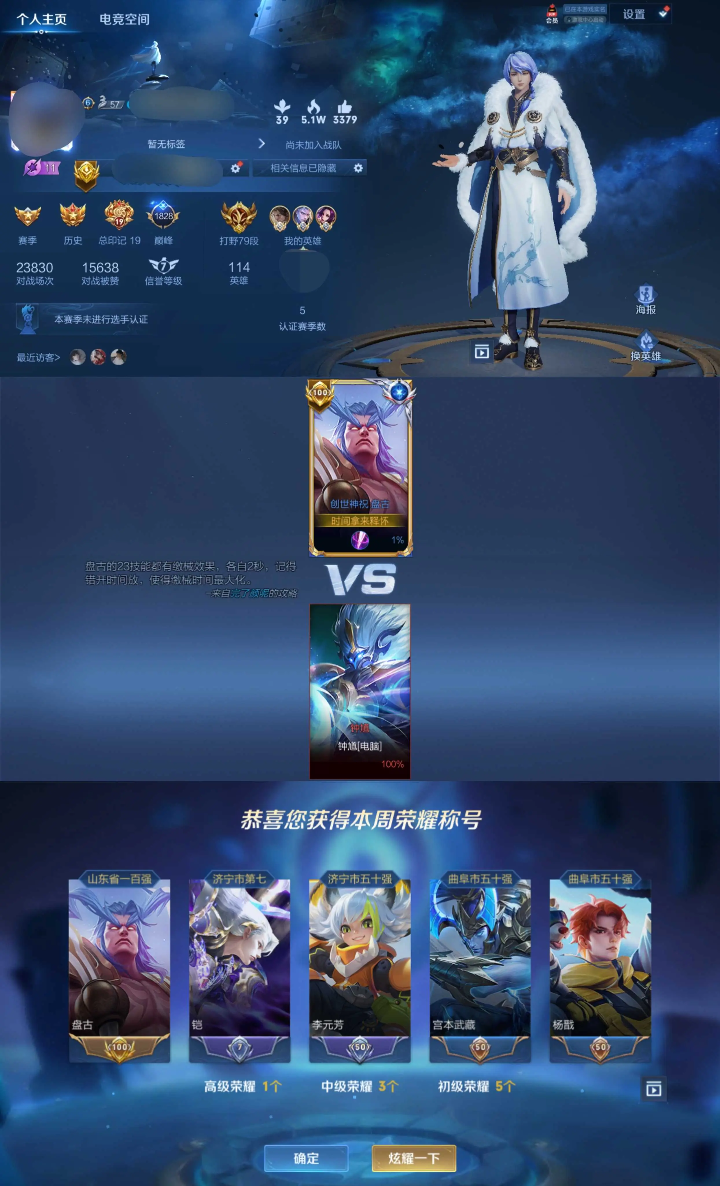 ★主页全国标★80段打野★巅峰历史2441★历史凯杨戬芈月曹操盘古宫本★银白咏叹调