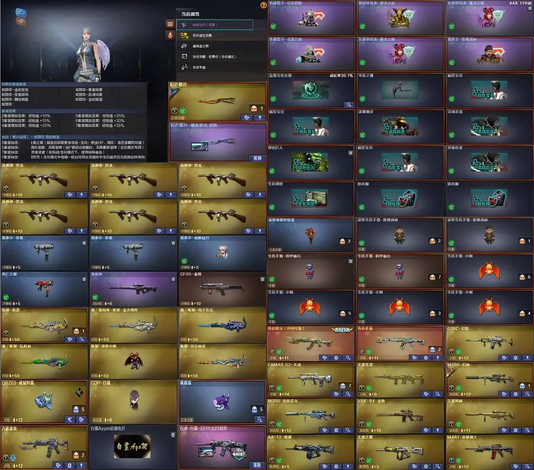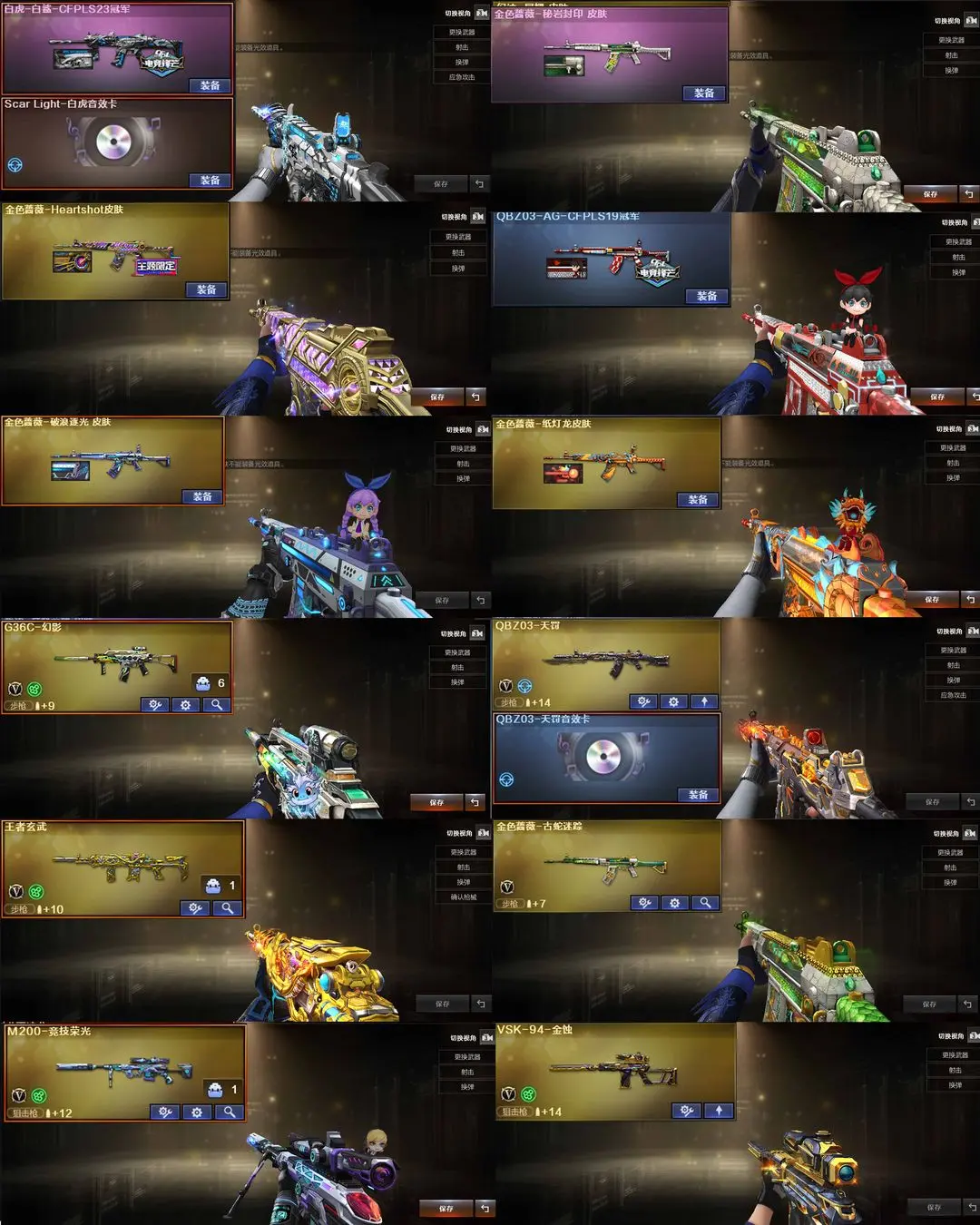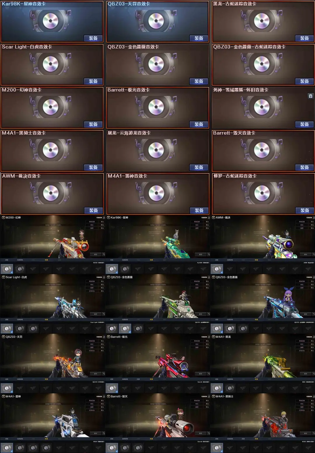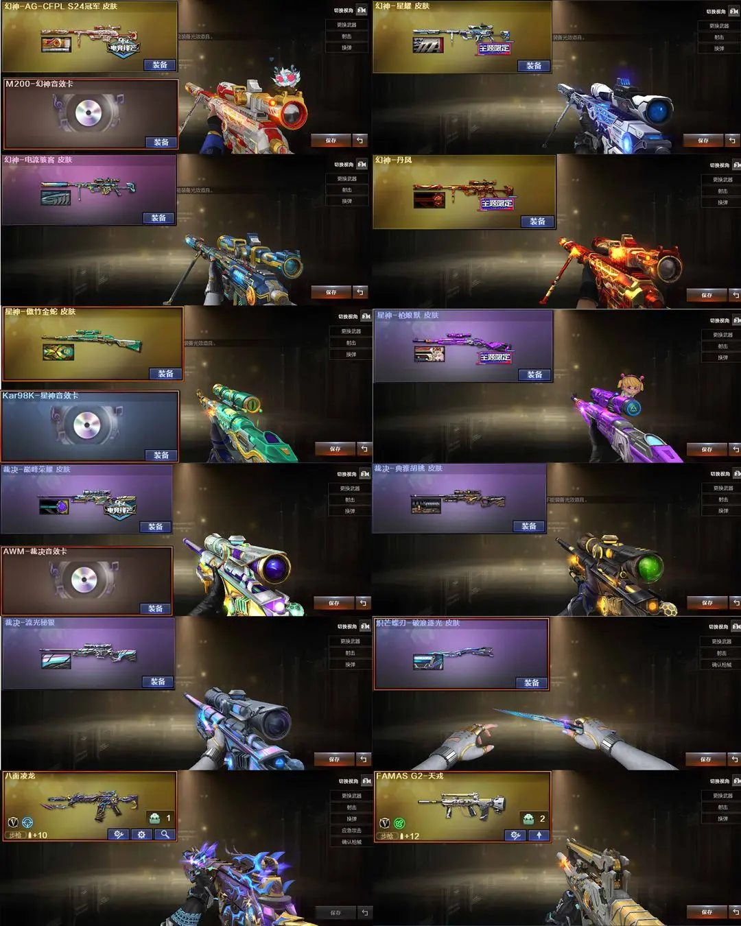 【装备道具】:传说星骇/传说圣谕/传说辉光/传说夜影★幻神-电流骇客/幻神-AG-CFPL S24冠军/幻神-丹凤/幻神-星耀/星神-傲竹金蛇/星神-璀璨★裁决-典雅胡桃/裁决-流光秘银/裁决-巅峰荣耀/黑龙-美杜莎/雷神-航星/金色蔷薇-秘岩封印/金色蔷薇-破浪逐光/金色蔷薇-Heartshot皮肤/金色蔷薇-纸灯龙/白虎-白鲨-CFPLS23冠军/QBZ03-AG-CFPLS19冠军/炽芒蝶刃-破浪逐光/裁决音效卡/极光音效卡/星神音效卡/幻神音效卡/黑骑士音效卡/金色蔷薇音效卡/白虎音效卡/雷神音效卡/毁灭音效卡/天罚音效卡/云海游龙音效卡/金色蔷薇-古蛇迷踪音效卡/FAMAS-天戎/G36C-幻影/八面凌龙/VSK-94-金蚀/王者风神/柯尔特-竞技荣光/USP-雷暴/王者蔷薇/炽芒蝶刃/金色蔷薇-枪娘阿敏★炫/电竞教官-云悠悠/关小雨/机械姬/星际战将/王者玄武/王者风武/王者青龙/王者玉锋/炼狱-迷你小钢/斯泰尔-枪娘暗刃/★竞技荣光套装★★生化弹夹防化服变异宝贝死亡之眼对讲机不退包★佣兵觉醒无需换弹手斧镜减速雷★捕食者之眼查看血量★