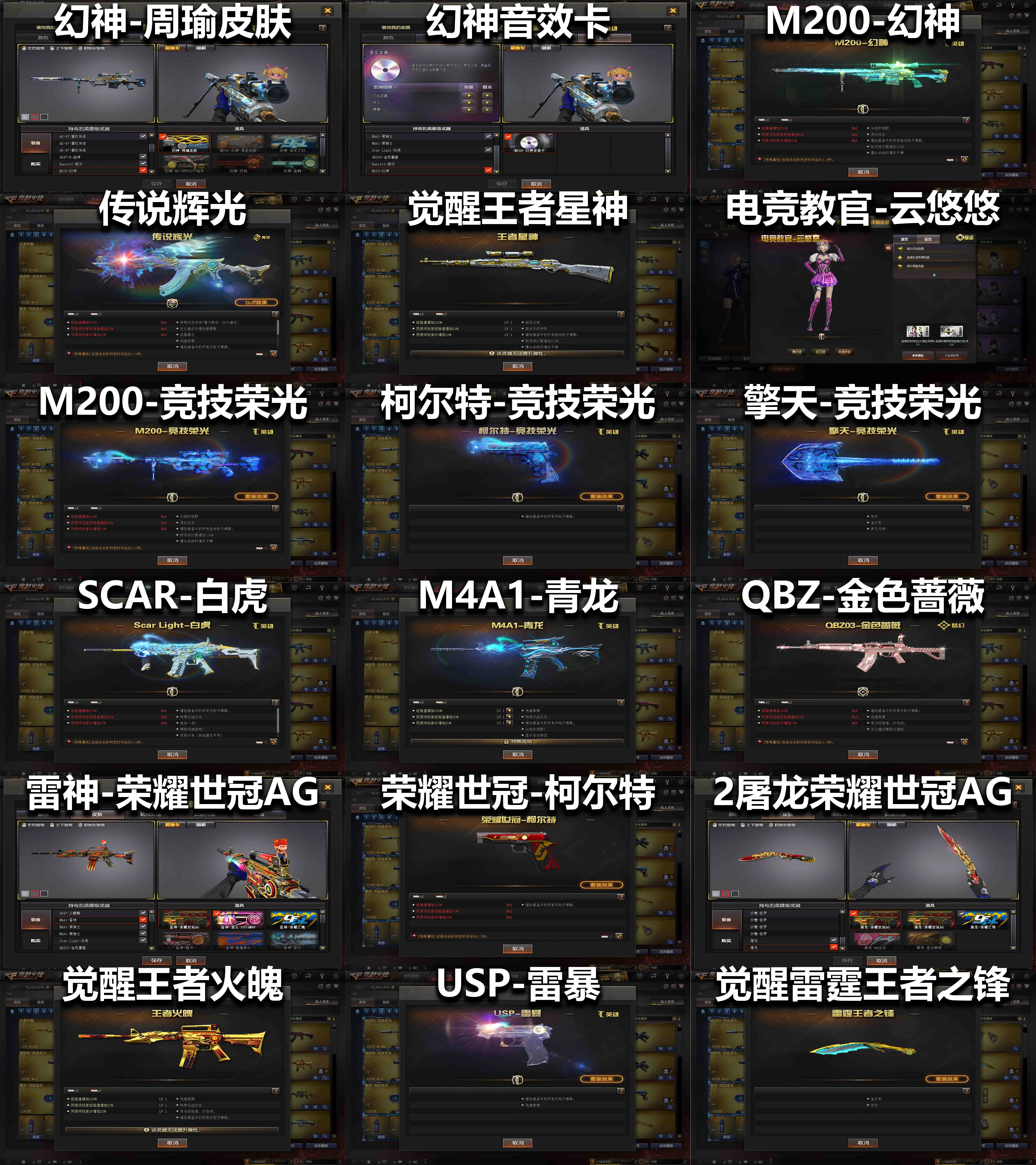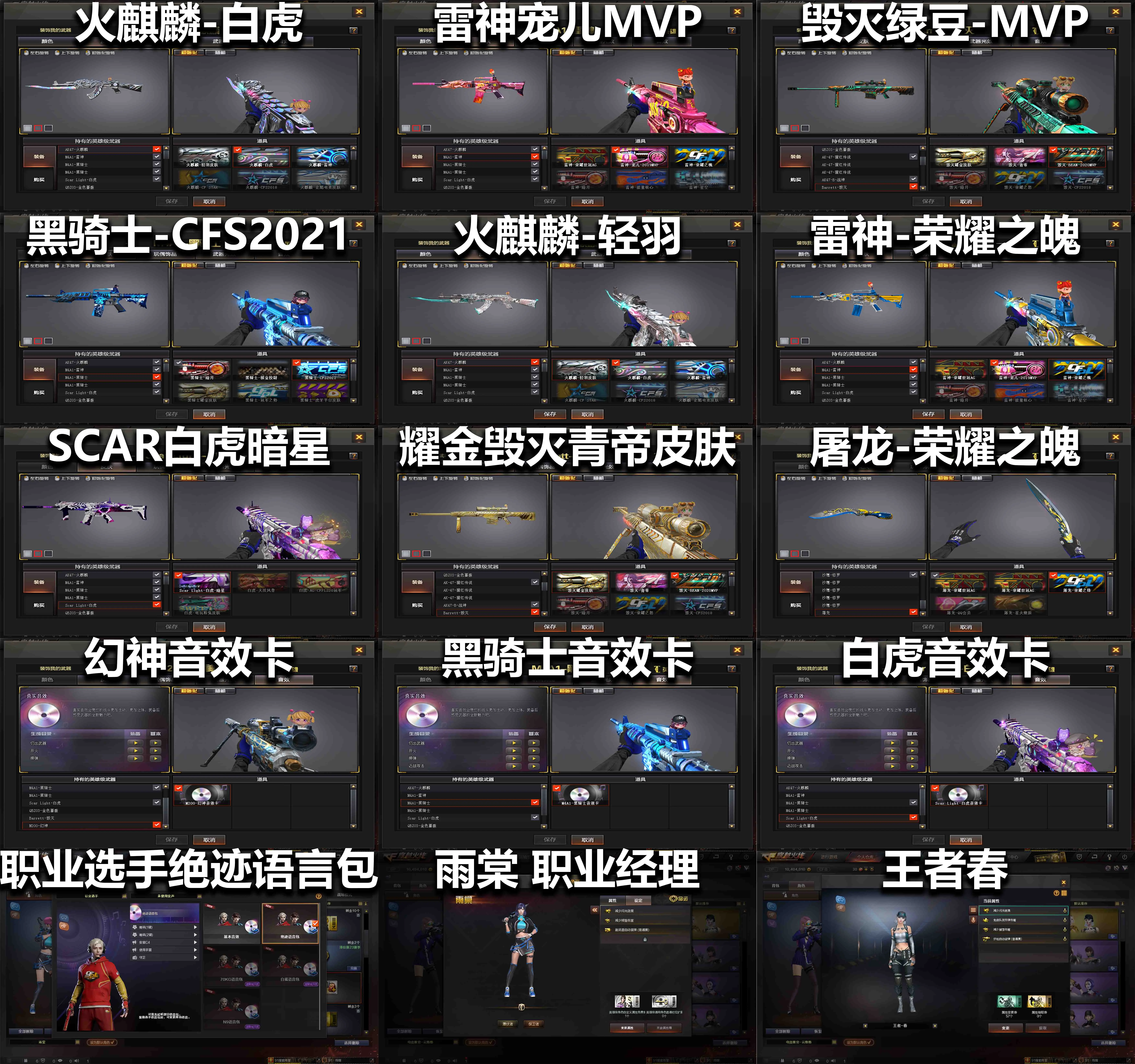 【装备道具】:新2022幻神★幻神-CFS2022★火麒麟-巅峰荣耀★赛事荣耀套★雷神荣耀之魄★毁灭荣耀之怒★屠龙荣耀之锋★雷神杨戬皮肤★幽雷霆王者★COP雷霆王者★雷霆王者之锋★雷神虎将皮肤★火麒麟华夏之心★火麒麟轻羽★黑龙361★黑武士361皮肤★黑骑士耀金★雷神耀金★王者玲珑★王者玉锋★4音效★毁灭音效卡雷神音效卡黑骑士音效卡黑龙音效卡★1白鲨语言包★职业选手★王者之心王者之魄王者之怒王者之武王者之击王者之啸★雷霆王者投掷物芳心审判者★葵樱★5烈龙炼狱裁决★幻灵之锋★金刚伞★COP旗袍★黄金生化钩★降世魔童★★★生化弹夹防化服变异宝贝死亡之眼对讲机不退包★佣兵觉醒无需换弹手斧镜减速雷★捕食者之眼查看血量★爆破生化挑战全装