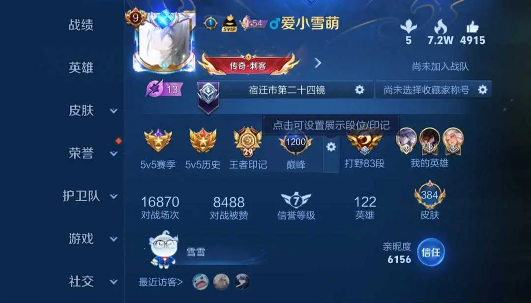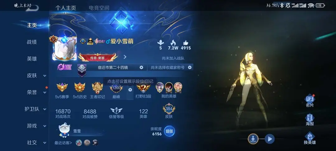本游戏账号: V9用户,基础段位:最强王者,英雄多,皮肤多。典藏皮肤2个,感受典藏皮肤带来的优质体验快感,FMVP皮肤7个,尽情享受FMVP皮肤带来的主角光环, 私人所属英雄皮肤有:瑶 拾光映像||孙悟空 全息碎影孙策 时之奇旅||花木兰 燃星之曲||桑启 鸣野蒿||鲁班七号 江户川柯南||马可波罗 怪盗基德||澜 电玩·雷克斯||娜可露露 前尘镜||墨子 黄金天蝎座||露娜 霜月吟||貂蝉 曦玄引||赵云 乘龙·铭钟鼎||孙策 乘龙·淬吴钩||孙尚香 乘龙·问璇玑||马超 琥珀纪元||马可波罗 深海之息||公孙离 记忆之芯||夏洛特 浮生妄||曜 山海·苍雷引||不知火舞 绯月行||李白 诗剑行||上官婉儿 神器·万象笔||百里守约 碎云||橘右京 枫霜尽||曜 李逍遥||公孙离 祈雪灵祝||虞姬 启明星使||李信 一念神魔||吕布 天魔缭乱||张良 黄金白羊座||杨戬 永曜之星||伽罗 太华||狄仁杰 超时空战士||宫本武藏 地狱之眼||后羿 黄金射手座||达摩 黄金狮子座|