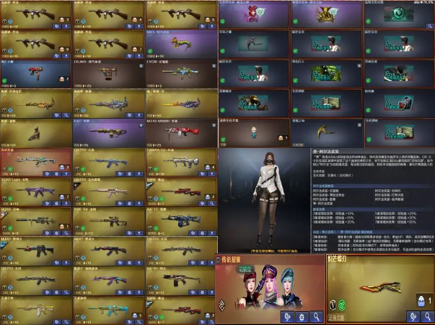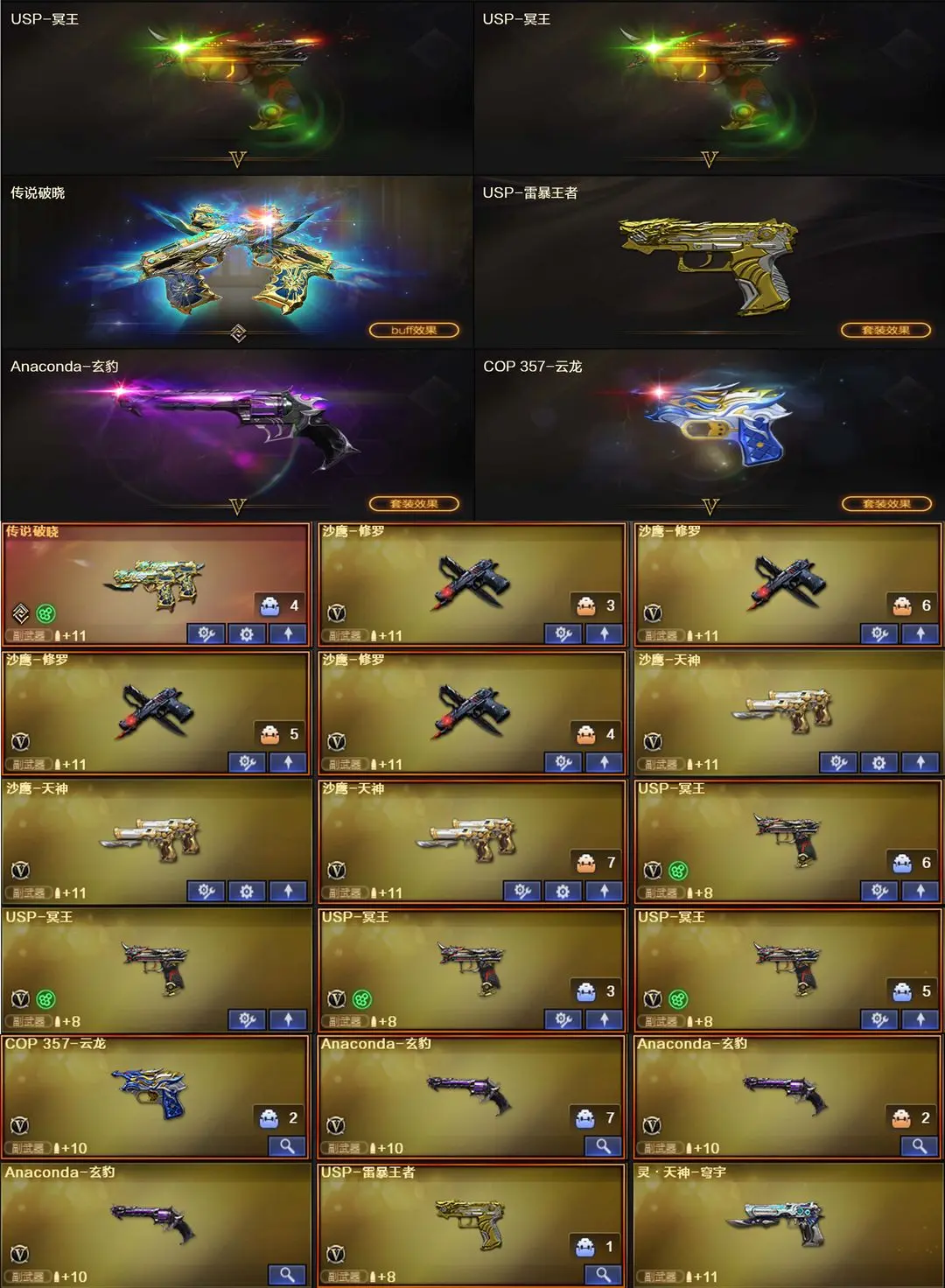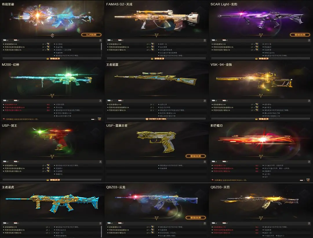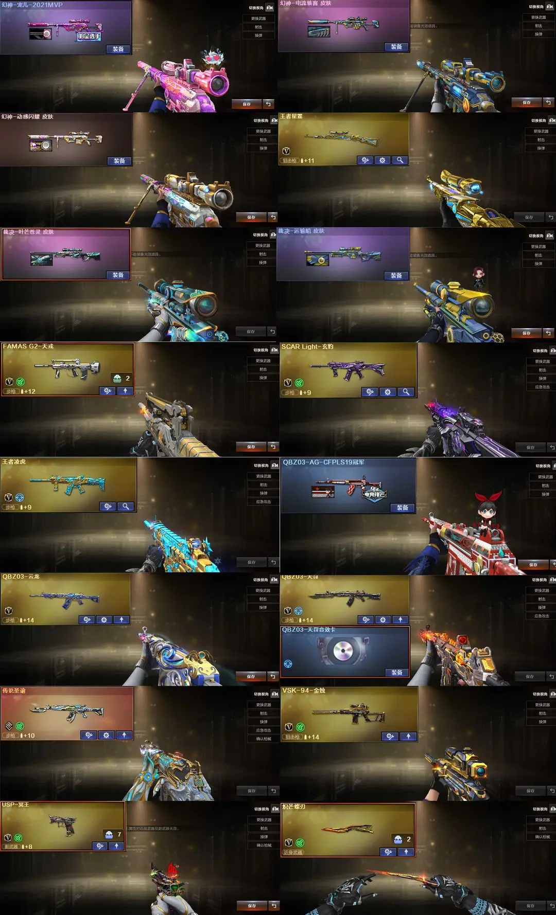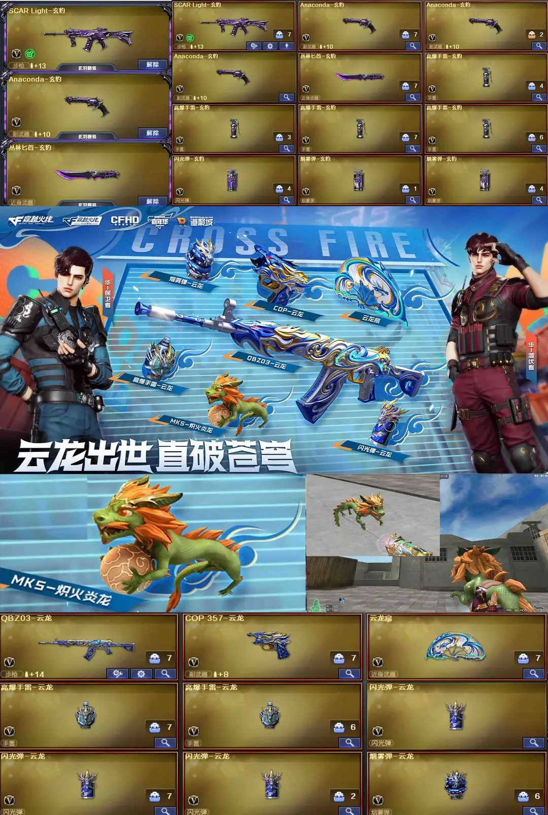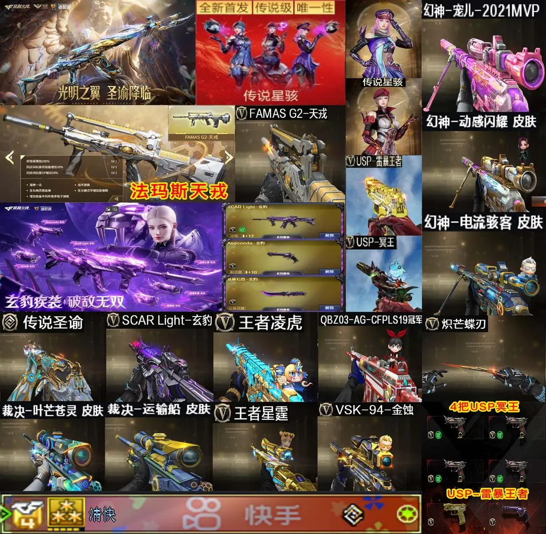 【装备道具】:传说圣谕/传说破晓/传说星骇//FAMAS G2-天戎/VSK-94-金蚀/炼狱-百战金芒/USP-冥王4把/SCAR Light-玄豹/炽芒蝶刃/幻神-电流骇客 皮肤/幻神-动感闪耀 皮肤/幻神-宠儿-2021MVP/星神-璀璨皮肤/巴雷特-毁灭-CFPL冠军/裁决-运输船 皮肤/裁决-叶芒苍灵 皮肤/火麒麟-巅峰荣耀/M4A1-雷神-拼搏//雷神-R.LGD-CFPLS18冠军/雷神-传奇N9/黑骑士-CFS2021/QBZ03-AG-CFPLS19冠军/天启-黯钢战甲/屠龙-星火燎原/幻神音效卡/天罚音效卡/黑骑士音效卡/裁决音效卡/炼狱-百战金芒-庆典舞曲音效卡/加特林-炼狱/COP 357-云龙/QBZ03-云龙/QBZ03-天罚(2)/QBZ03-金色蔷薇/王者凌虎/王者星霆/USP-雷暴王者/王者冰锋3把/魅影/华/M200-幻神//云龙套装/玄豹套装/丛林匕首-玄豹/炼狱-秦师/MK5-炽火炎龙/6烈龙炼狱/佣兵觉醒/捕食者之眼