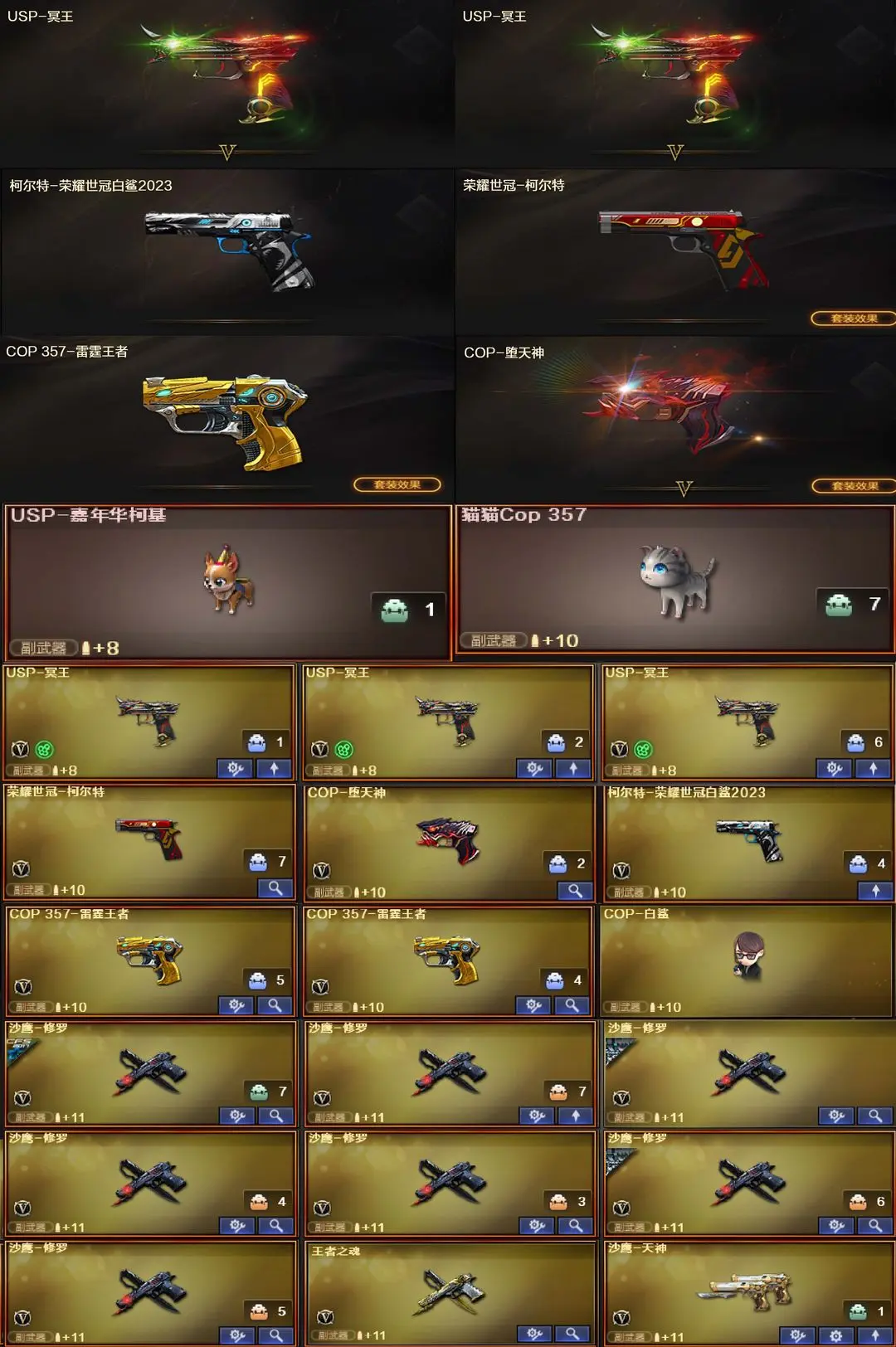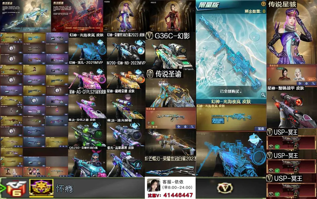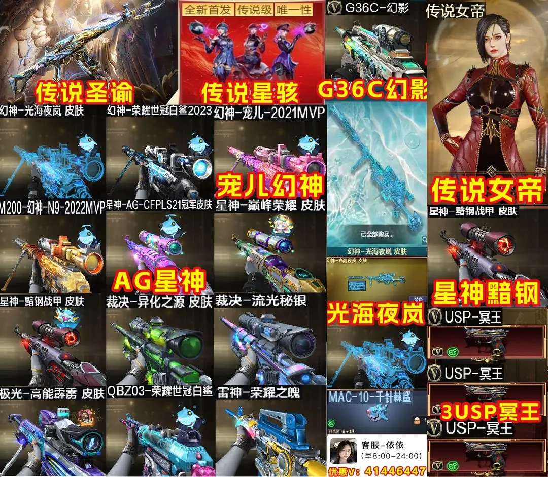 【装备道具】:传说女帝/传说星骇/传说圣谕/传说梦魇★光海夜岚幻神皮肤★幻神-荣耀世冠白鲨2023/M200-幻神-N9-2022MVP/幻神-宠儿-2021MVP/幻神-周瑜/星神-巅峰荣耀 皮肤/Kar98K-星神-AG-CFPLS21冠军/极光-能量核心/极光-高能霹雳/裁决-流光秘银/裁决-异化之源/裁决-羽掣/金色蔷薇-Heartshot/QBZ03-荣耀世冠白鲨金色蔷薇-Heartshot/QBZ03-荣耀世冠白鲨/裁决音效卡/极光音效卡/Kar98K-星神音效卡/M200-幻神音效卡/毁灭音效卡/★柯尔特-荣耀世冠白鲨2023//G36C-幻影/王者雷怒/王者之霆/王者冰锋/炼狱-迷你小钢/斯泰尔-蝴蝶/M37-葵/COP-白鲨/USP-嘉年华柯基/猫猫Cop 357/COP-堕天神/COP 357-雷霆王者-觉醒版(2)/炽芒蝶刃/王者白虎/HK417-朱雀/王者蔷薇-觉醒版/王者之决-觉醒版//王者蔷薇/雷霆王者★堕天神套装/雷霆王者套装/臻选金狐套装★6烈龙6盘龙炼狱-悦蓝惊涛骇浪★双面神挑战全套★异变清道夫★隼/枪娘樱/职业经理/王者炫/迷你生化手雷小钢末日审判者