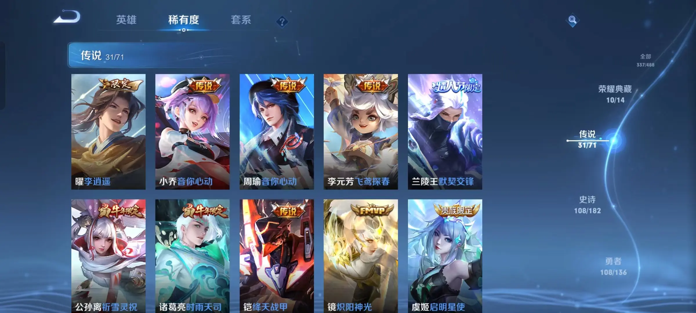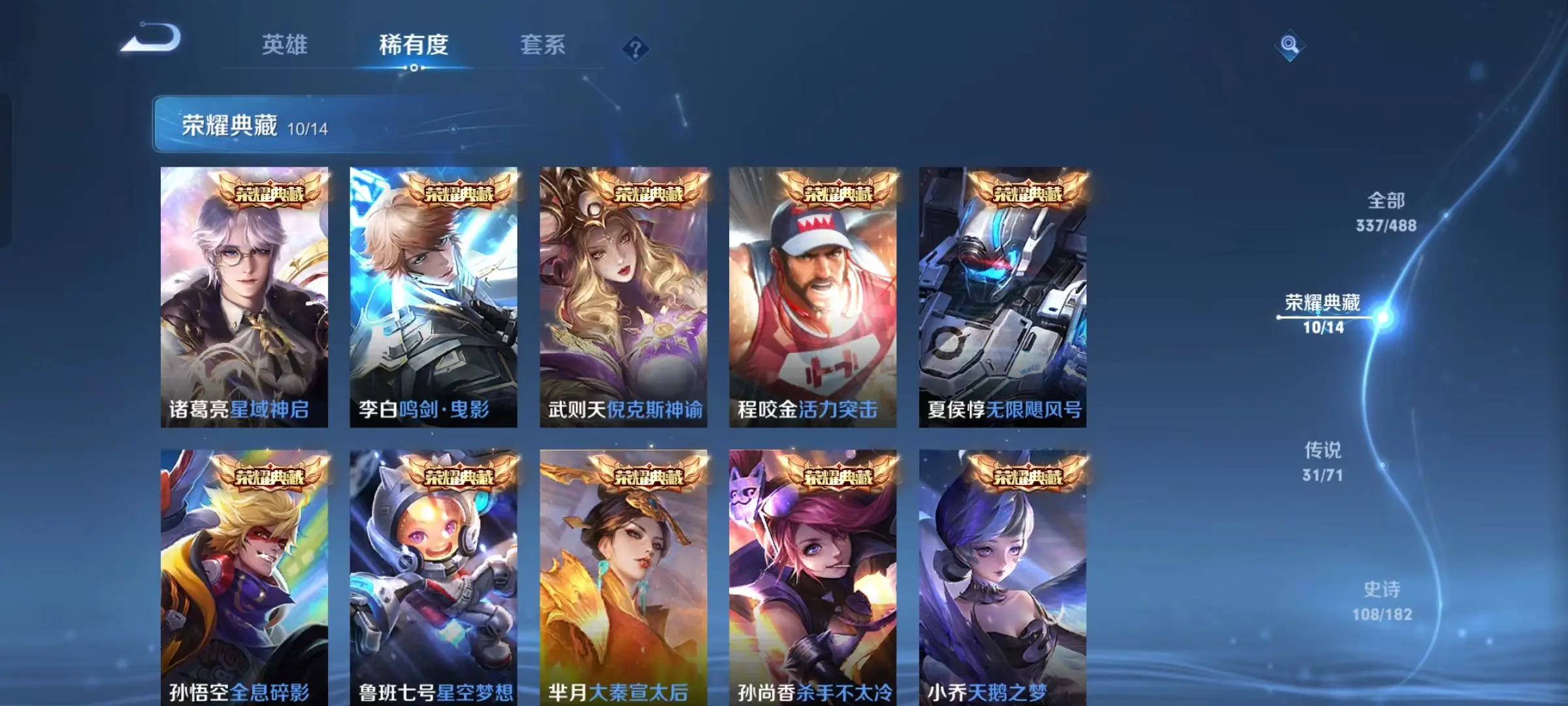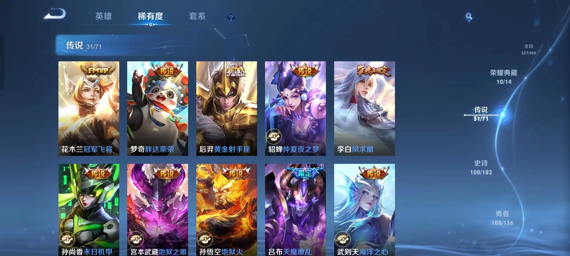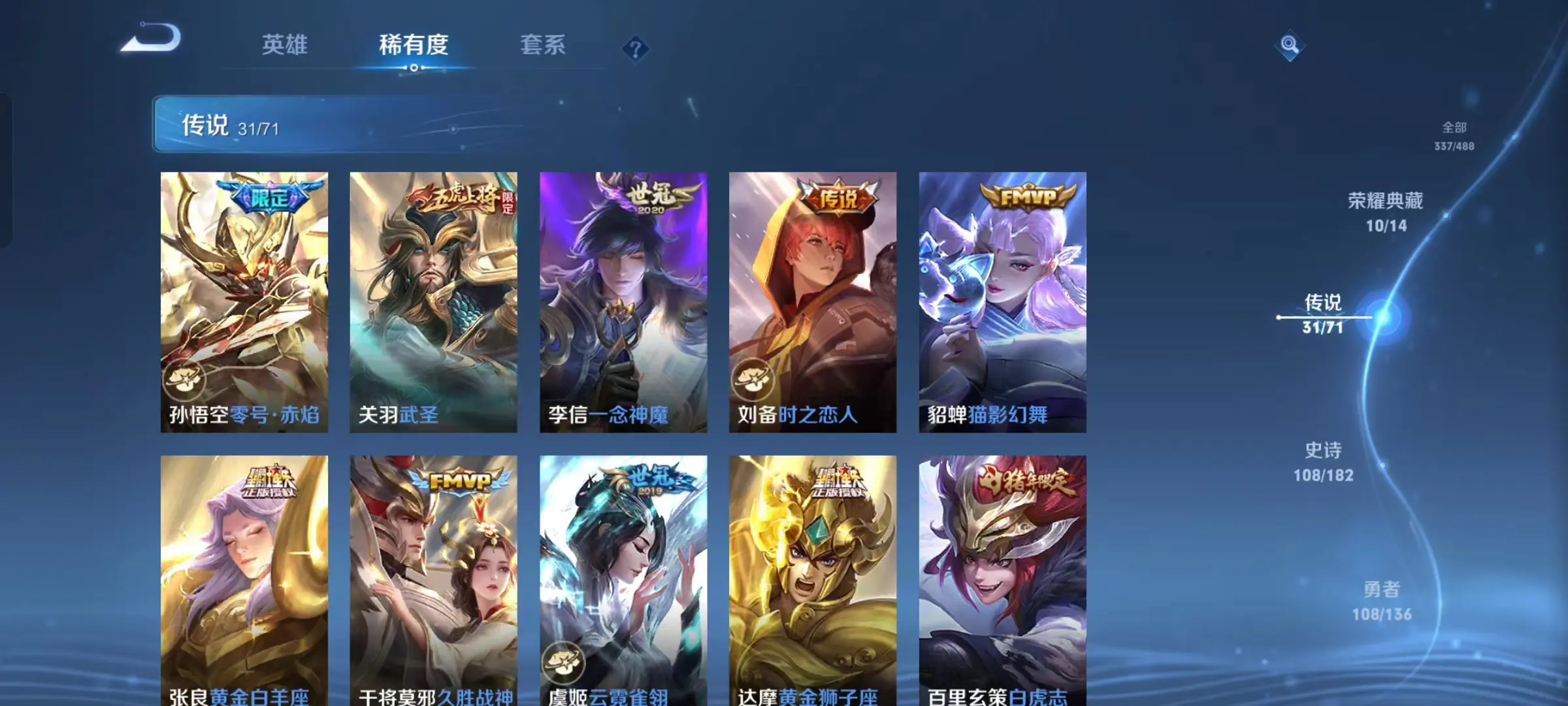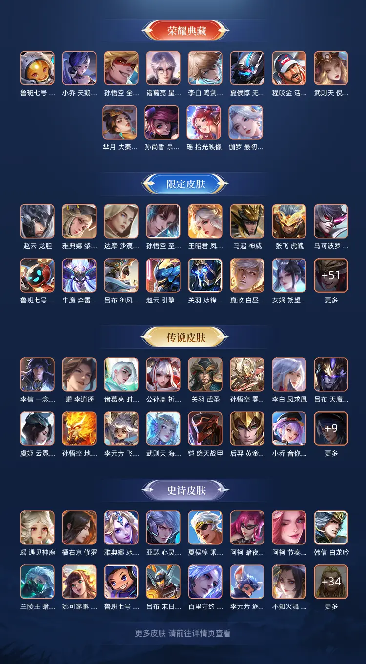 本游戏账号: V9用户,基础段位:至尊星耀IV,英雄多,皮肤多。典藏皮肤10个,感受典藏皮肤带来的优质体验快感,FMVP皮肤4个,尽情享受FMVP皮肤带来的主角光环, 私人所属英雄皮肤有:孙悟空 全息碎影||夏侯惇 无限飓风号||诸葛亮 星域神启||孙尚香 杀手不太冷||武则天 倪克斯神谕||李白 鸣剑·曳影||鲁班七号 星空梦想||芈月 大秦宣太后||小乔 天鹅之梦||程咬金 活力突击,等等