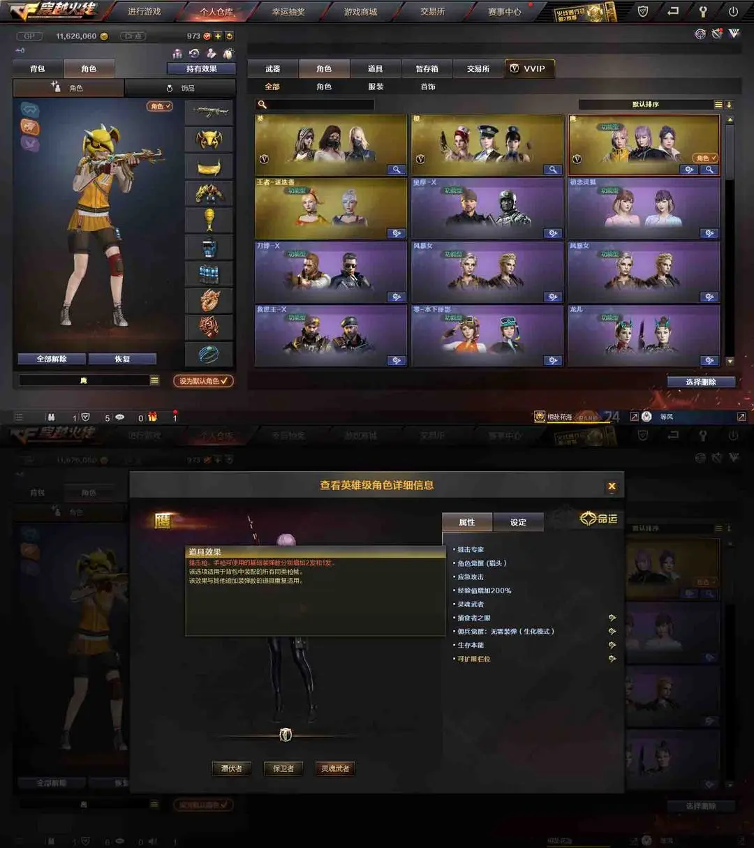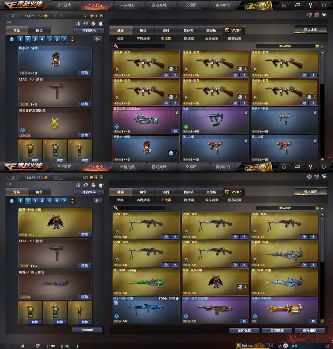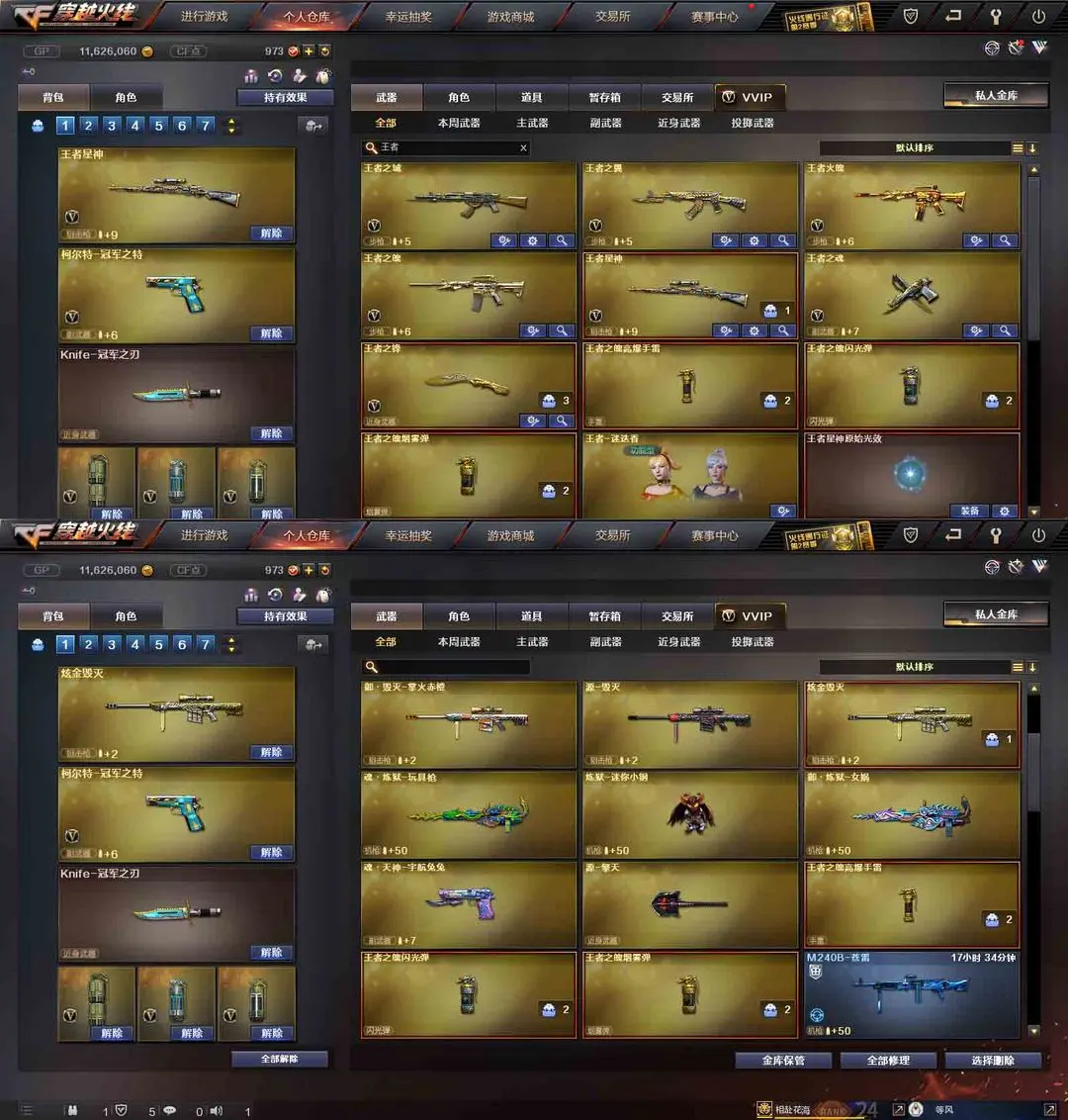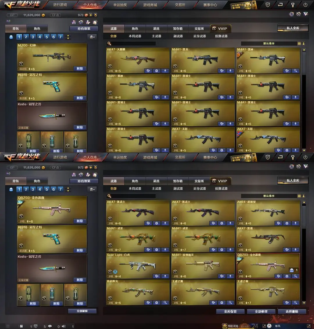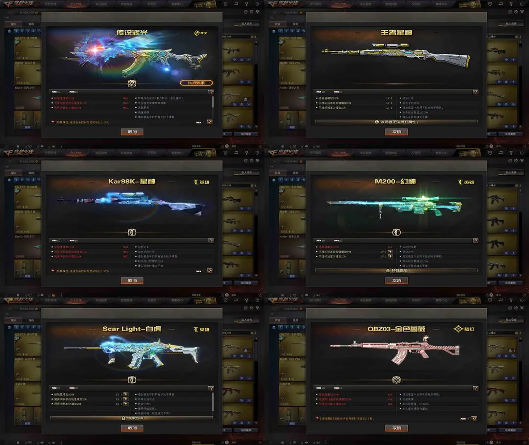 【装备道具】:QBZ-冠军之薇★Knife-冠军之刃★柯尔特冠军之特★修罗冠军之魂★传说辉光★M200-幻神★98K-星神★觉醒王者星神★王者迷迭香★鹰狙击专家★SCAR-白虎★QBZ-金色蔷薇★雷神葫芦兄弟★白虎电玩蓝兔★觉醒王者之魄王者之翼王者之城王者之魂王者之锋★炫金毁灭炫金超新星★★葵樱★炼狱-迷你小纲★毒蜂★斯泰尔蝴蝶★6黑骑士★6烈龙★6盘龙炼狱★集束激光-超越max★暴君乱世-超越MAX★激光毁灭者★深渊巨龙咆哮★征服者超越★阐释者★死亡之眼★金刚伞★海滩汪汪-巴雷特★MAC-10-涂鸦★迷你手枪★胡萝卜匕首★★爆破生化挑战全装★生化弹夹防化服变异宝贝死亡之眼★佣兵觉醒手斧镜减速雷★捕食者之眼死亡之眼超级对讲机不退包★超级背包无需换弹查看血量★