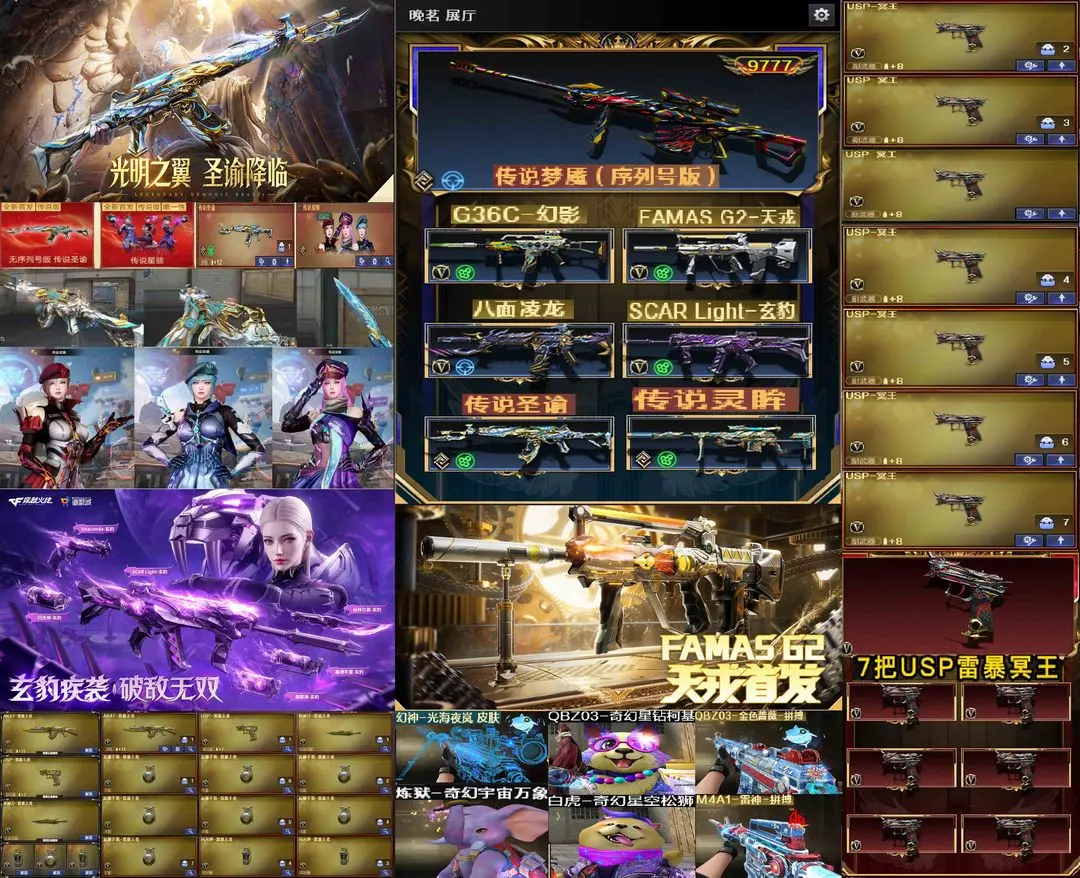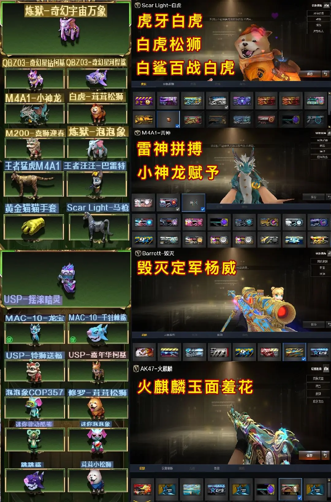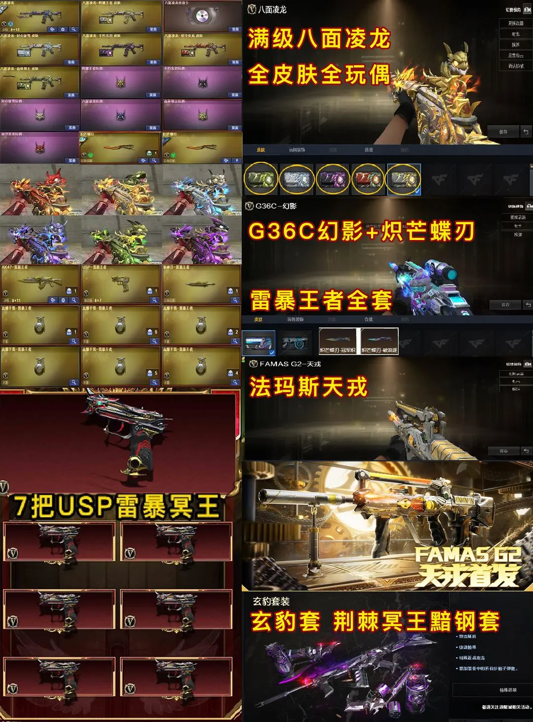 【装备道具】:满氪金拼搏/奇幻全套动物园/满级八面凌龙全皮肤全玩偶音效/炼狱-奇幻宇宙万象/炼狱-泡泡象/传说影煞/传说星骇/传说圣谕/传说梦魇(序列号版)/传说梦魇/传说灵眸/幻神-光海夜岚幻神-星火小队签名臻藏版/幻神-AG-S24冠军/幻神-欧欧/幻神-荣耀世冠白鲨/幻神-宠儿/幻神-星耀/星神-黯钢战甲/星神-冠军之星/裁决-巅峰荣耀/幻影-破浪逐光/白虎-百战金芒/白虎-白鲨/白虎-虎牙/QBZ-传奇宠儿//USP-冥王(7)/Anaconda-玄豹/柯尔特-百战金芒/柯尔特-荣耀世冠白鲨2023/VSK-金蚀/王者风神/幻灵套装/雷暴套装/玄豹套装/臻选金狐套装/炼狱-百战金芒/王者猛虎M4A1/王者玄武/王者汪汪-巴雷特/USP-雷暴王者/QBZ03-奇幻星河悍鲨/M4A1-小神龙/QBZ03-奇幻星钻柯基/白虎-茸茸松狮/M200-喜狮迎春/异变清道夫-蛇影双骄(2)/斯泰尔-蝴蝶/斯泰尔-枪娘暗刃/MAC-千针棘鲨/MAC-龙宝/USP-嘉年华柯基/冠军炽芒破浪逐光/幻神音效卡/星神音效卡/SCAR-玄豹/FAMAS G2-天戎/QBZ-银翼游侠/USP-雷暴