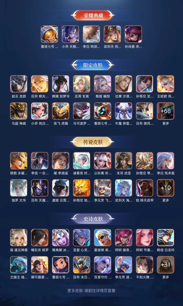 本游戏账号: V10用户,基础段位:尊贵铂金IV,英雄多,皮肤多。典藏皮肤5个,感受典藏皮肤带来的优质体验快感,FMVP皮肤5个,尽情享受FMVP皮肤带来的主角光环, 私人所属英雄皮肤有:孙尚香 杀手不太冷||鲁班七号 星空梦想||李白 鸣剑·曳影||武则天 倪克斯神谕||小乔 天鹅之梦铠 绛天战甲||孙尚香 末日机甲||狄仁杰 超时空战士||达摩 黄金狮子座||武则天 海洋之心||貂蝉 仲夏夜之梦||张良 黄金白羊座||孙悟空 地狱火||后羿 黄金射手座||李元芳 飞鸢探春,等等