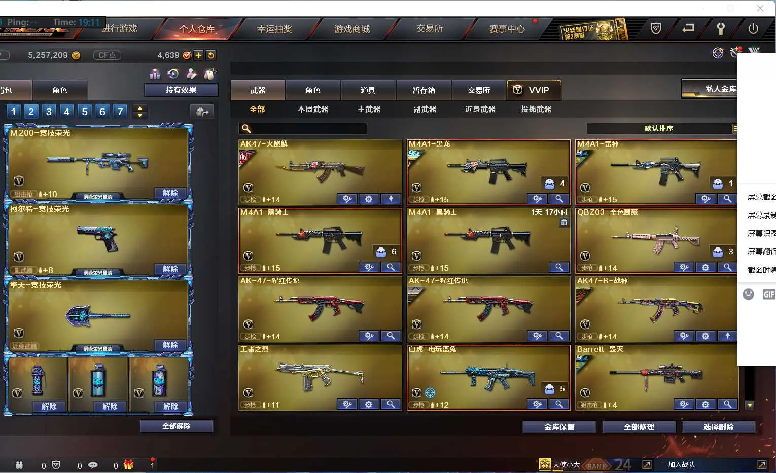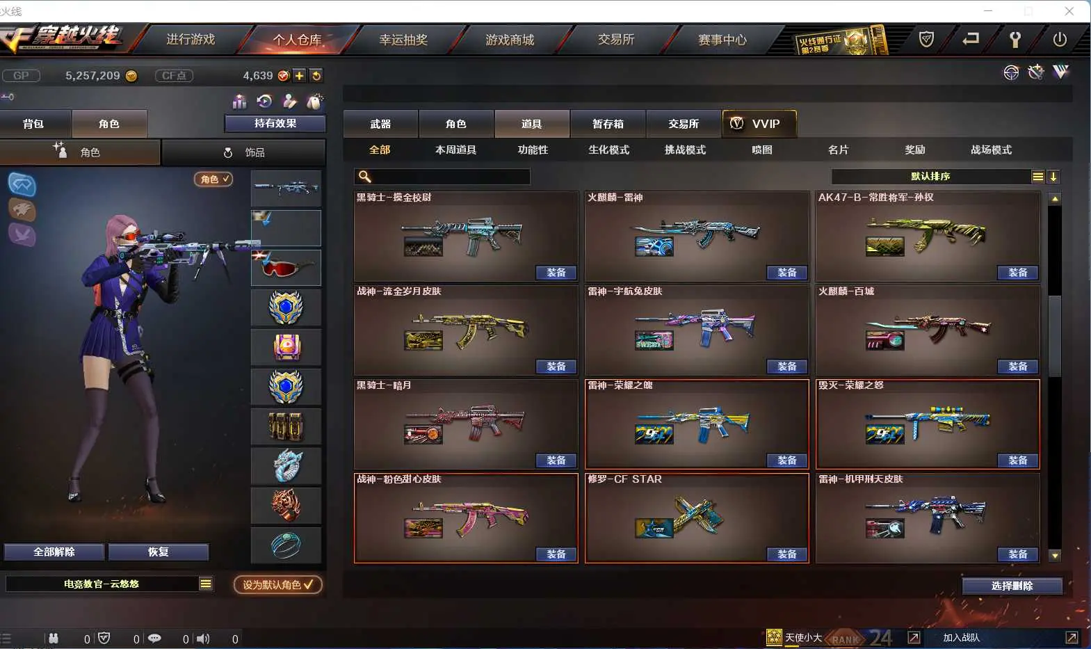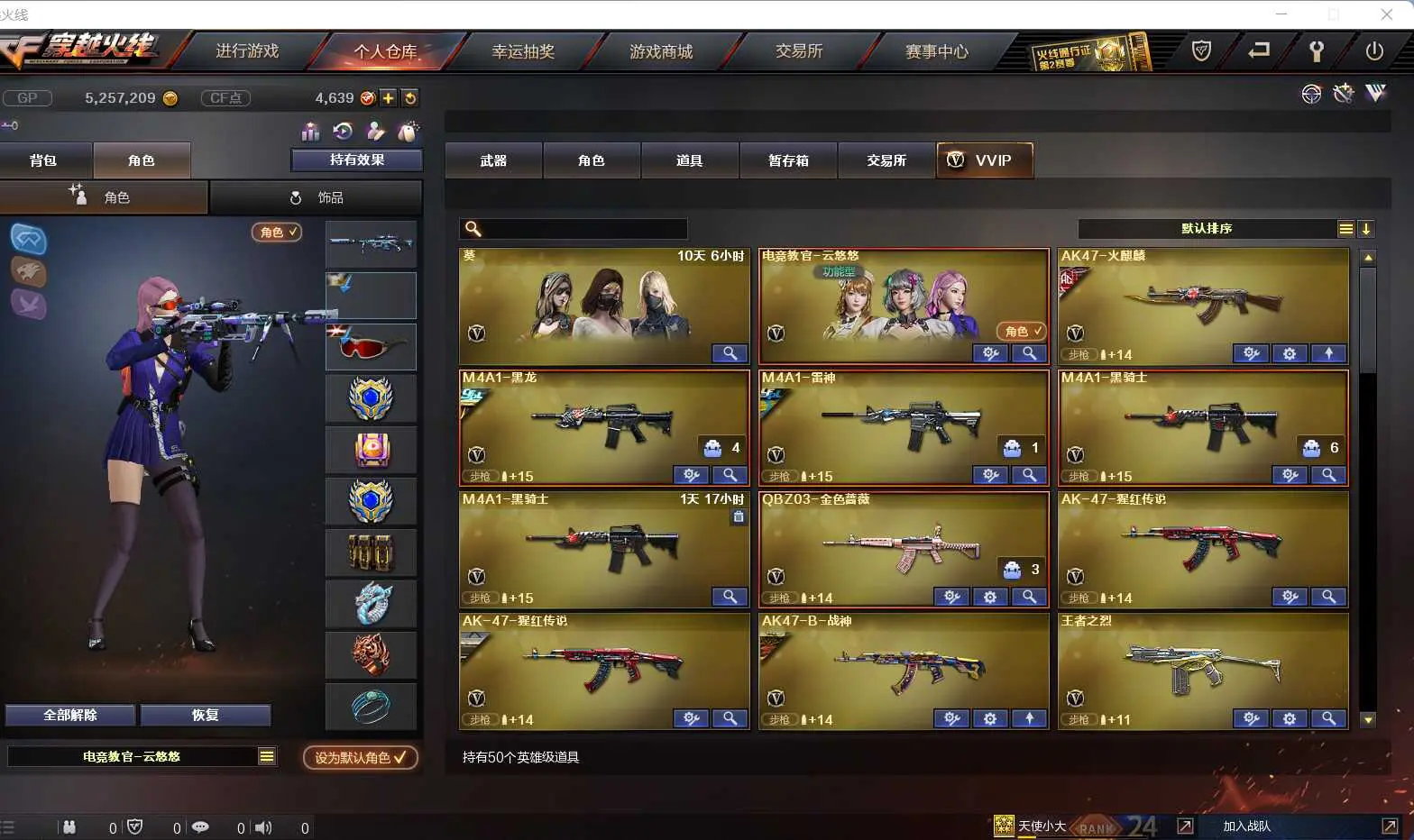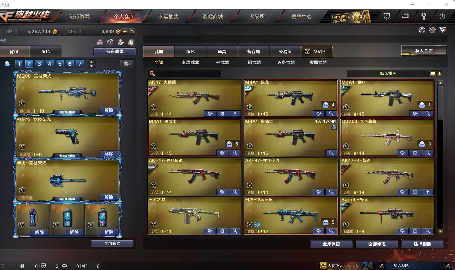 本游戏账号:英雄武器20个; 王者武器22个。 装备不多,但是主武器、副武器、近身武器够用 拥有完美游戏体验。重要的是,特殊装备有:AK47-火麒麟、加特林-炼狱、USP-雷暴、源·火麒麟、源·黑骑士、源·麒麟刺、堕天使、等,随意畅选。