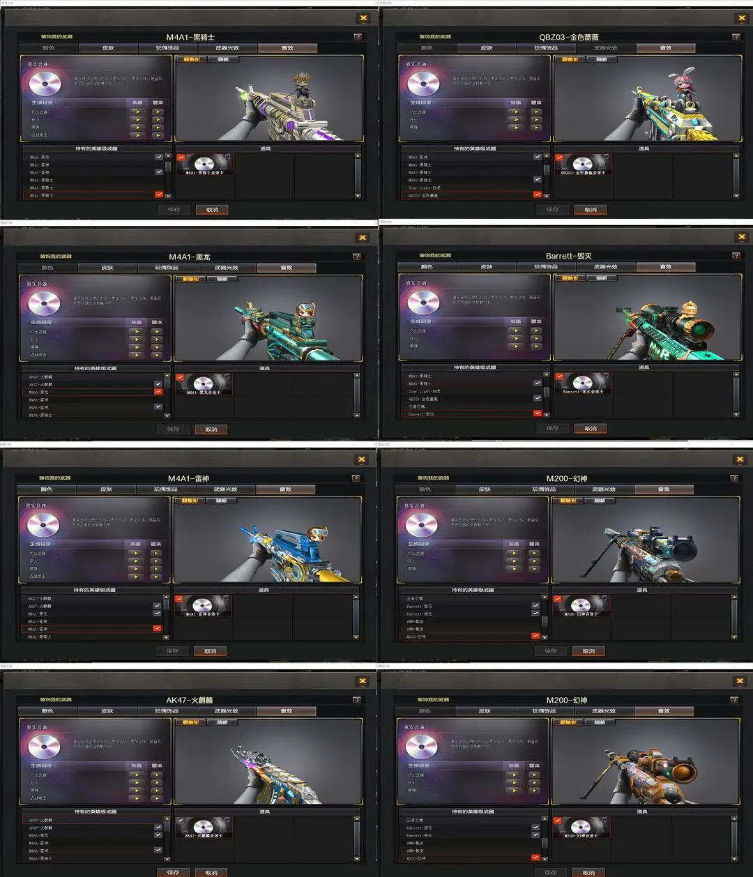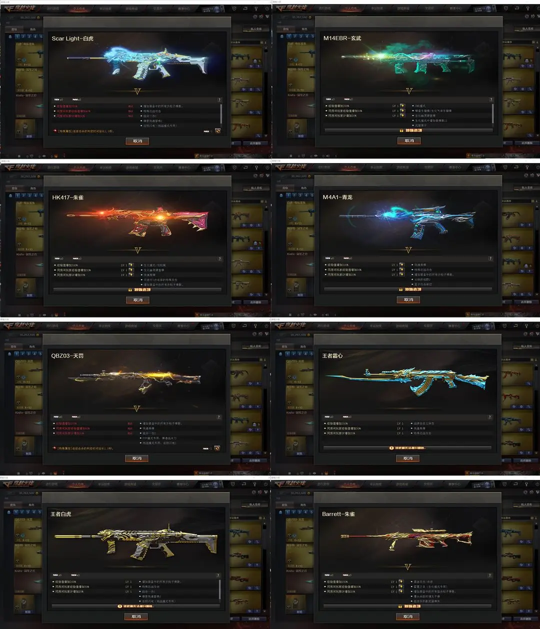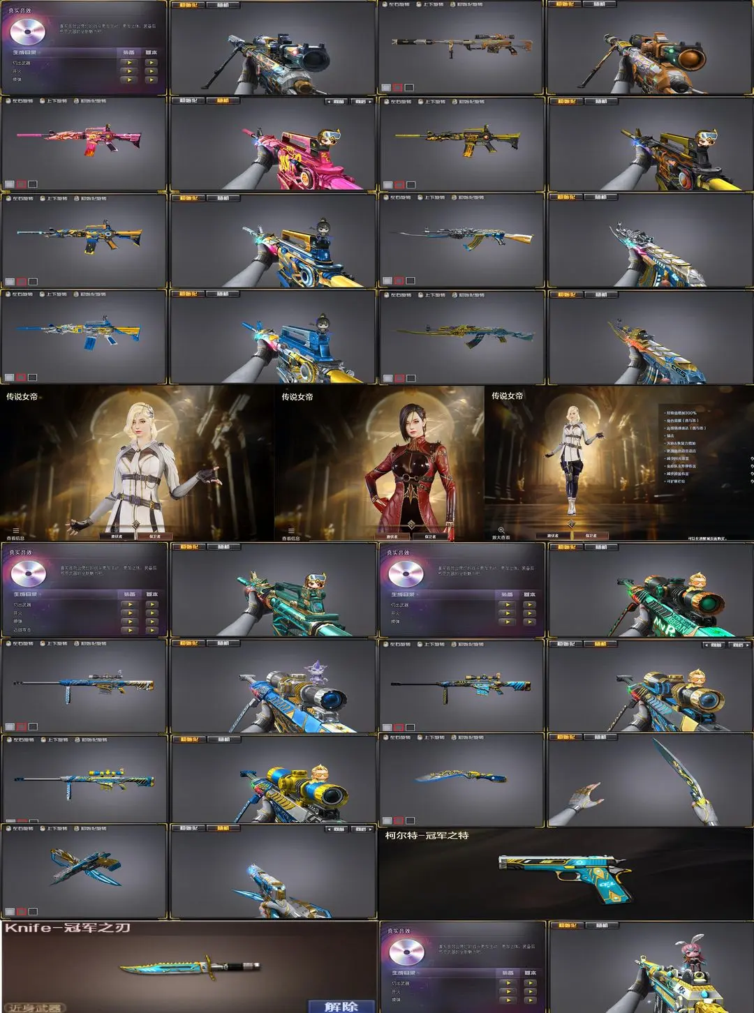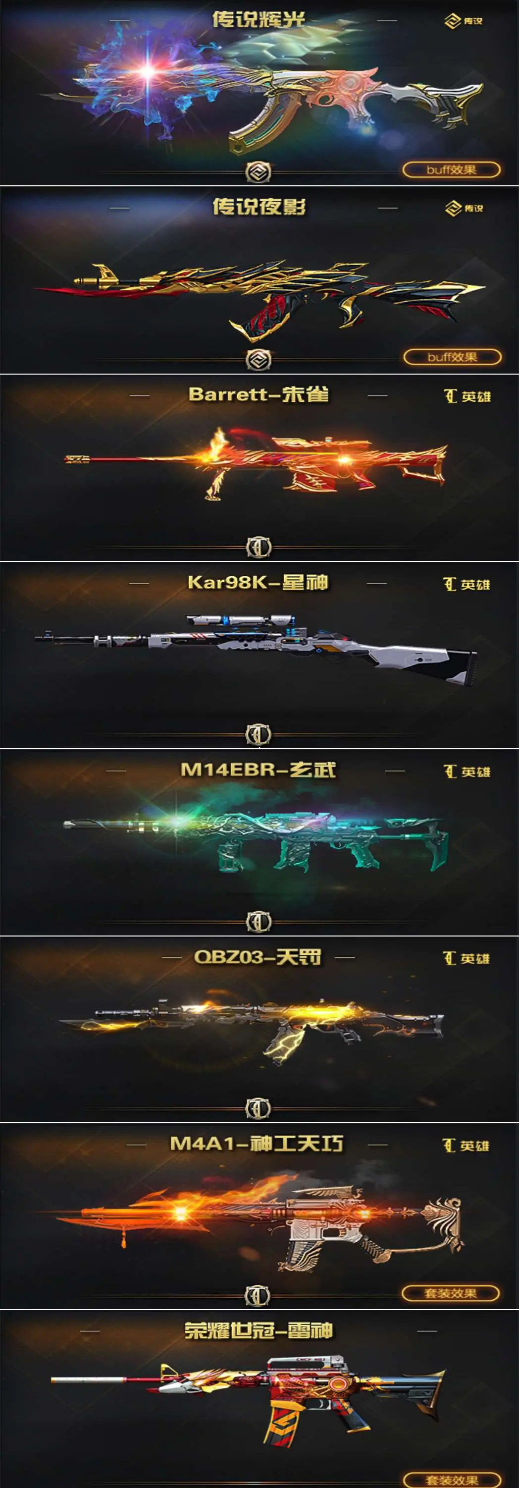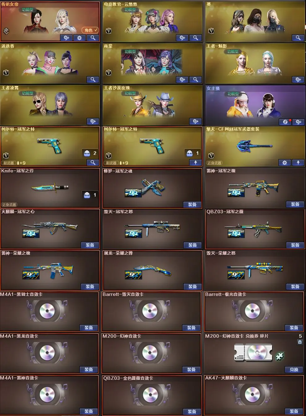 【装备道具】:[m200-幻神+幻神音效卡+幻神-周瑜★幻神黄忠、usp雷暴][传说女帝、传说辉光、98k星神、觉醒王者星神][m200-竞技荣光、柯尔特-竞技荣光、警天竞技荣光、竞技荣光套、云悠悠★scar白虎+玄武+hk417-朱雀+青龙、觉醒者白虎、电玩白虎][gbz天罚、qbz金色普薇★qbz音效卡+冠军之薇、冠军之特*2、冠军之刃][毁灭、毁灭音效卡、毁灭-荣耀之怒、毁灭-冠军之怒、毁灭-绿豆、毁灭-cfs2018、毁灭-张飞★雷神音效卡、雷神-宠儿、雷神-荣耀之魄、雷神-冠军之魄、雷神-cfs2019、雷神-赵云★火麒麟音效卡、火麒麟-冠军之心、火麒麟-轻羽、火麒麟-关羽★黑骑士、黑骑士音效辽宁卡、黑骑士-马超、黑骑士-地狱火、黑龙音效卡、极光音效卡][修罗-冠军之魂、居龙-荣耀之锋] 千变、无影、黑武士、天启、黑鲨、龙血、烈火、觉醒王者霜心、天龙、裁决、芭苗特朱雀、觉醒王者森决、炼狱、烈龙、修罗、天神、擎天、麒麟刺、王者风势、王者龙血、炼狱-迷你小钢、[角色]传说女帝、云悠悠、葵、迷选香、雨棠、王者魅影(四防)、王者凌霄、王者沙漠玫瑰★女主播传情小小语音包★职业选手