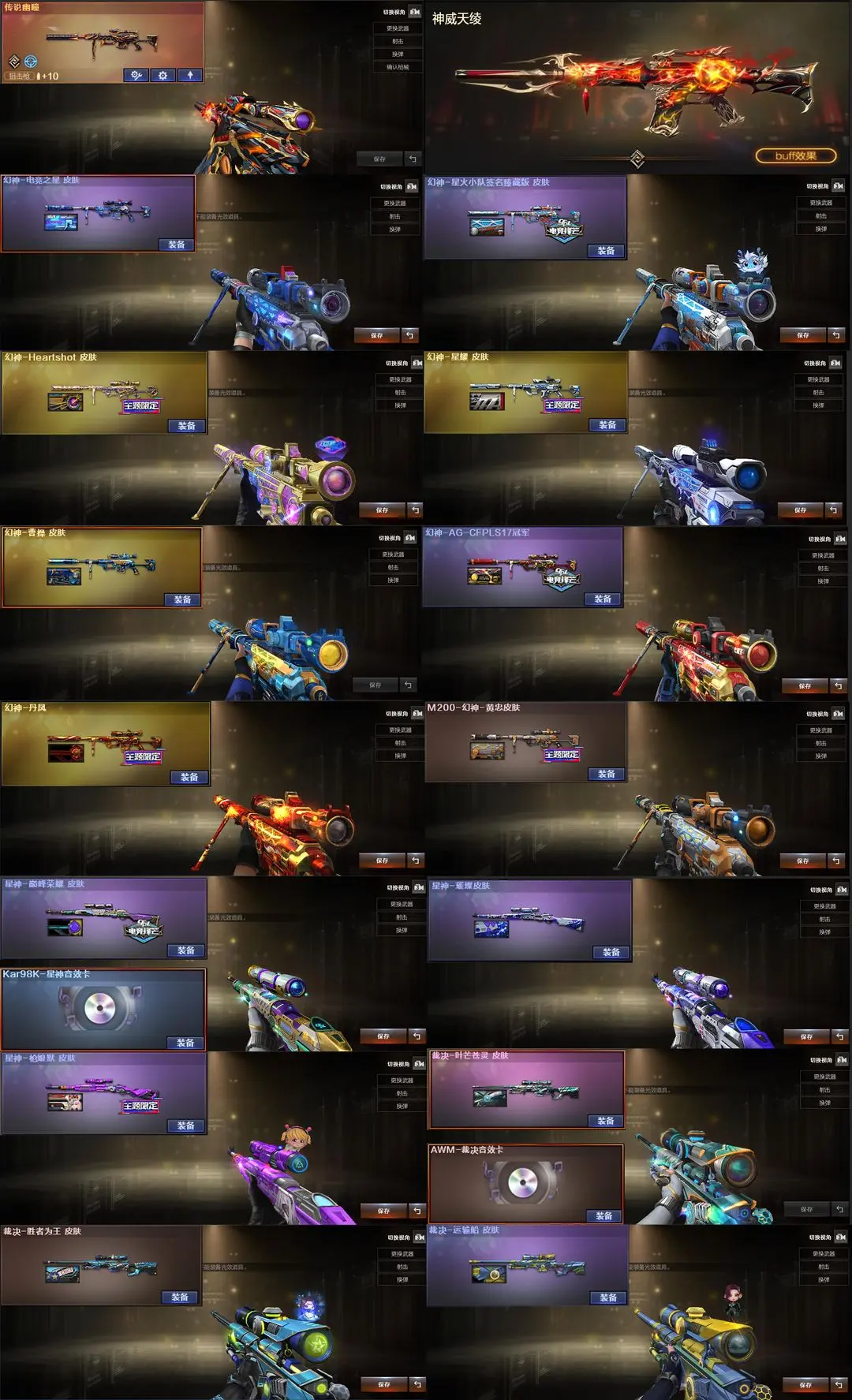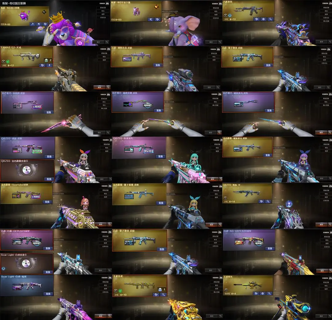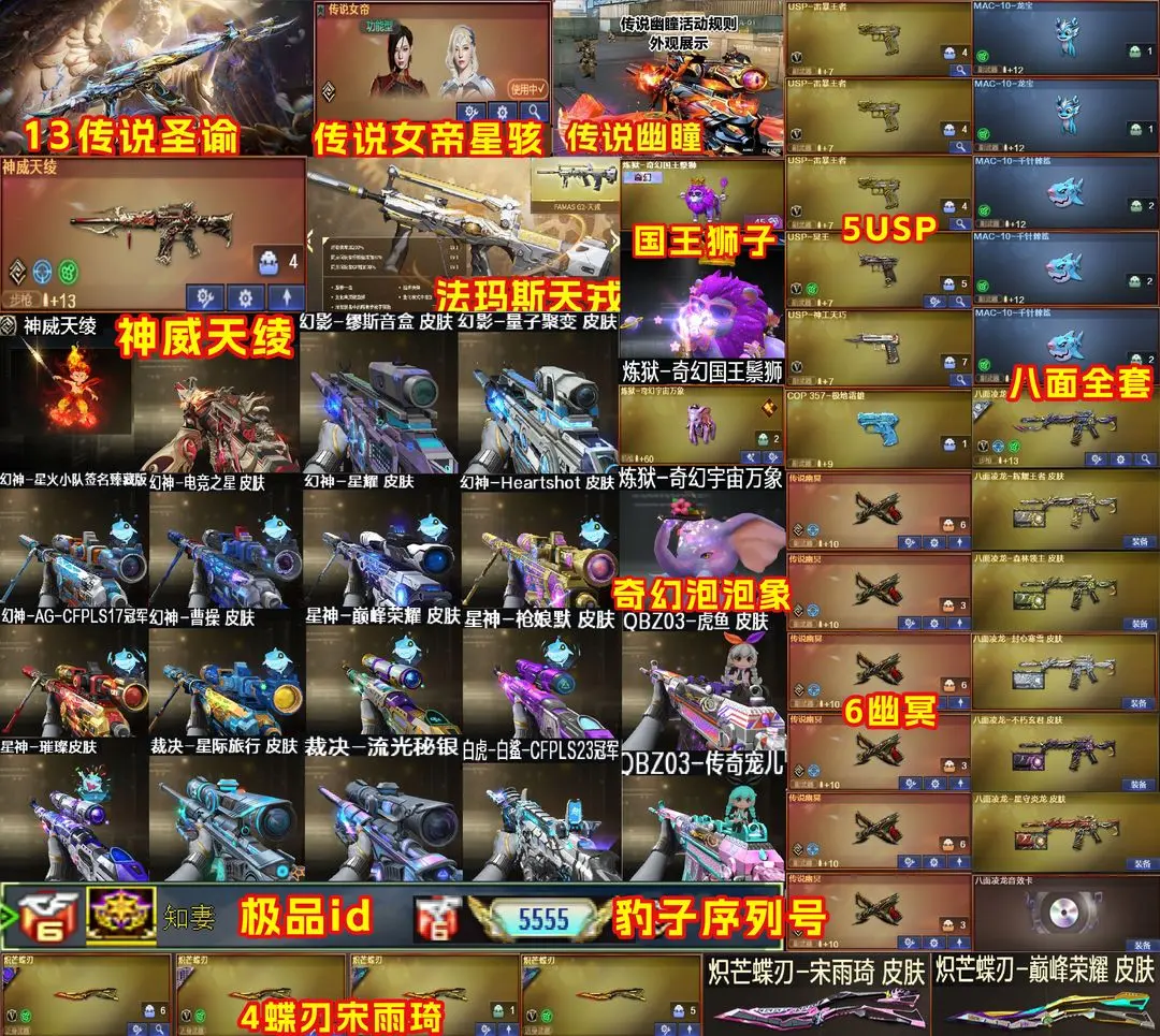 【装备道具】:传说女帝/传说星骇/神威天绫/传说圣谕/传说辉光/传说夜影/传说幽瞳/传说幽冥(6)★幻神-电竞之星/幻神-Heartshot/幻神-星火小队签名臻藏版/幻神-黄忠/幻神-AG-CFPLS17冠军/幻神-曹操/幻神-丹凤/幻神-星耀/星神-巅峰荣耀/星神-枪娘默/星神-璀璨/裁决-星际旅行/裁决-胜者为王/裁决-运输船/裁决-叶芒苍灵/裁决-流光秘银/火麒麟-巅峰荣耀/雷神-宋雨琦蝶刃巅峰荣耀/雷神-虎牙平台/缪斯音盒幻影-量子聚变/不朽玄君八面凌龙满配/破浪逐光金色蔷薇-量子蔷薇/金色蔷薇-Heartshot/白虎-量子聚变/白虎-白鲨皮肤/白虎-暗星/白虎-AG冠军/QBZ-虎鱼/QBZ-传奇宠儿★M4A1-奇幻占星神龙/炼狱-奇幻宇宙万象/炼狱-迷你小钢/炼狱-奇幻国王鬃狮/异变清道夫-蛇影双骄/斯泰尔-枪娘暗刃/斯泰尔-蝴蝶/MAC-10-龙宝/MAC-千针棘鲨/幼崽虎★竞技荣光套装/雷暴套装★王者云悠悠/王者晴雅/晴雅/隼/机械姬/雨墨/鹰/电竞教官-云悠悠/月兔特工/关小雨/王者玄武/王者雷影/王者风武/王者星光/USP-雷暴王者/王者破空枪刃/独角之刃