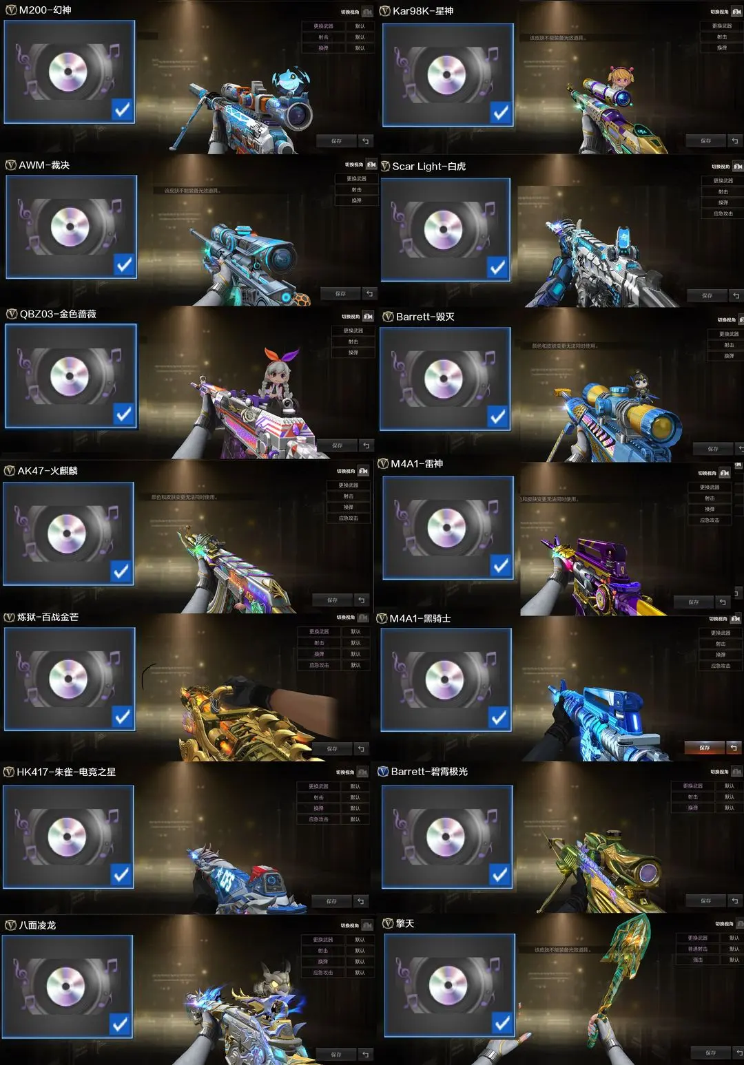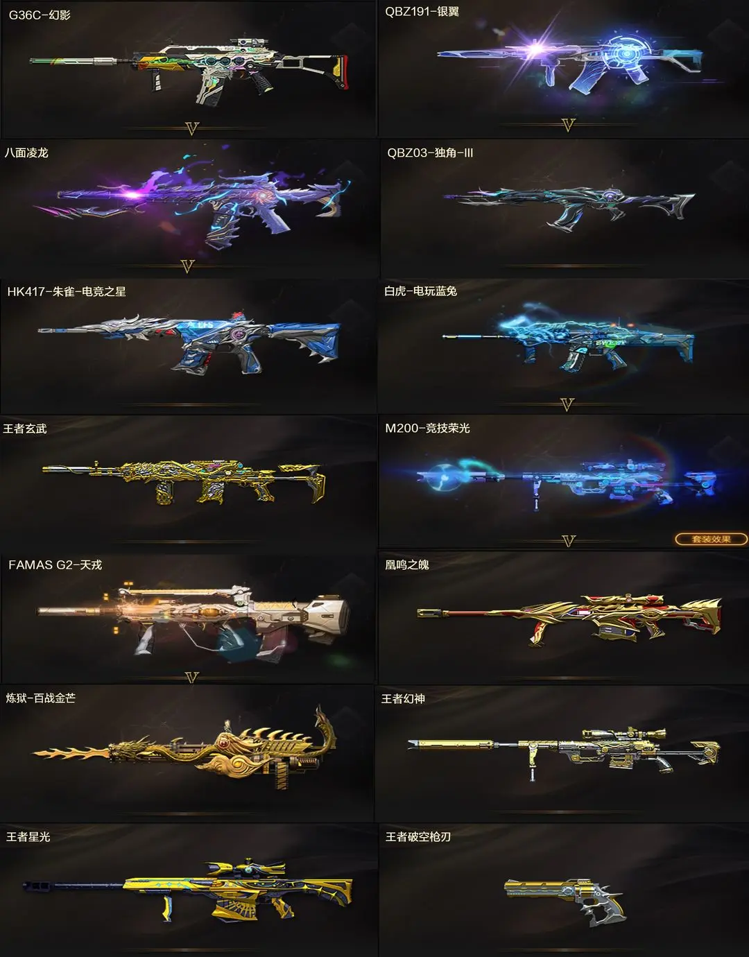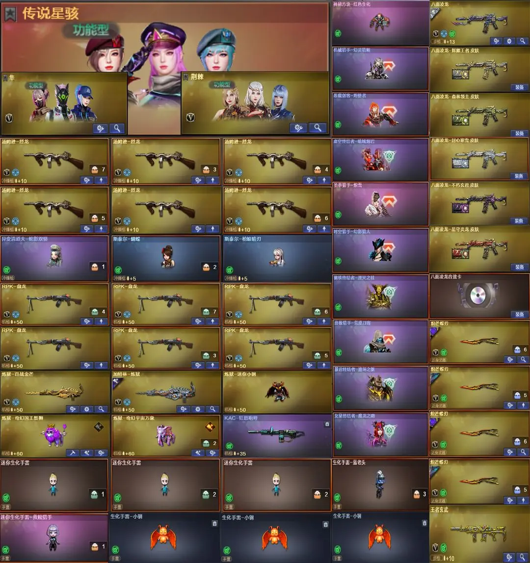 【装备道具】:传说女帝/传说星骇/神威天绫/传说圣谕/传说辉光/传说夜影/传说幽瞳/传说幽冥(6)★幻神-电竞之星/幻神-Heartshot/幻神-星火小队签名臻藏版/幻神-黄忠/幻神-AG-CFPLS17冠军/幻神-曹操/幻神-丹凤/幻神-星耀/星神-巅峰荣耀/星神-枪娘默/星神-璀璨/裁决-星际旅行/裁决-胜者为王/裁决-运输船/裁决-叶芒苍灵/裁决-流光秘银/火麒麟-巅峰荣耀/雷神-宋雨琦蝶刃巅峰荣耀/雷神-虎牙平台/缪斯音盒幻影-量子聚变/不朽玄君八面凌龙满配/破浪逐光金色蔷薇-量子蔷薇/金色蔷薇-Heartshot/白虎-量子聚变/白虎-白鲨皮肤/白虎-暗星/白虎-AG冠军/QBZ-虎鱼/QBZ-传奇宠儿★M4A1-奇幻占星神龙/炼狱-奇幻宇宙万象/炼狱-迷你小钢/炼狱-奇幻国王鬃狮/异变清道夫-蛇影双骄/斯泰尔-枪娘暗刃/斯泰尔-蝴蝶/MAC-10-龙宝/MAC-千针棘鲨/幼崽虎★竞技荣光套装/雷暴套装★王者云悠悠/王者晴雅/晴雅/隼/机械姬/雨墨/鹰/电竞教官-云悠悠/月兔特工/关小雨/王者玄武/王者雷影/王者风武/王者星光/USP-雷暴王者/王者破空枪刃/独角之刃