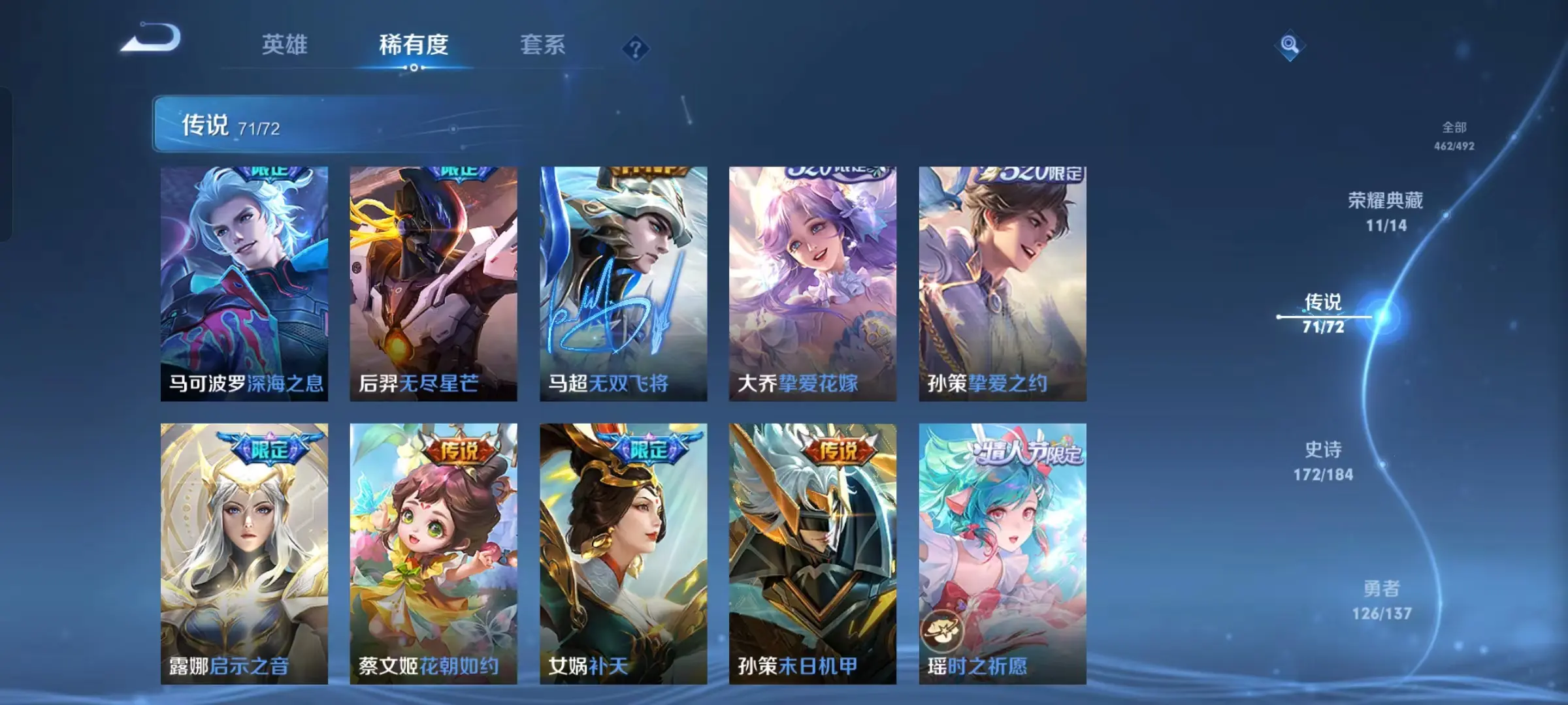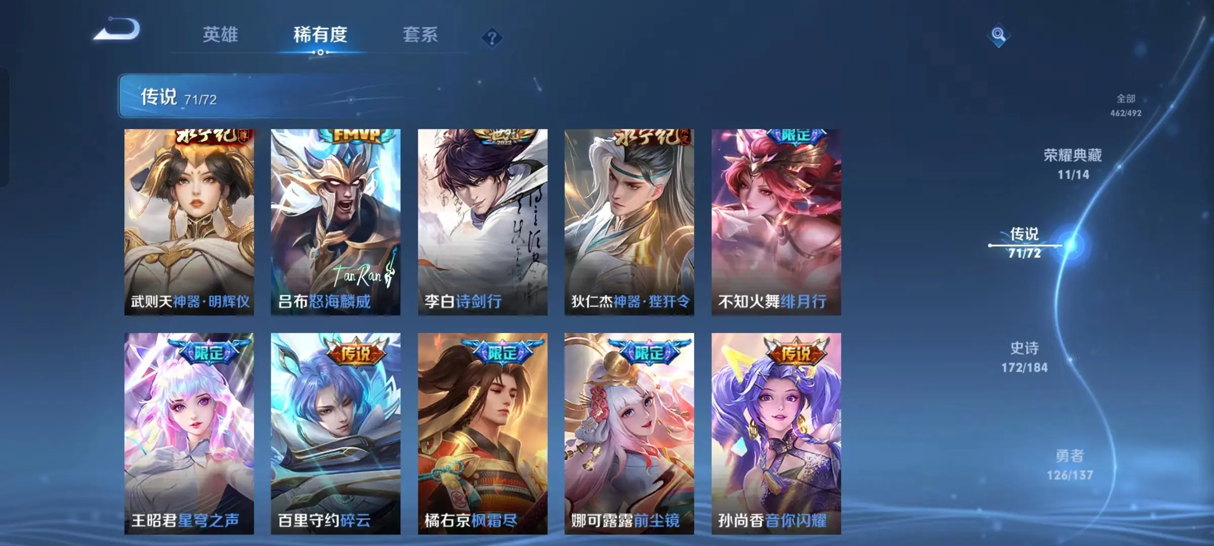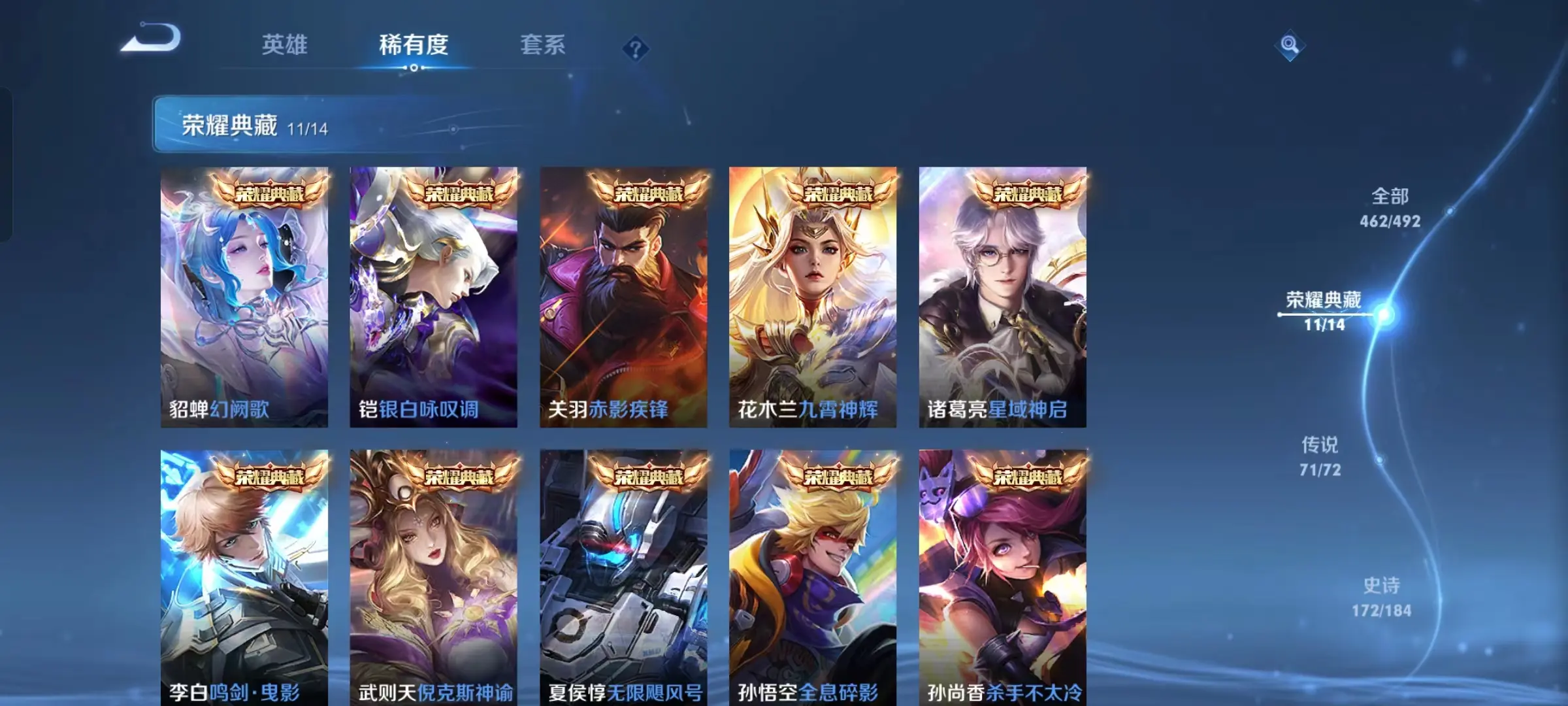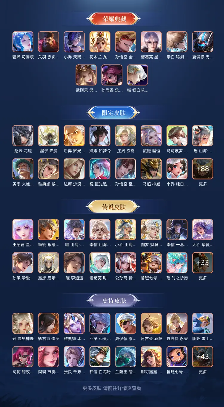 本游戏账号: V10用户,基础段位:最强王者,英雄多,皮肤多。典藏皮肤9个,感受典藏皮肤带来的优质体验快感,FMVP皮肤8个,尽情享受FMVP皮肤带来的主角光环, 私人所属英雄皮肤有:诸葛亮 星域神启||孙尚香 杀手不太冷||夏侯惇 无限飓风号||李白 鸣剑·曳影||武则天 倪克斯神谕||貂蝉 幻阙歌||花木兰 九霄神辉||孙悟空 全息碎影||小乔 天鹅之梦,等等
